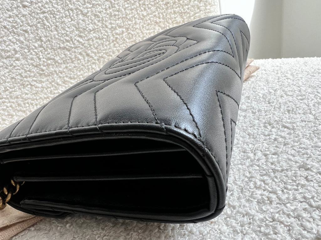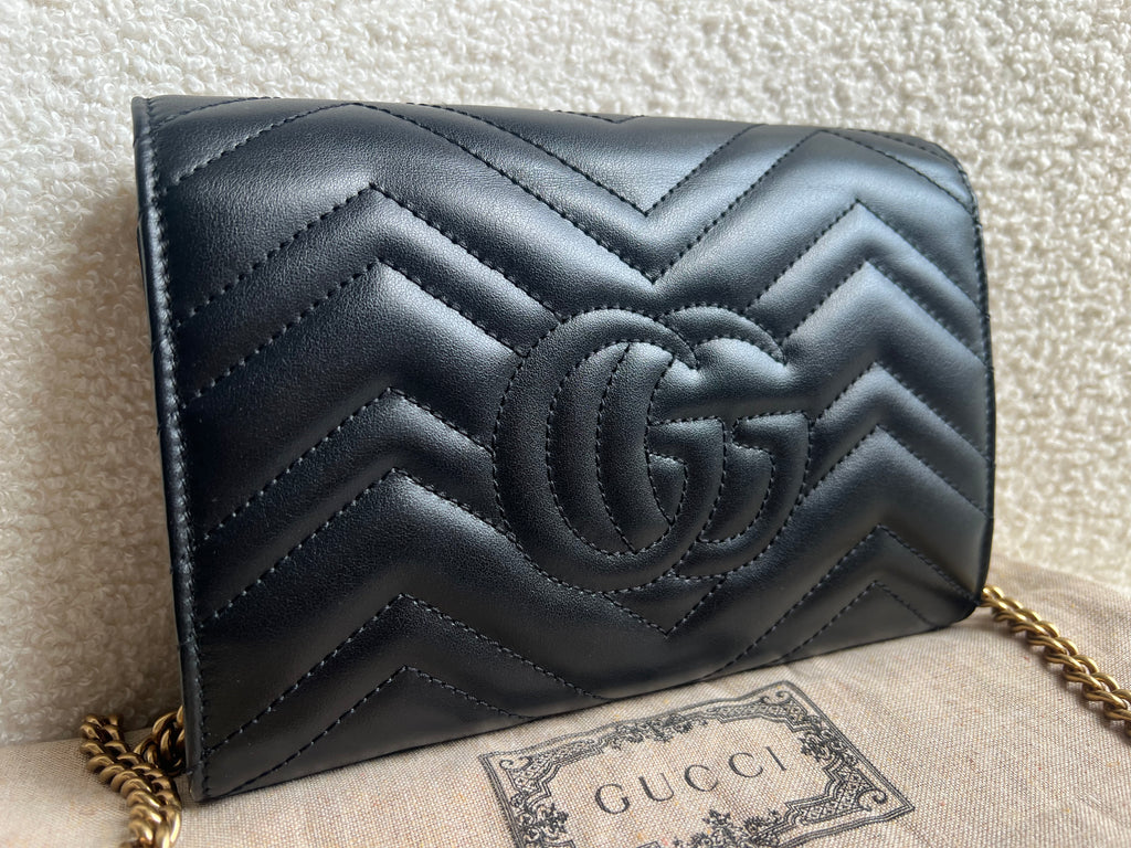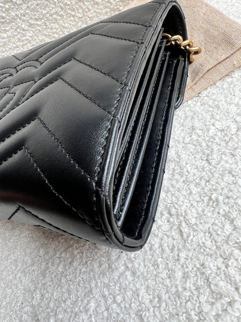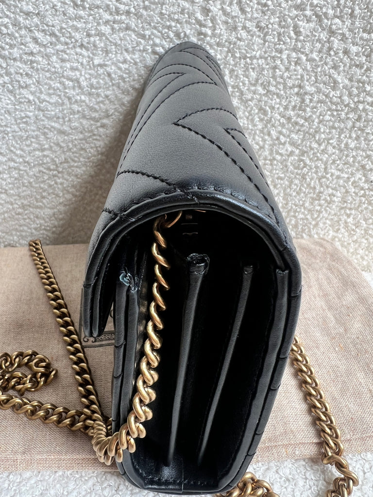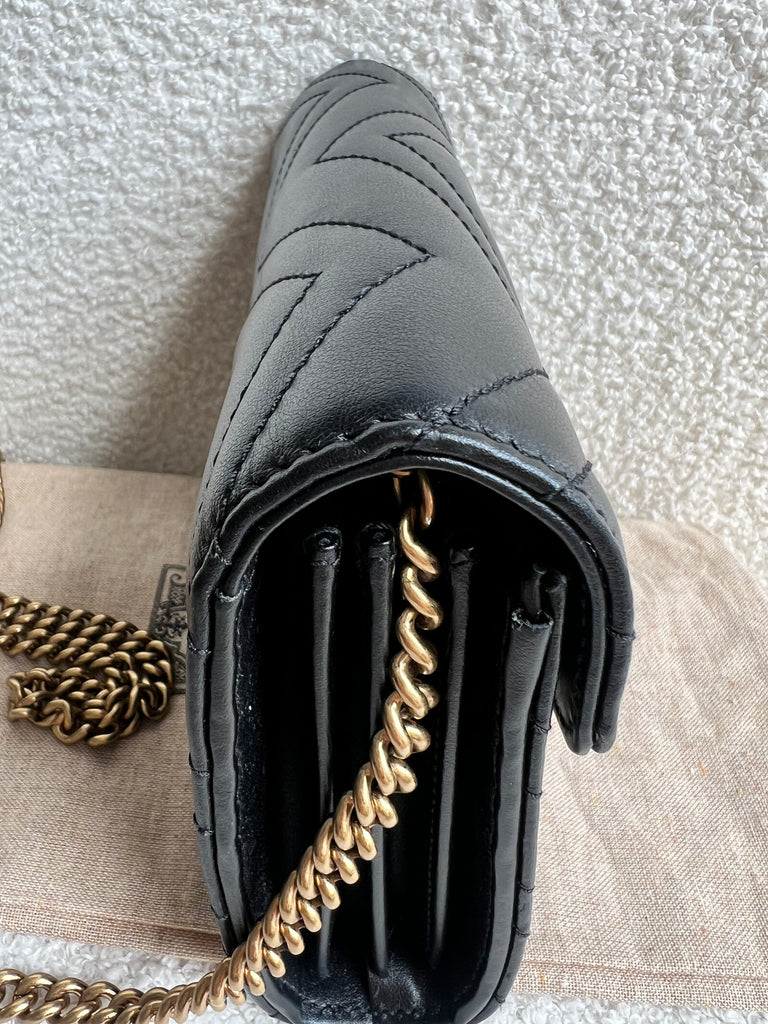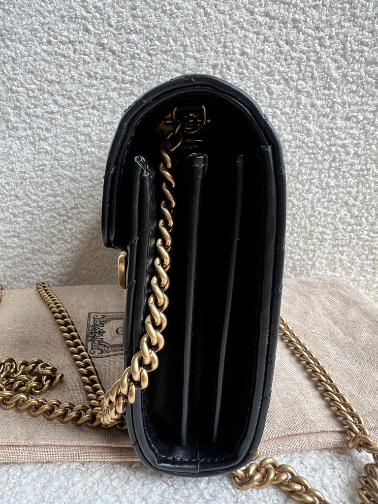 Gucci GG Marmont Matelasse Mini in black matelasse chevron leather with antique gold hardware. This classic wallet on chain is the perfect addition to an outfit for evening or event wear. The chain is detachable so can be worn cross body or used as a hand held clutch. Featuring GG hardware and flap and press stud closure, there is a zipped section inside and plenty of card slots.