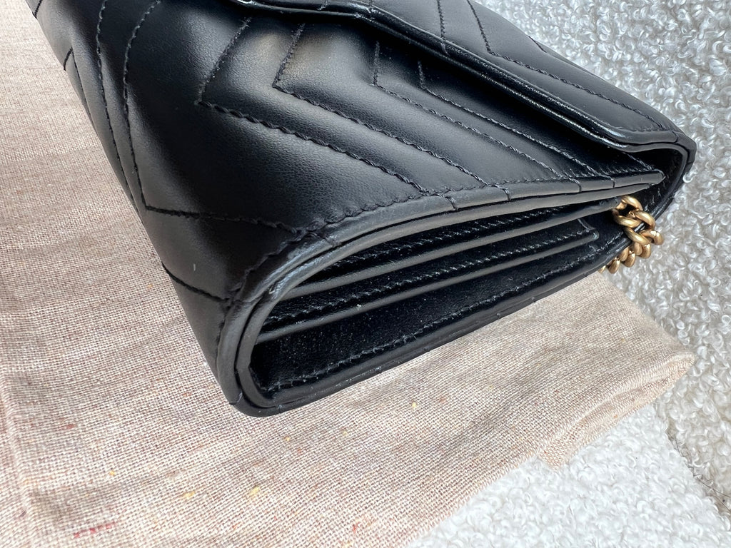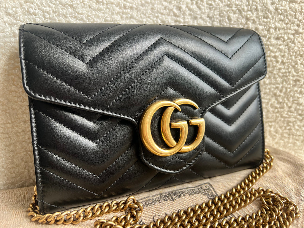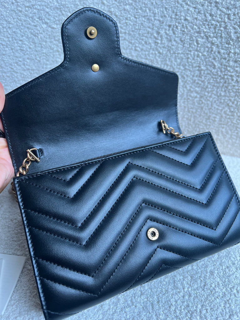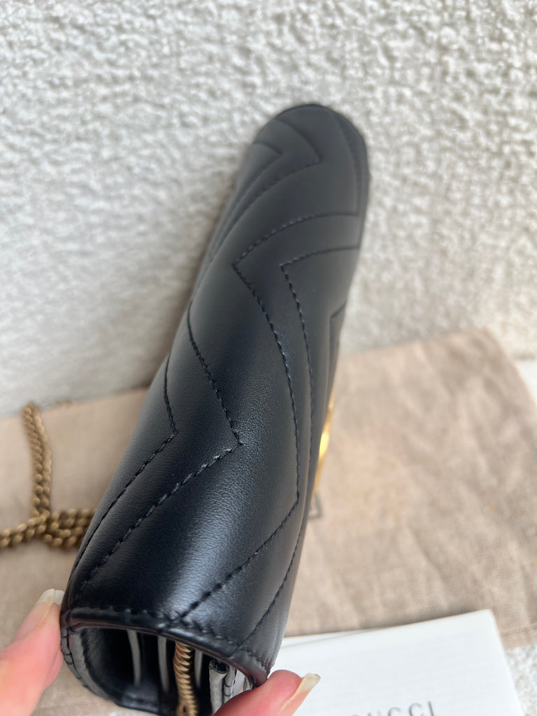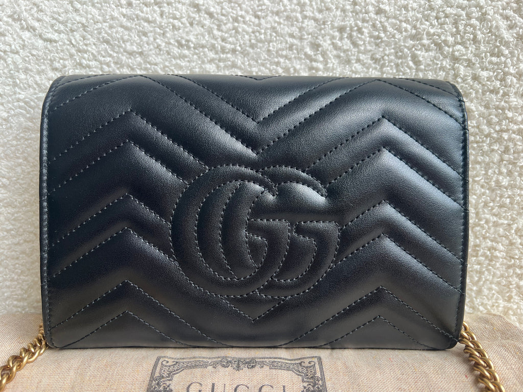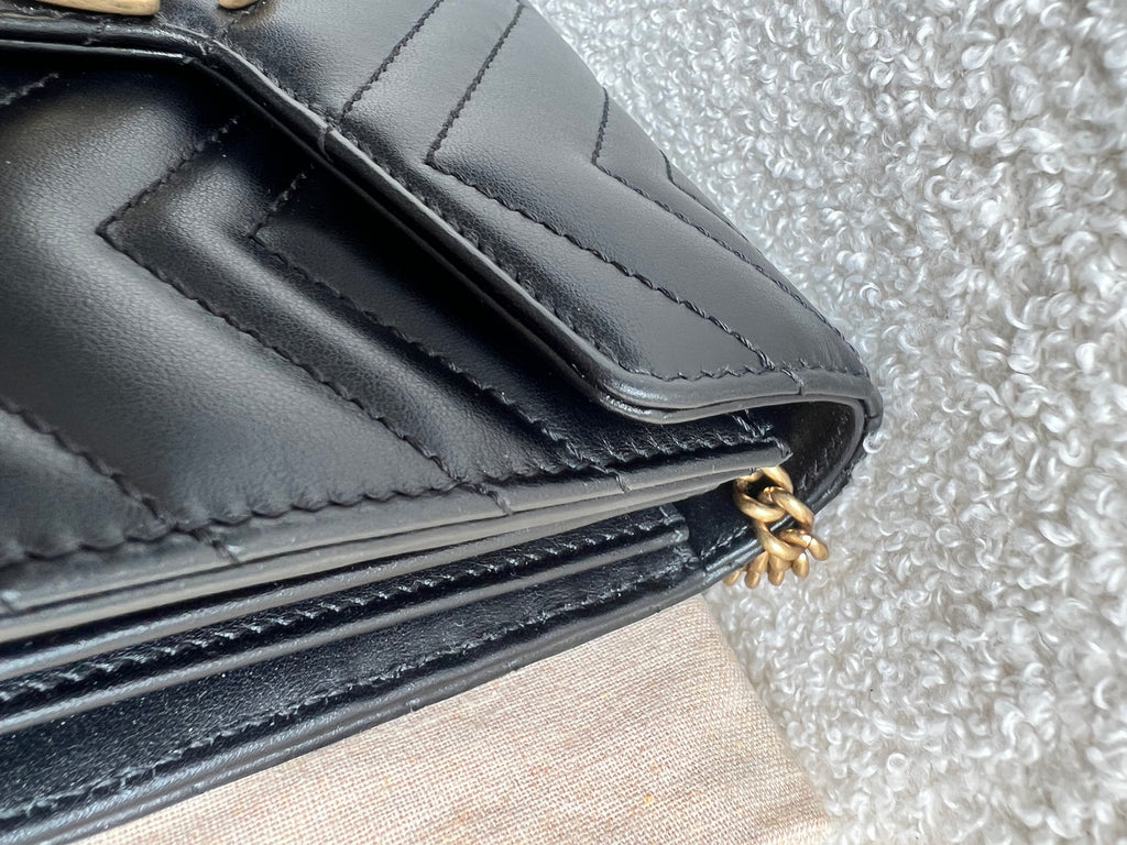 Gucci GG Marmont Matelasse Mini in black matelasse chevron leather with antique gold hardware. This classic wallet on chain is the perfect addition to an outfit for evening or event wear. The chain is detachable so can be worn cross body or used as a hand held clutch. Featuring GG hardware and flap and press stud closure, there is a zipped section inside and plenty of card slots.