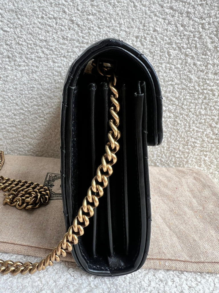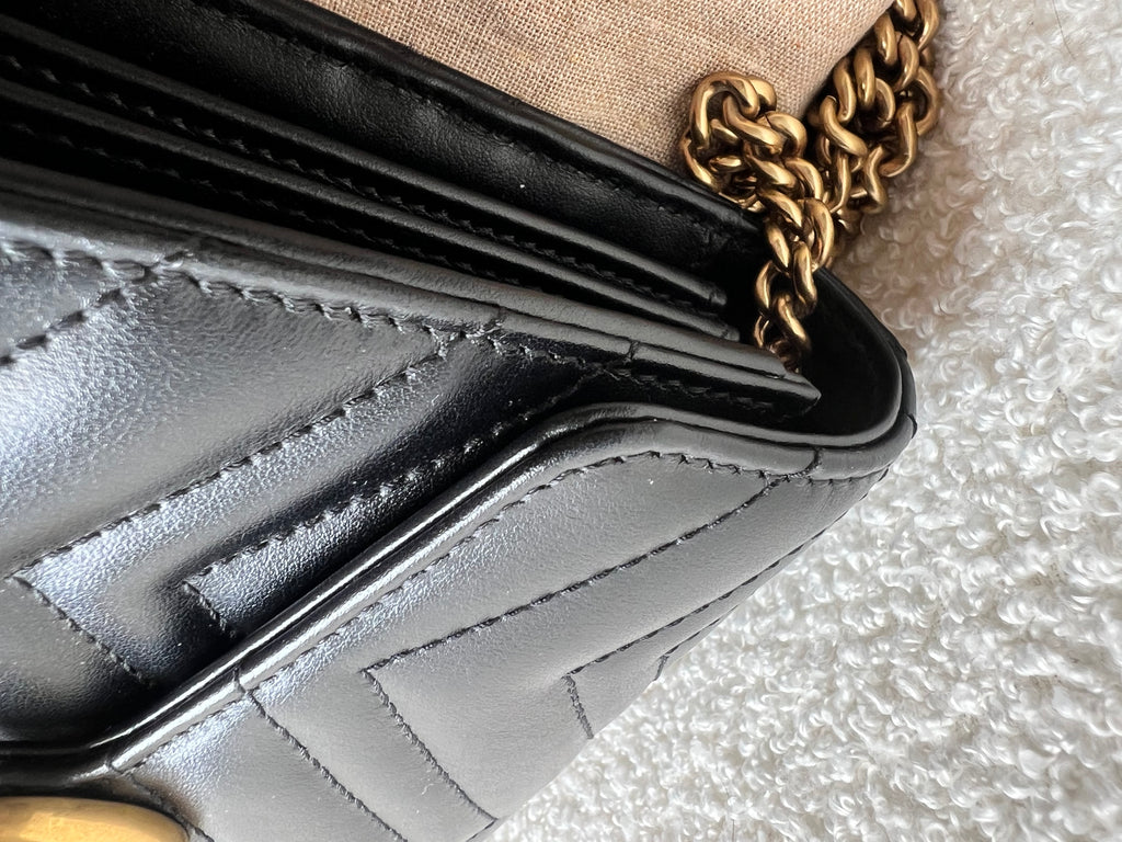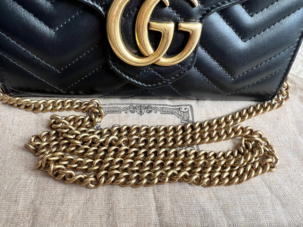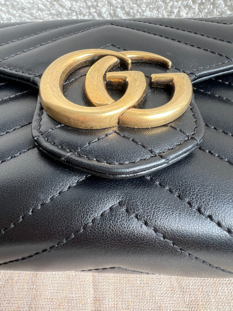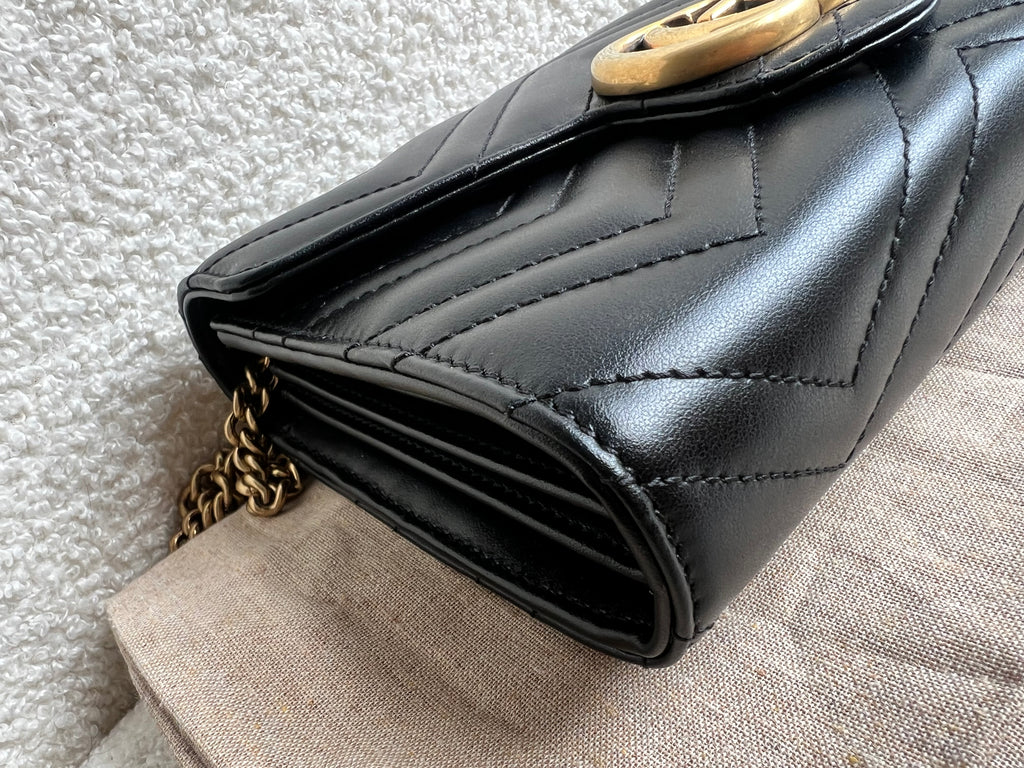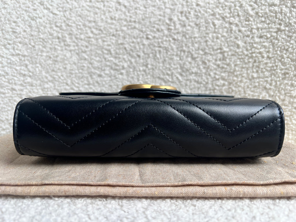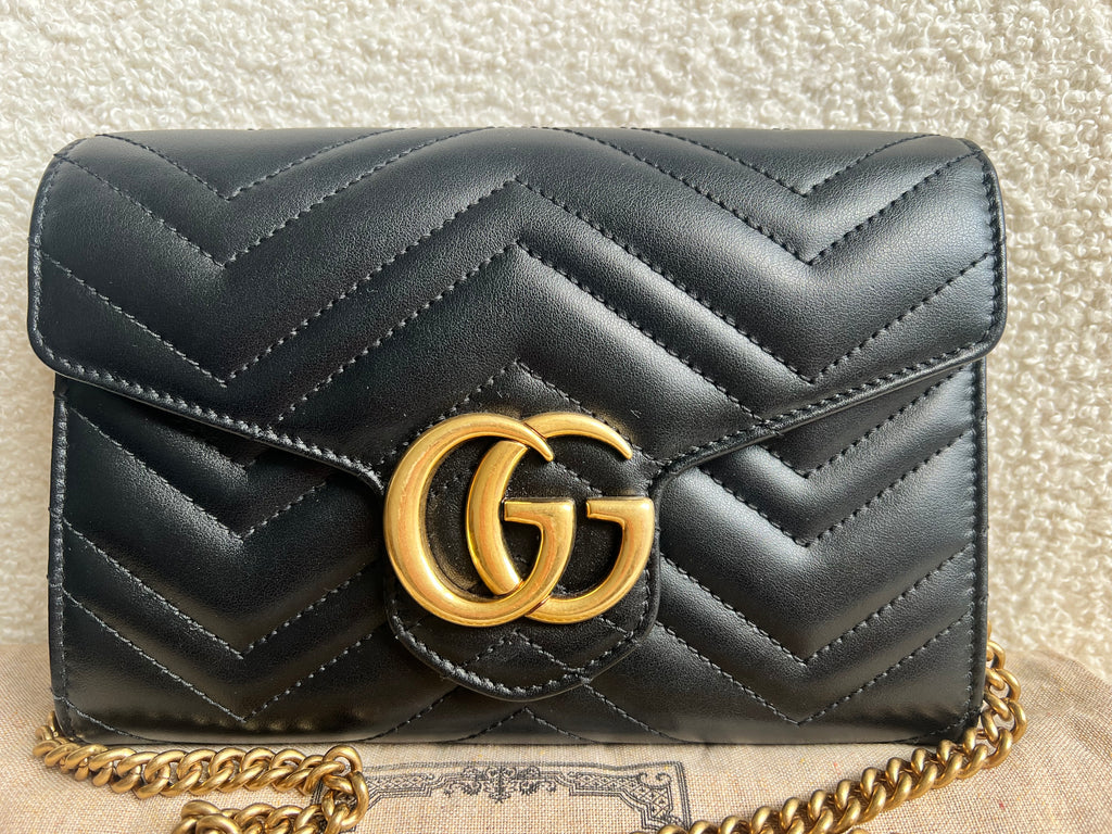 Gucci GG Marmont Matelasse Mini in black matelasse chevron leather with antique gold hardware. This classic wallet on chain is the perfect addition to an outfit for evening or event wear. The chain is detachable so can be worn cross body or used as a hand held clutch. Featuring GG hardware and flap and press stud closure, there is a zipped section inside and plenty of card slots.