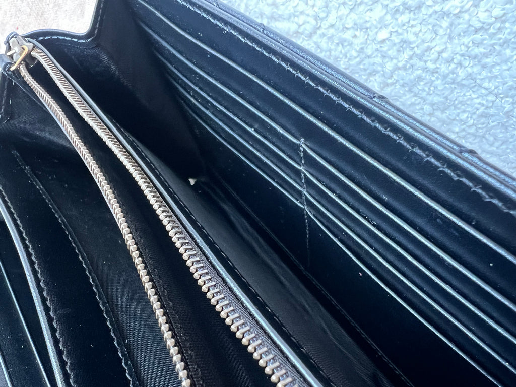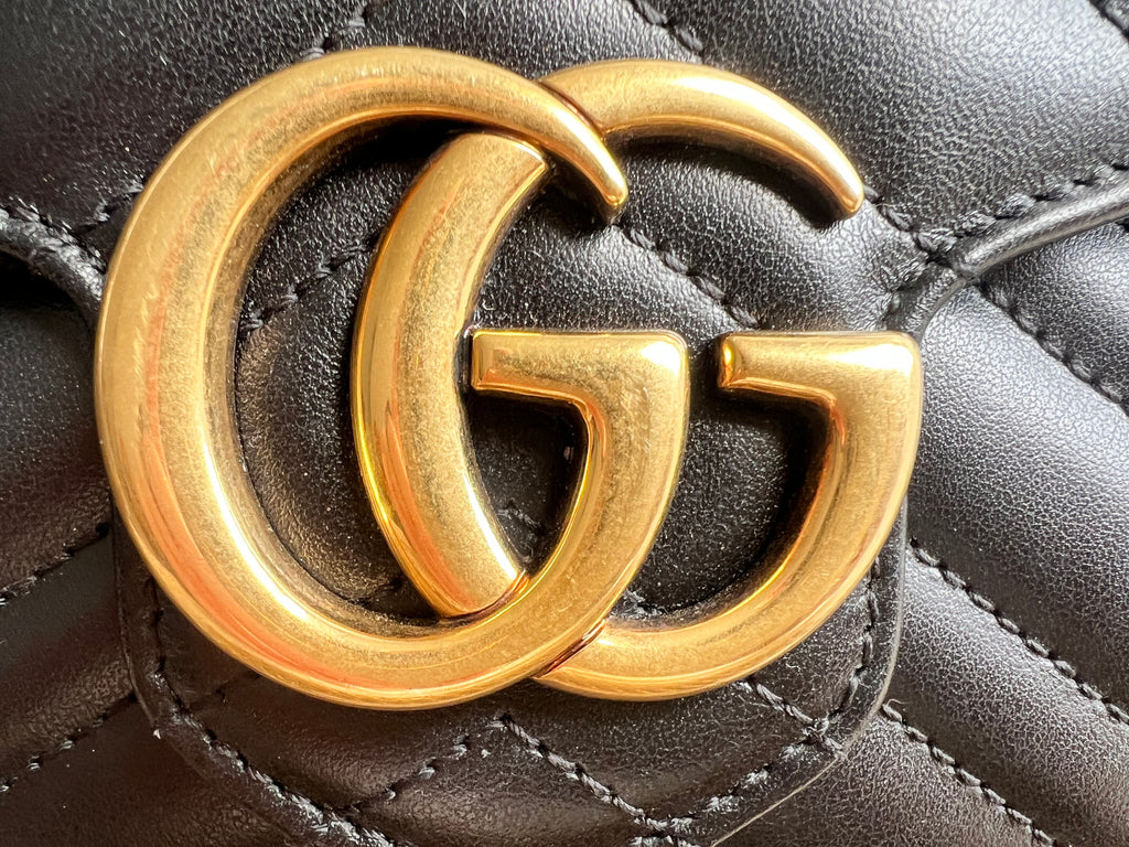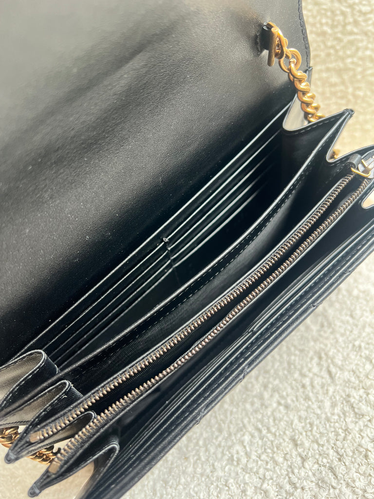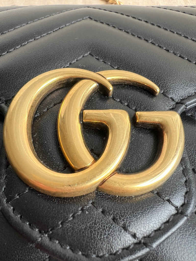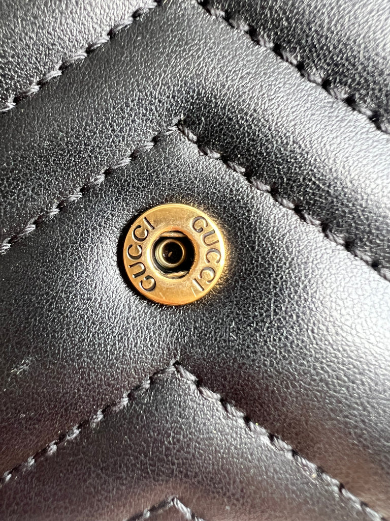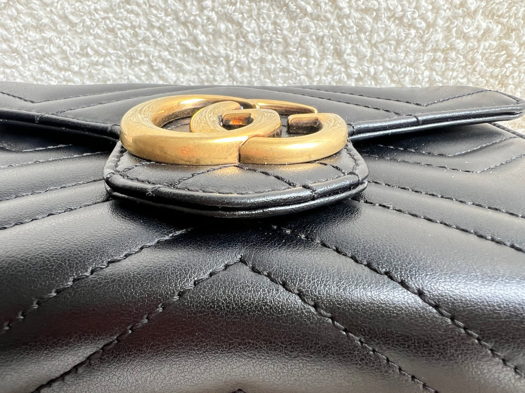 Gucci GG Marmont Matelasse Mini in black matelasse chevron leather with antique gold hardware. This classic wallet on chain is the perfect addition to an outfit for evening or event wear. The chain is detachable so can be worn cross body or used as a hand held clutch. Featuring GG hardware and flap and press stud closure, there is a zipped section inside and plenty of card slots.