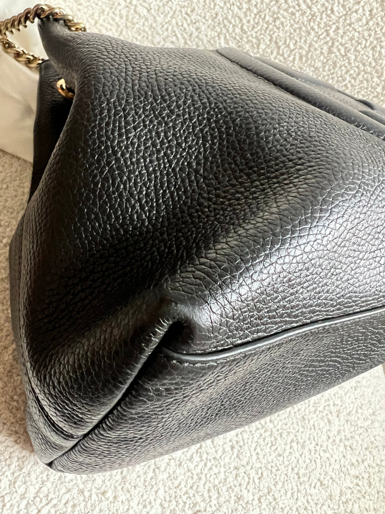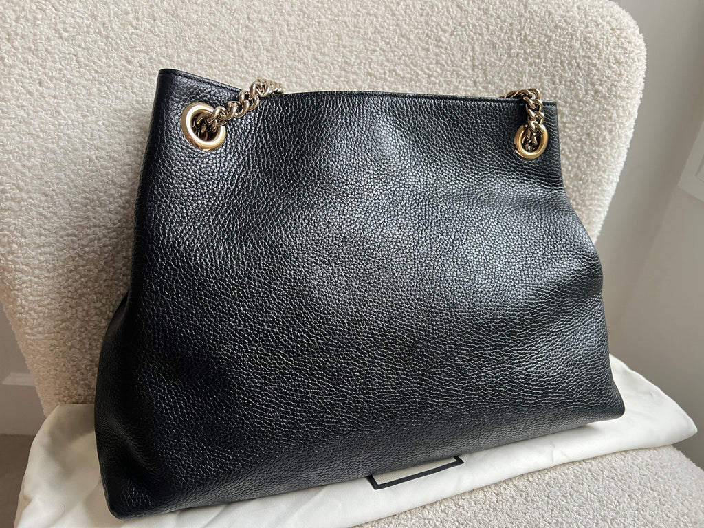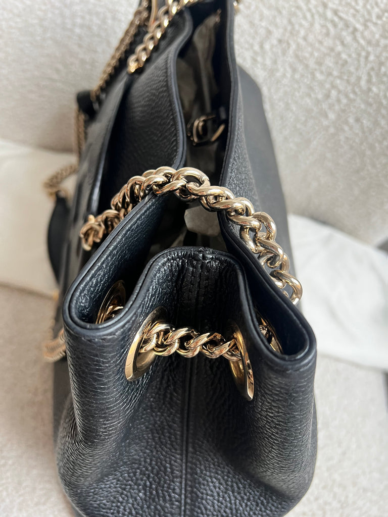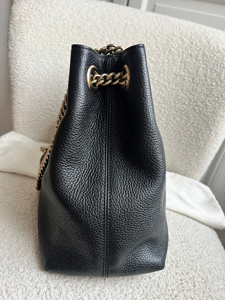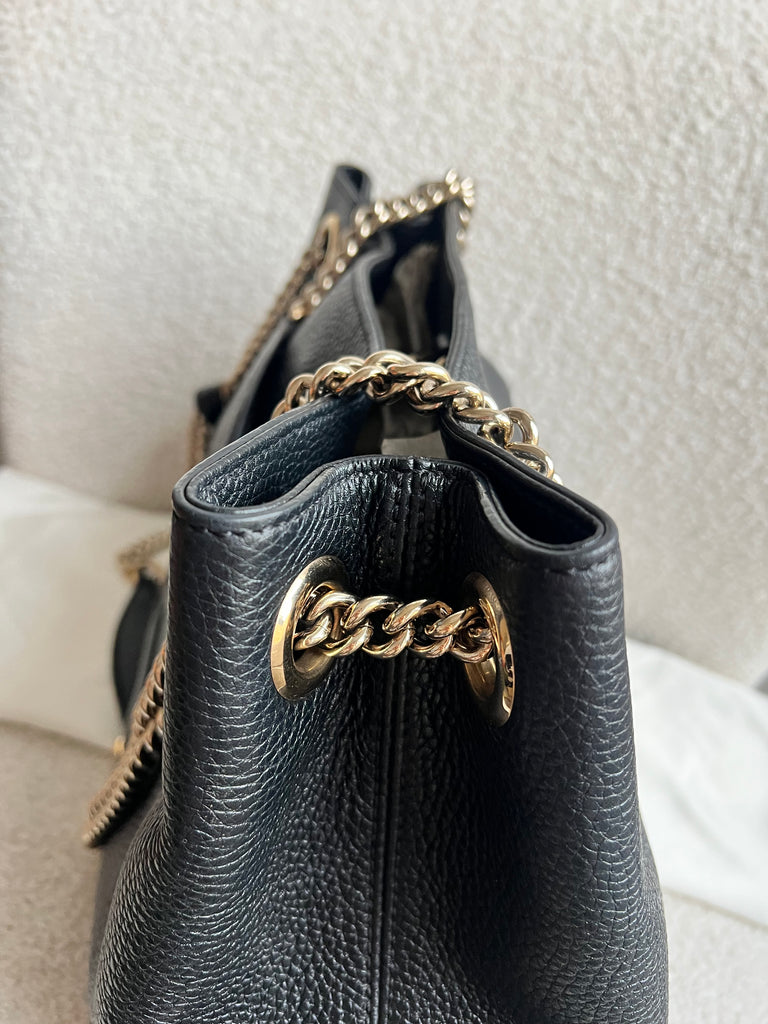 Gucci Soho Chain Tote in Black Grained Leather with pale gold hardware. This roomy tote features chain straps with leather sections and is ideal for day to day use. Can fit comfortably over the shoulder or can be carried in the crook of the arm. Roomy in size and somewhat slouchy in shape.