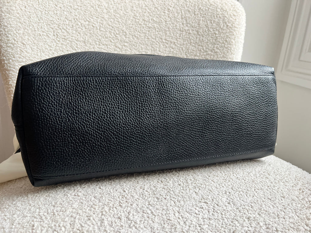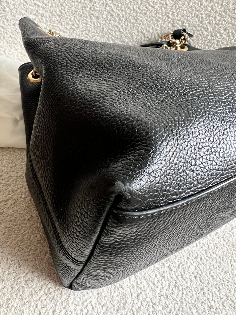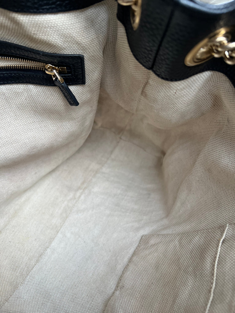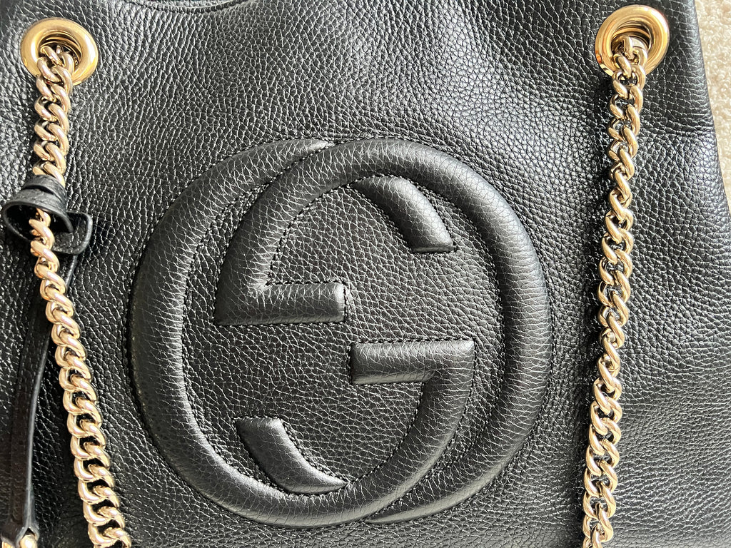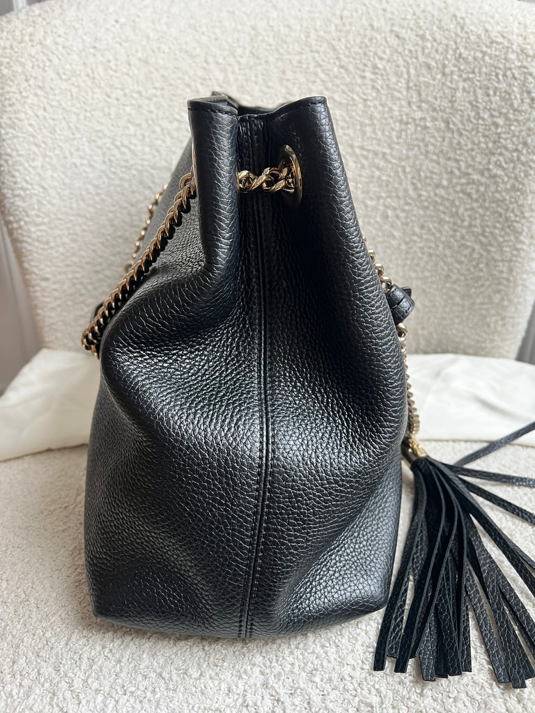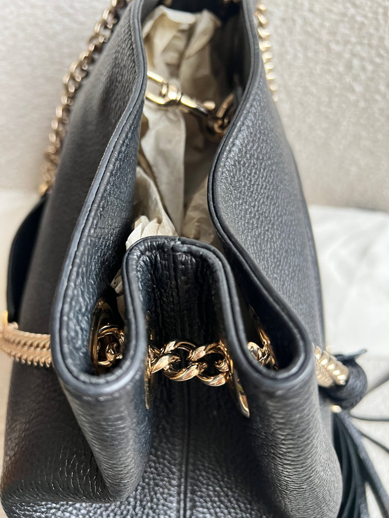 Gucci Soho Chain Tote in Black Grained Leather with pale gold hardware. This roomy tote features chain straps with leather sections and is ideal for day to day use. Can fit comfortably over the shoulder or can be carried in the crook of the arm. Roomy in size and somewhat slouchy in shape.