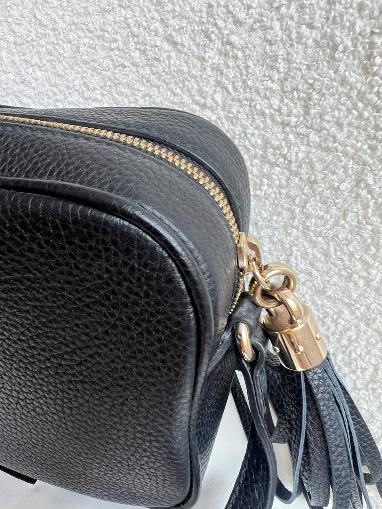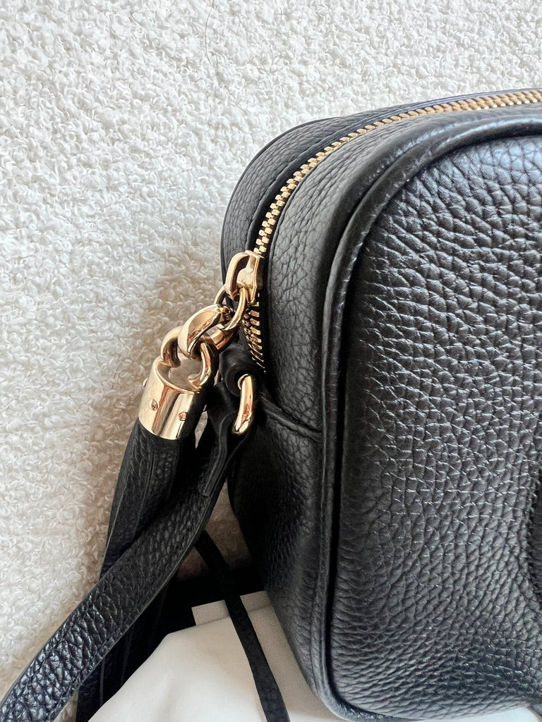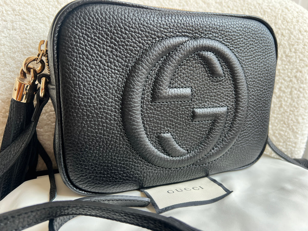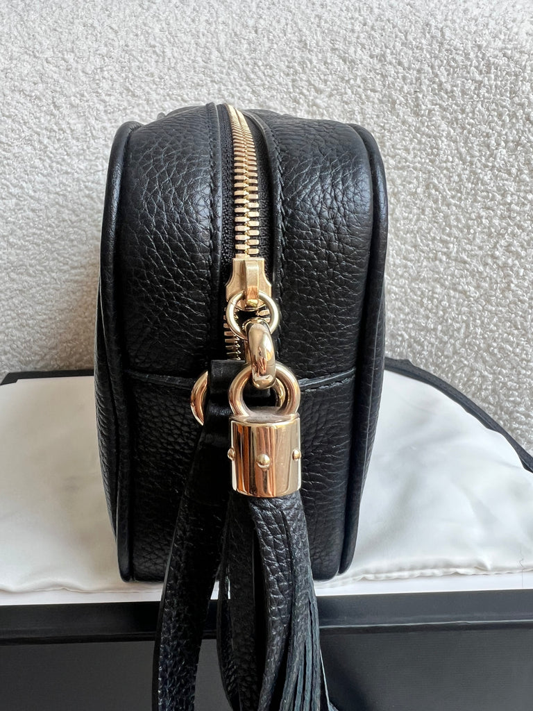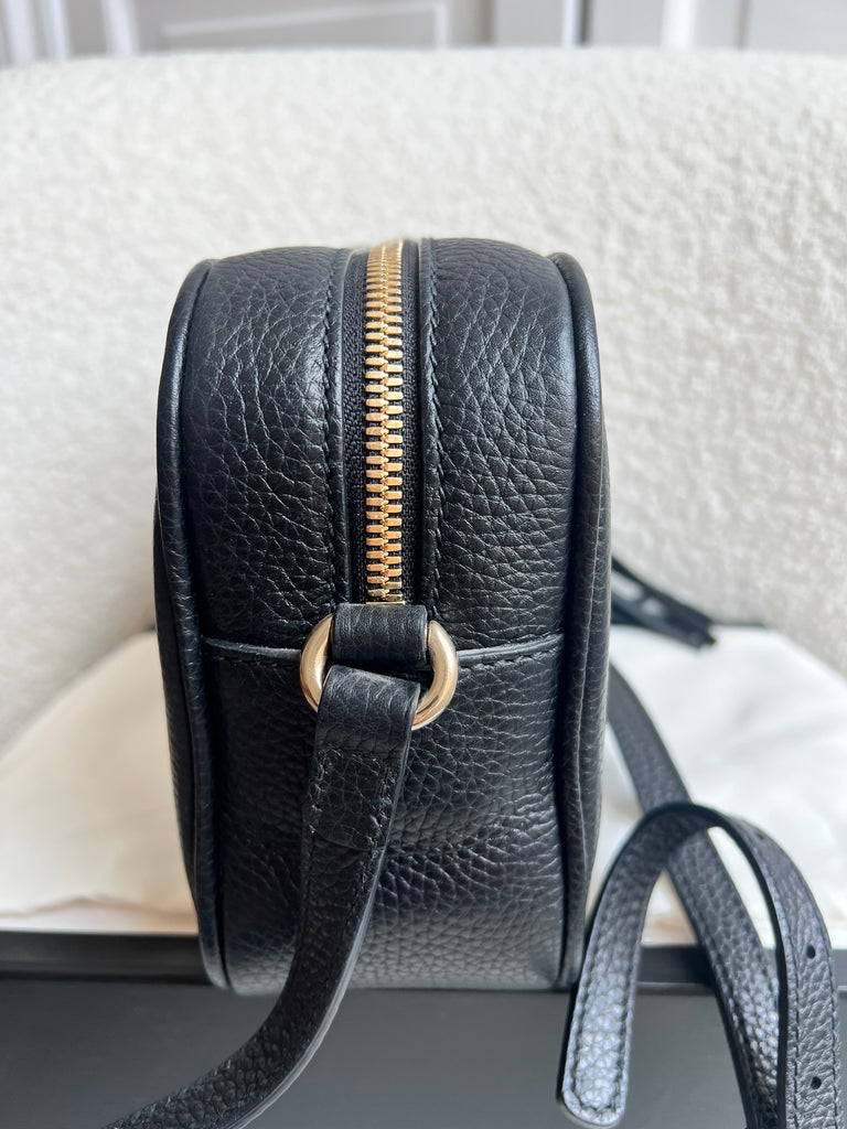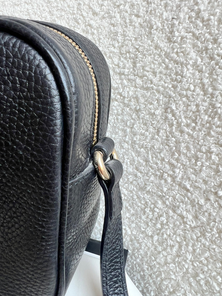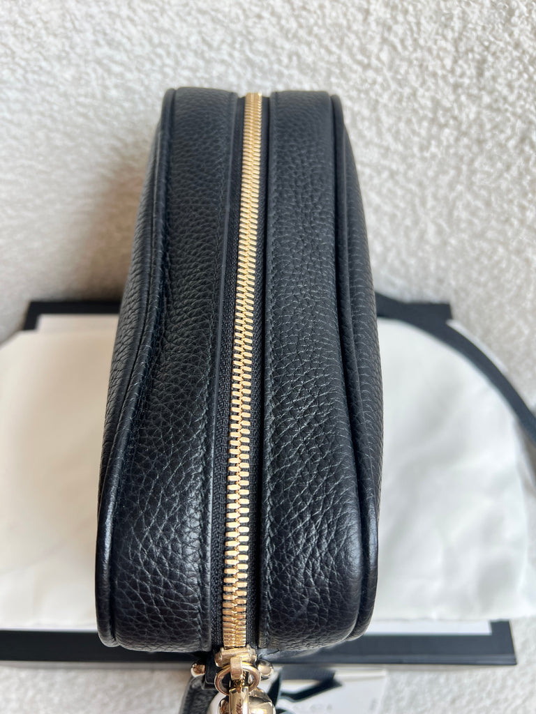 Gucci Soho Disco in Black Leather with pale gold hardware. This practical, cross body, camera style bag is compact in size but still fits a reasonable amount. Can be worn over shoulder or cross body. Gucci's most popular style and goes with any outfit, dressed up or down.