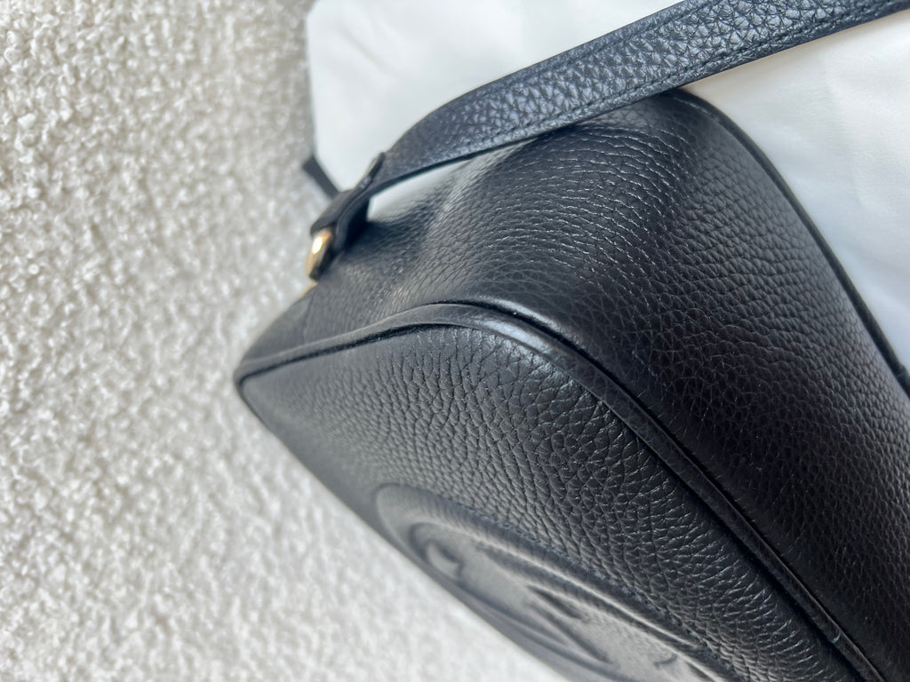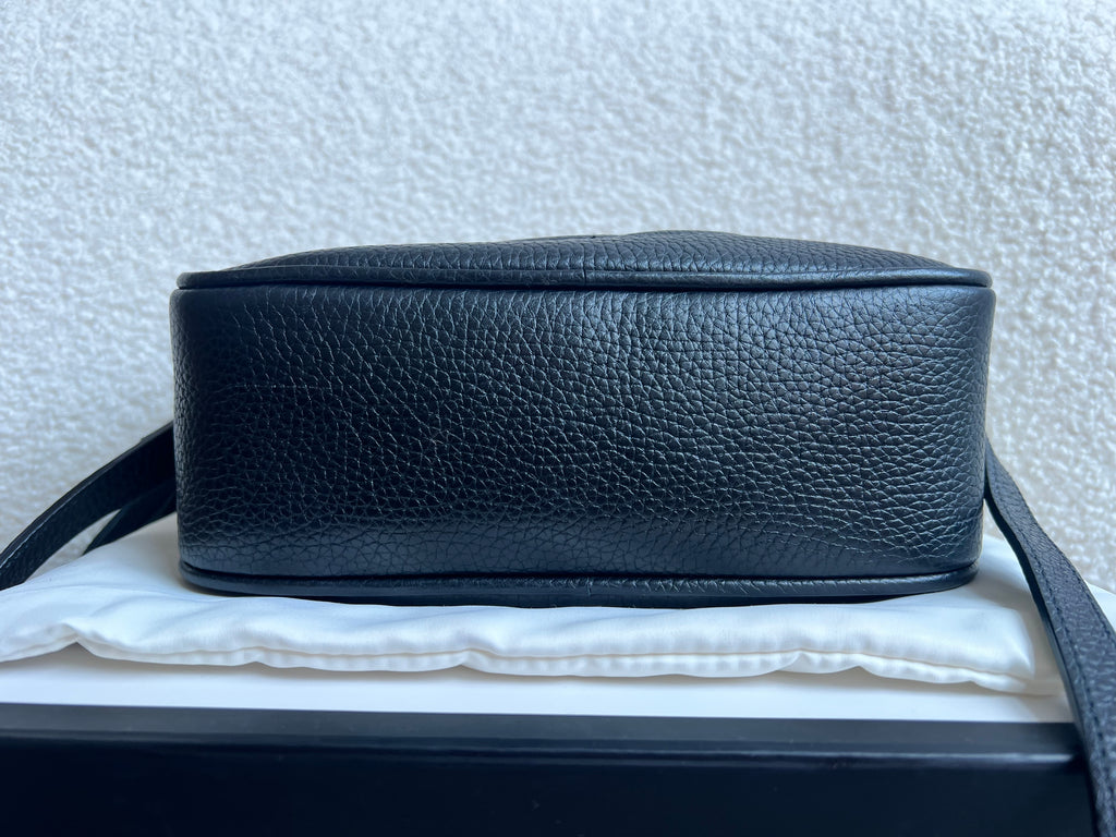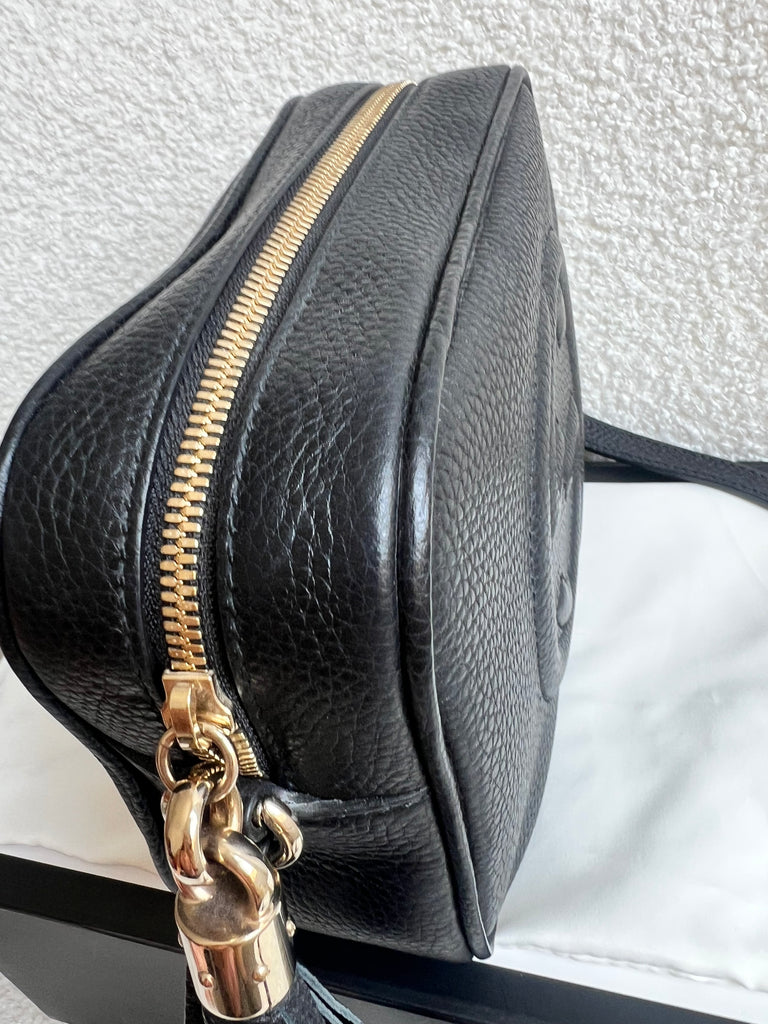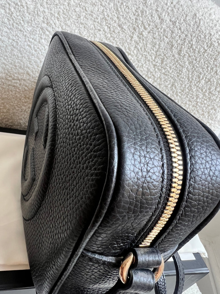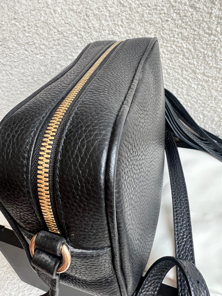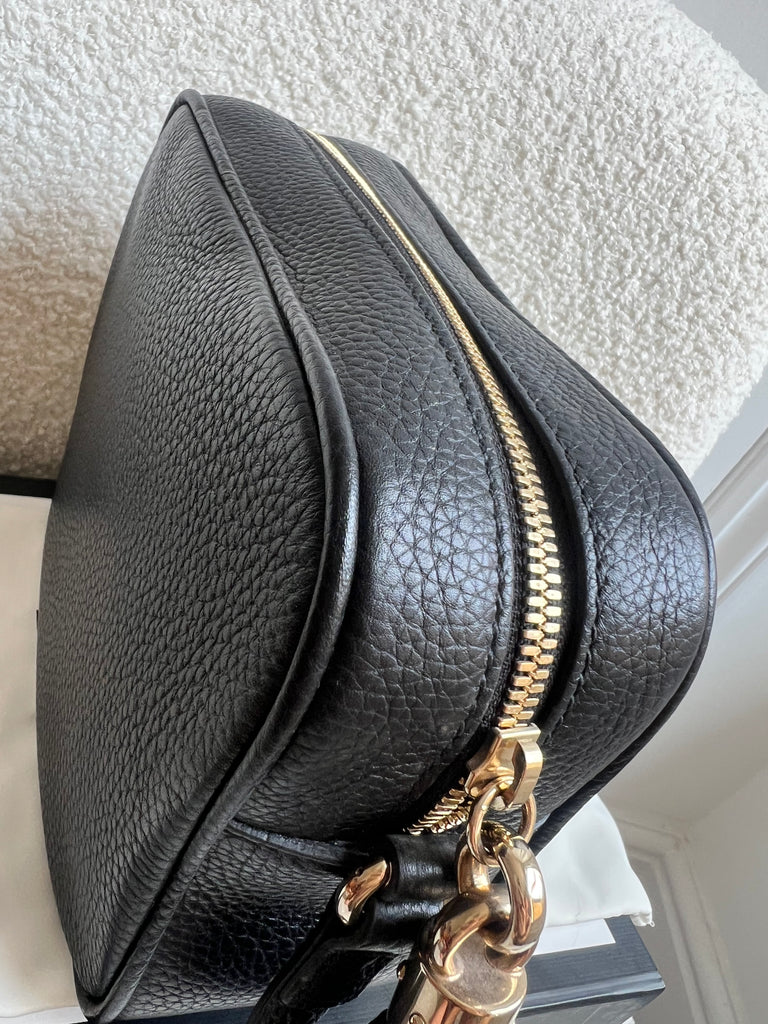 Gucci Soho Disco in Black Leather with pale gold hardware. This practical, cross body, camera style bag is compact in size but still fits a reasonable amount. Can be worn over shoulder or cross body. Gucci's most popular style and goes with any outfit, dressed up or down.