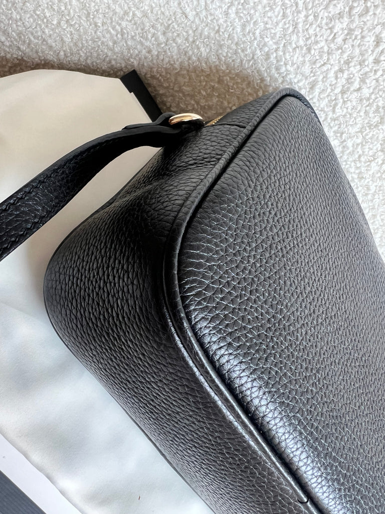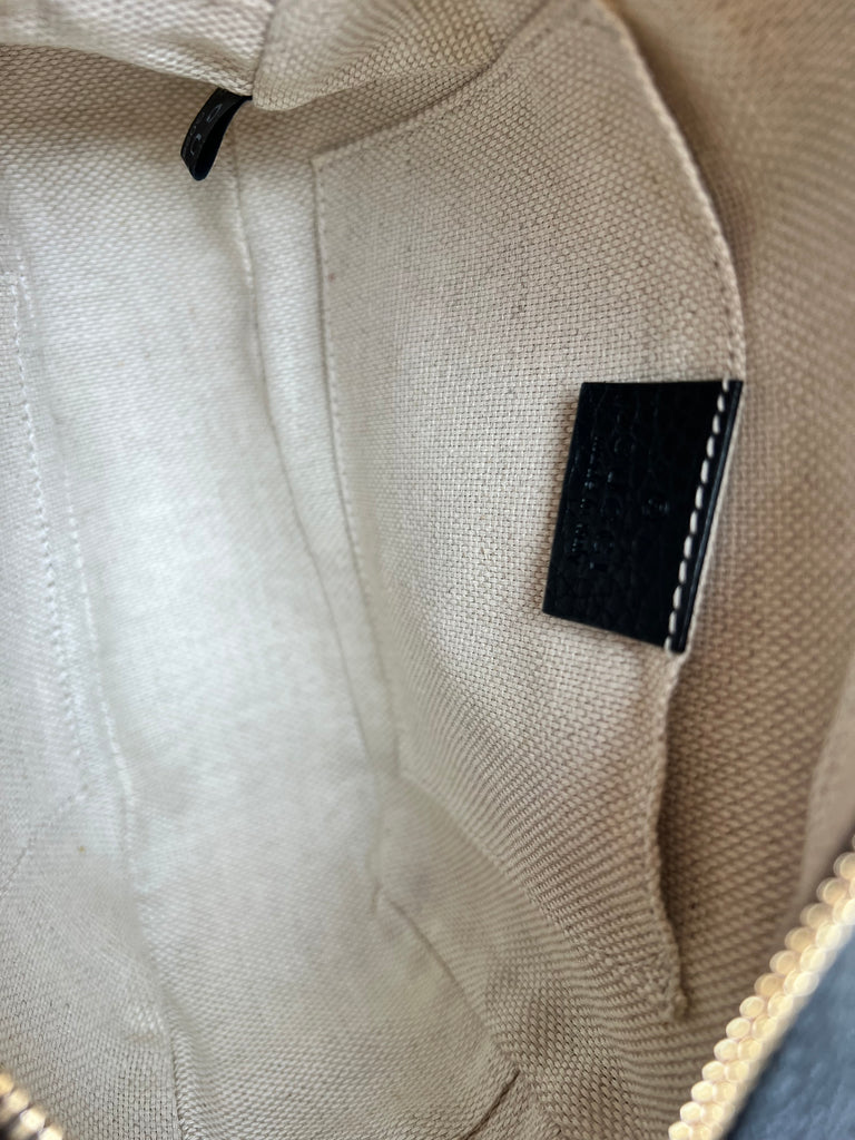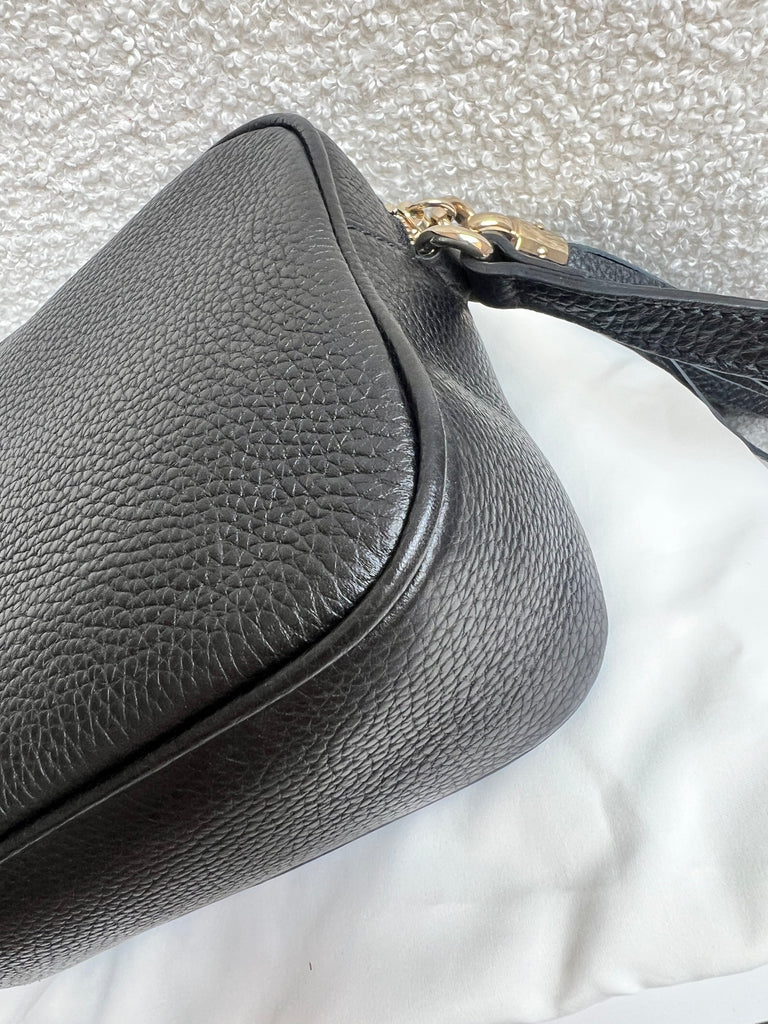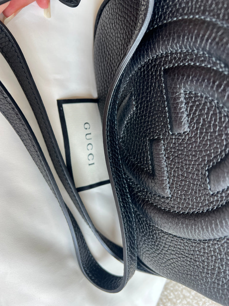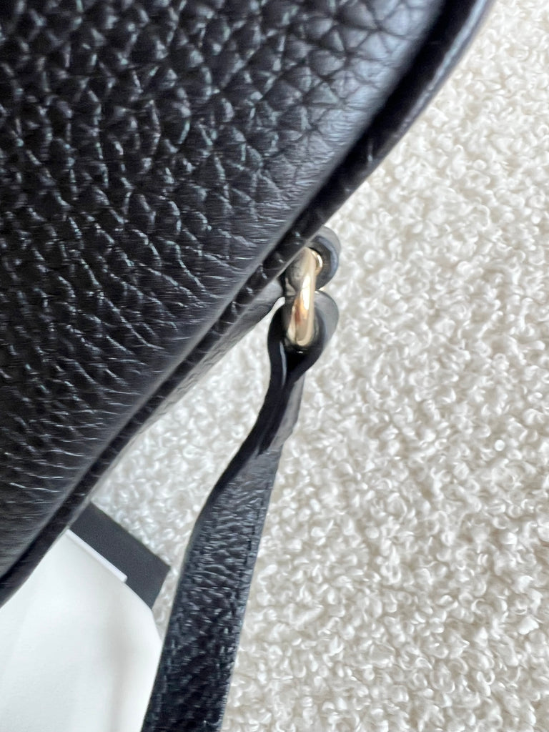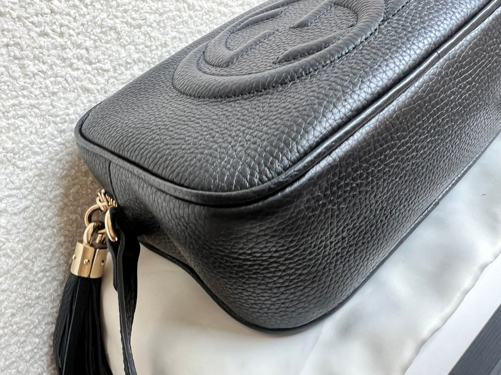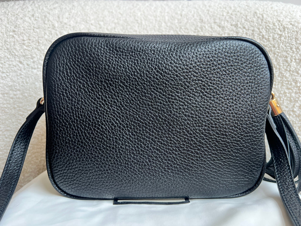 Gucci Soho Disco in Black Leather with pale gold hardware. This practical, cross body, camera style bag is compact in size but still fits a reasonable amount. Can be worn over shoulder or cross body. Gucci's most popular style and goes with any outfit, dressed up or down.