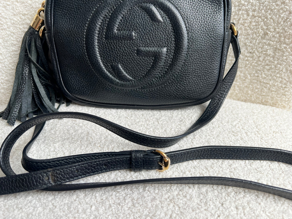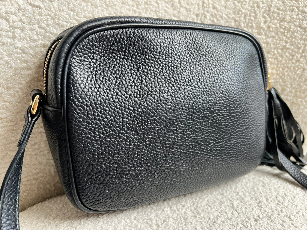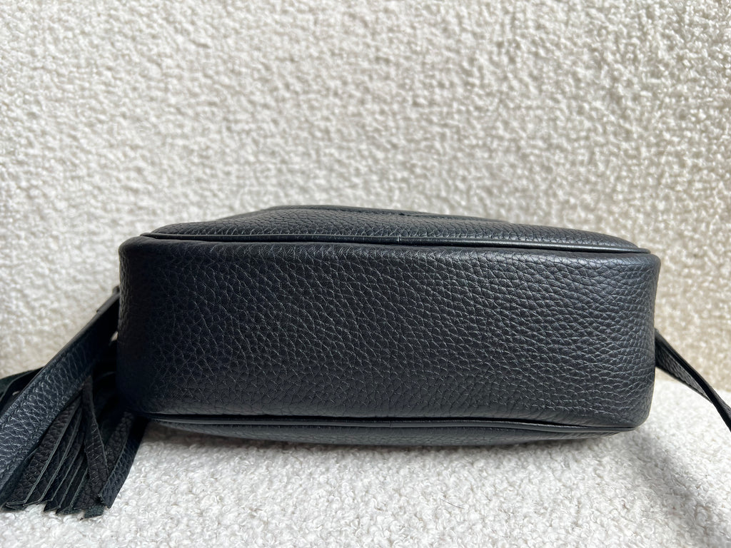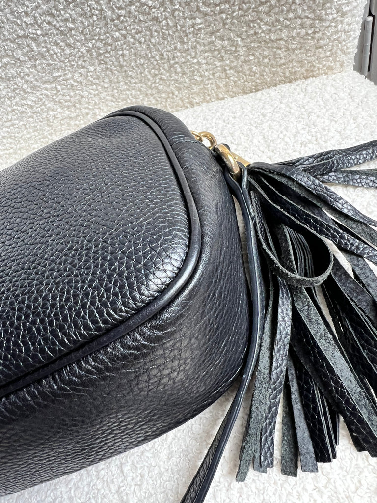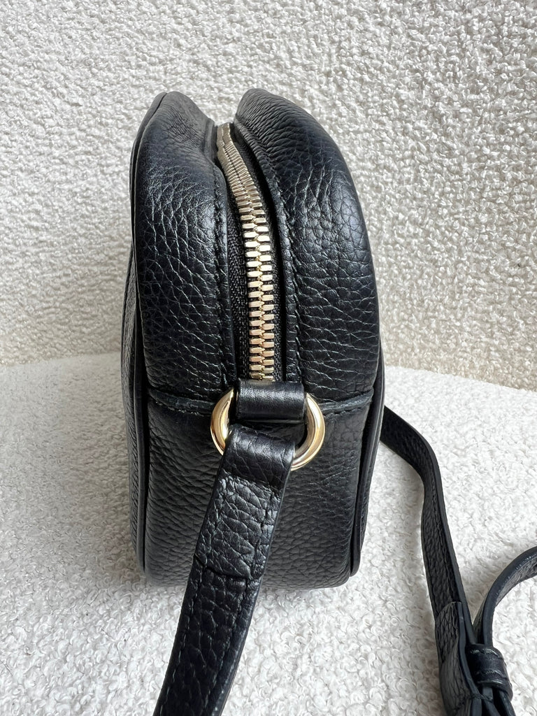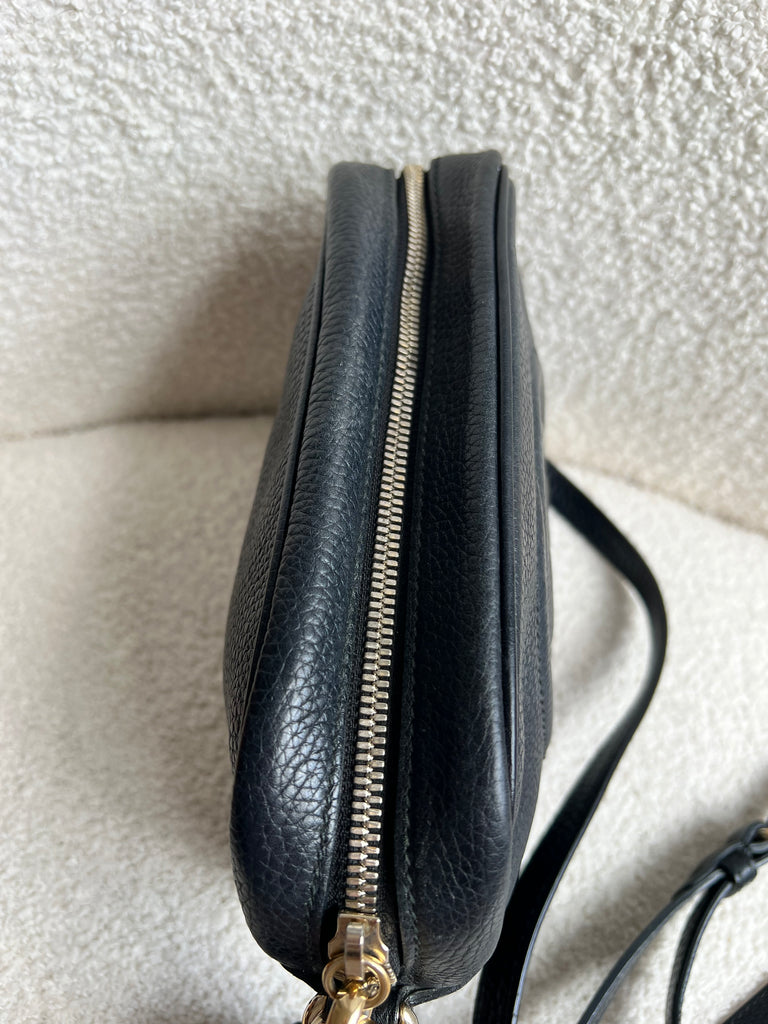 Gucci Soho Disco in Black Leather with pale gold hardware. This practical, cross body, camera style bag is compact in size but still fits a reasonable amount. Can be worn over shoulder or cross body. Gucci's most popular style and goes with any outfit, dressed up or down.