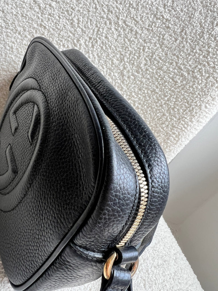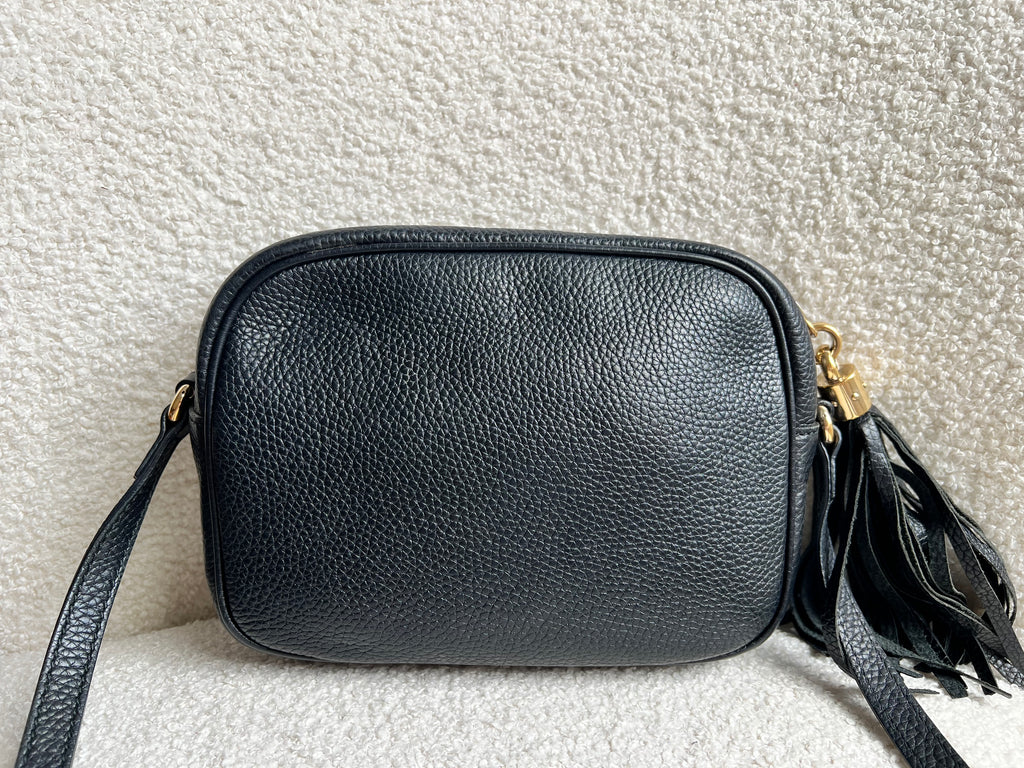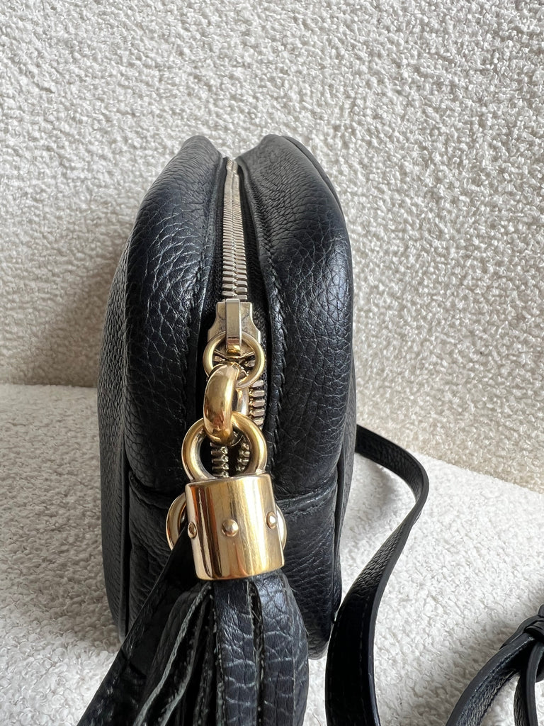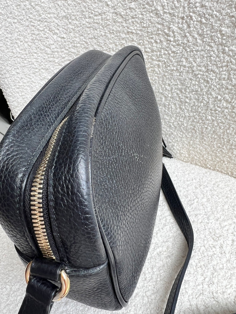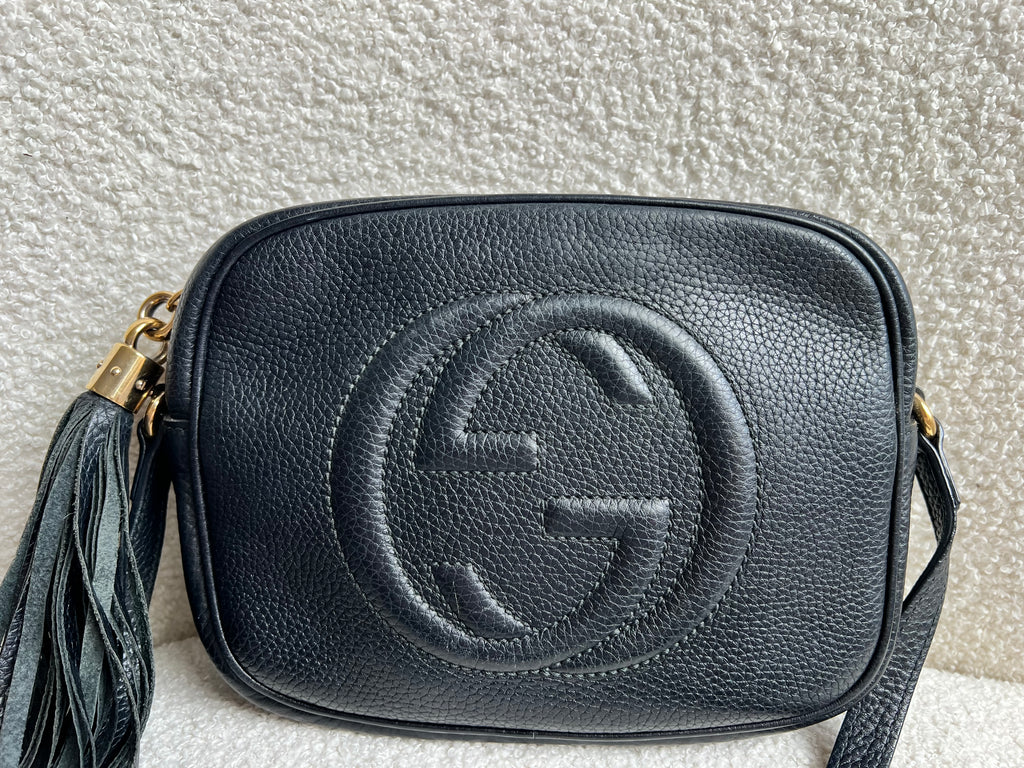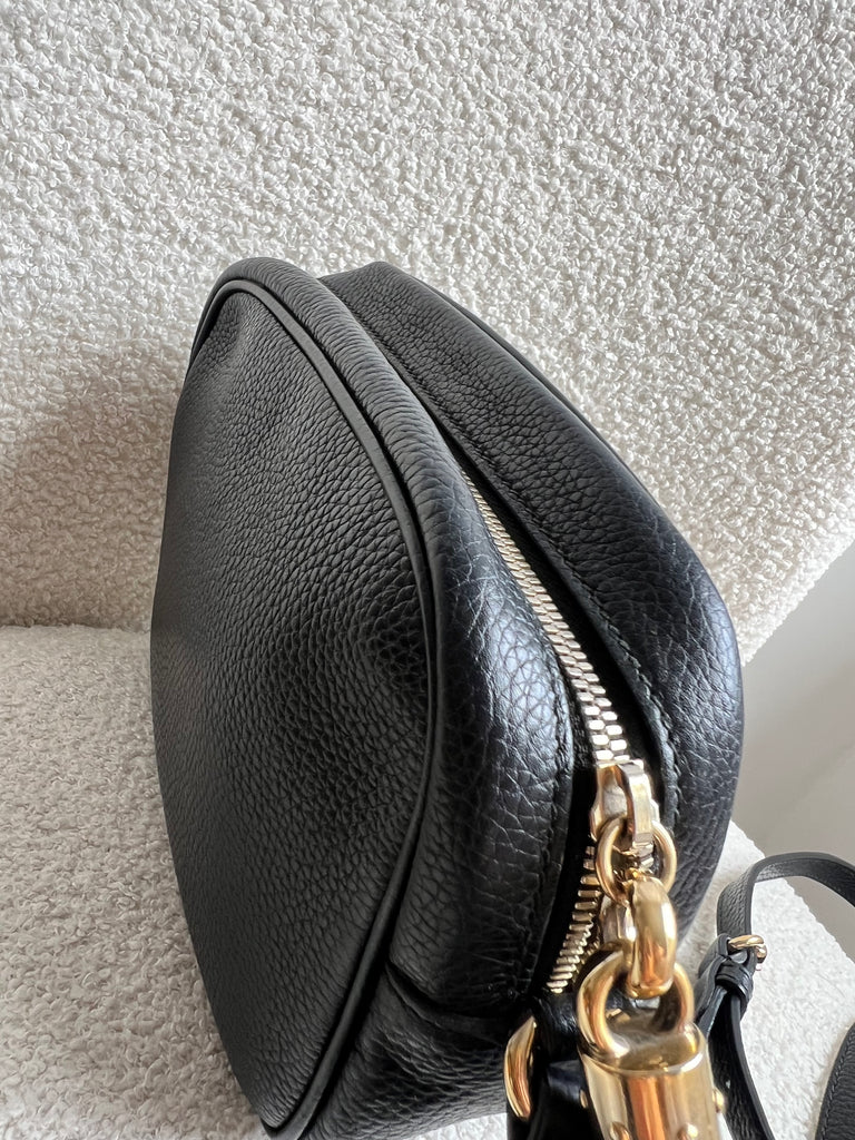 Gucci Soho Disco in Black Leather with pale gold hardware. This practical, cross body, camera style bag is compact in size but still fits a reasonable amount. Can be worn over shoulder or cross body. Gucci's most popular style and goes with any outfit, dressed up or down.