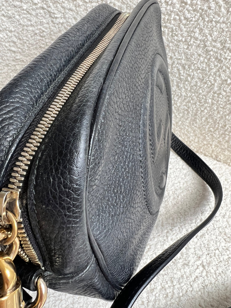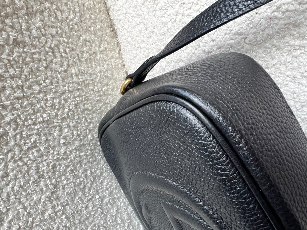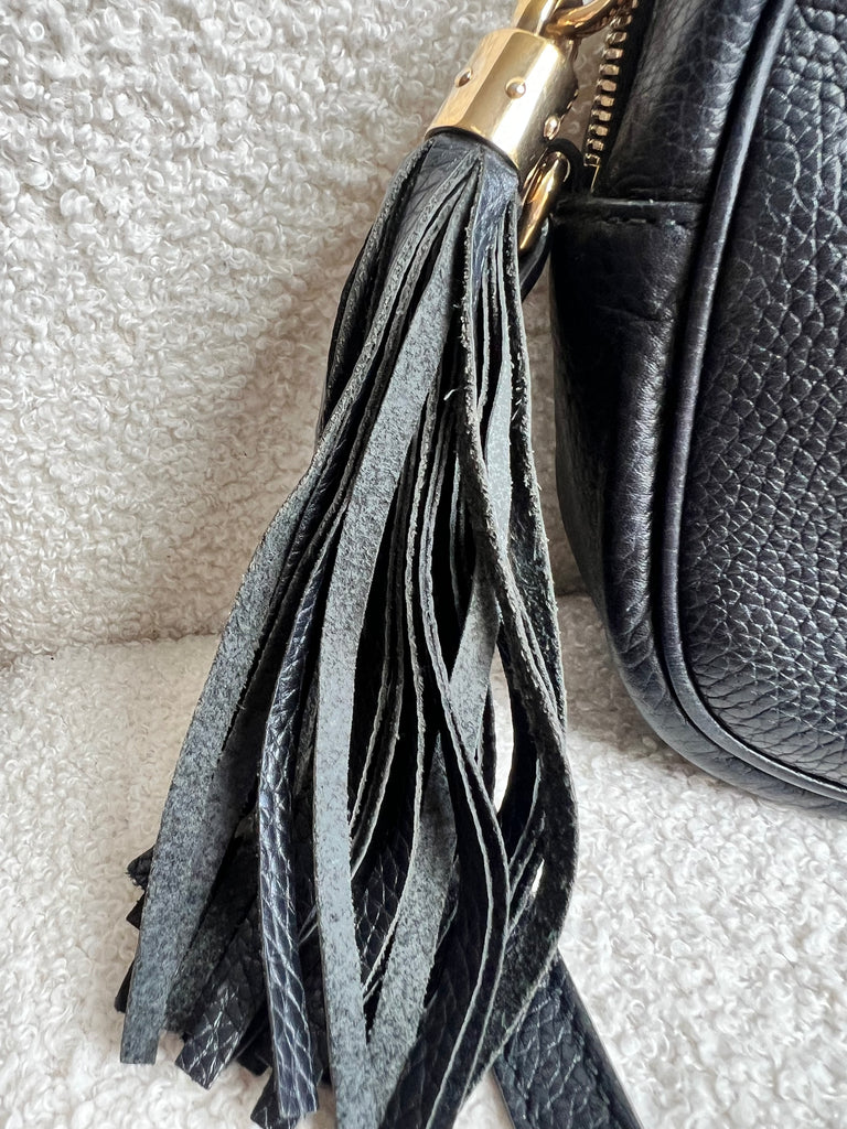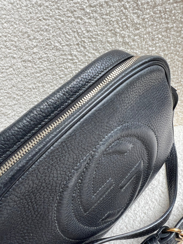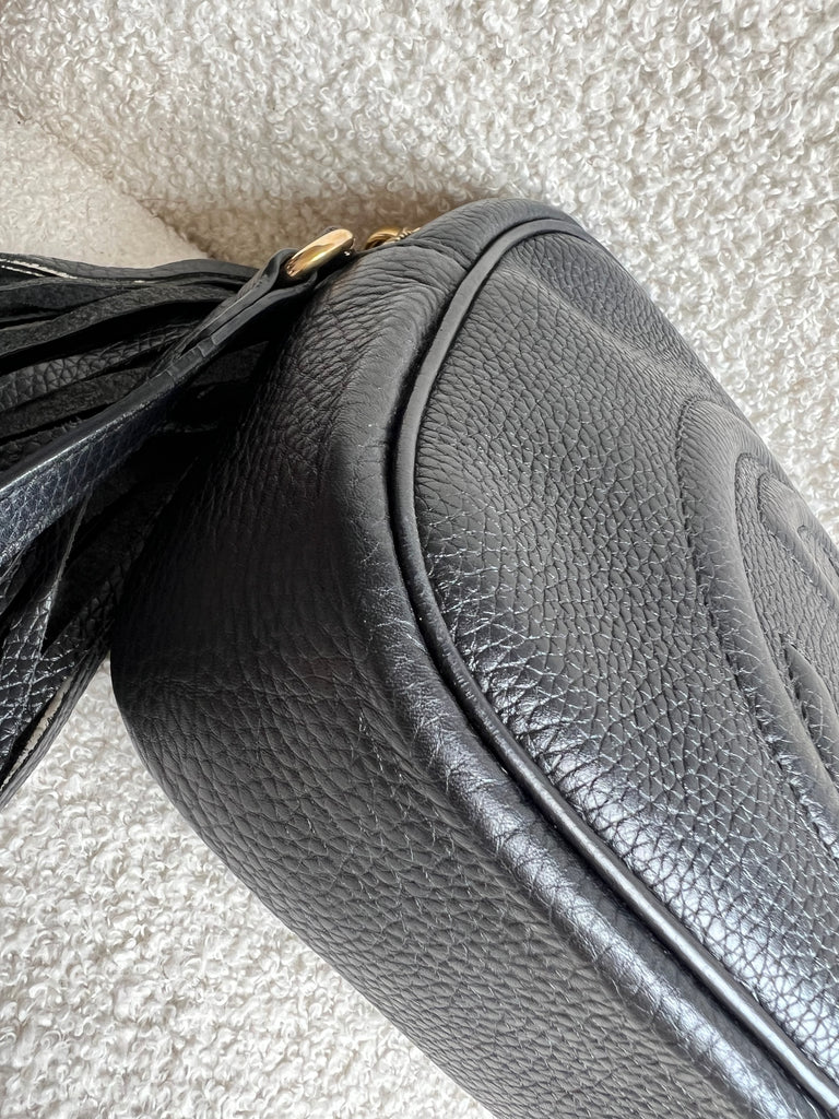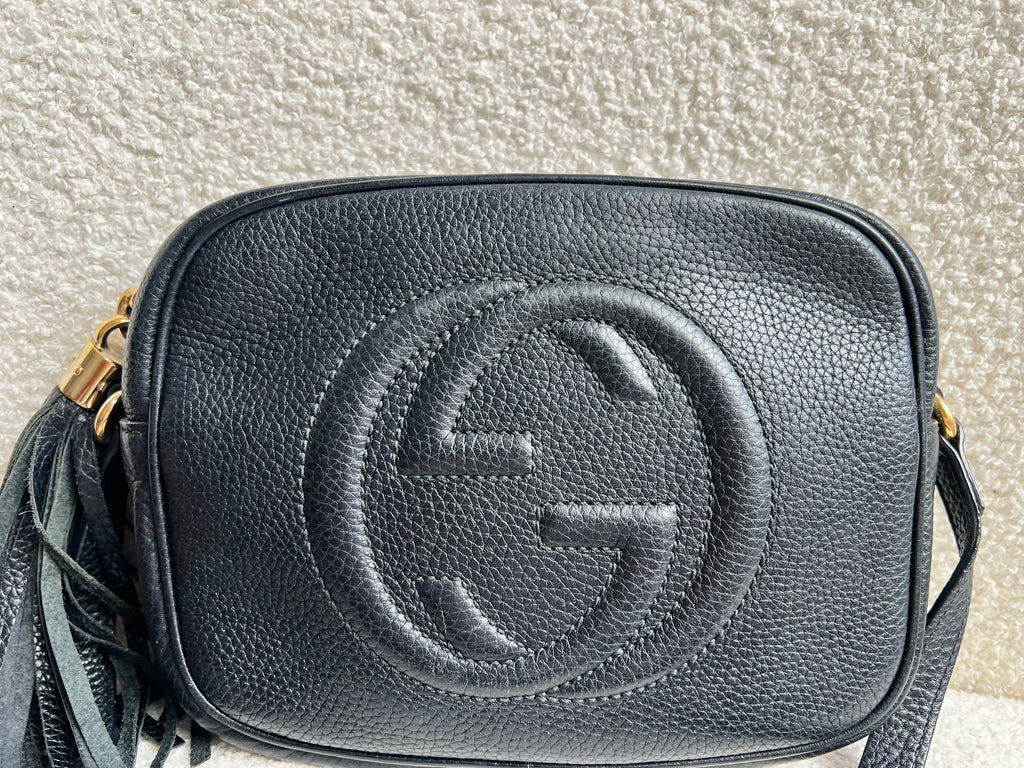 Gucci Soho Disco in Black Leather with pale gold hardware. This practical, cross body, camera style bag is compact in size but still fits a reasonable amount. Can be worn over shoulder or cross body. Gucci's most popular style and goes with any outfit, dressed up or down.