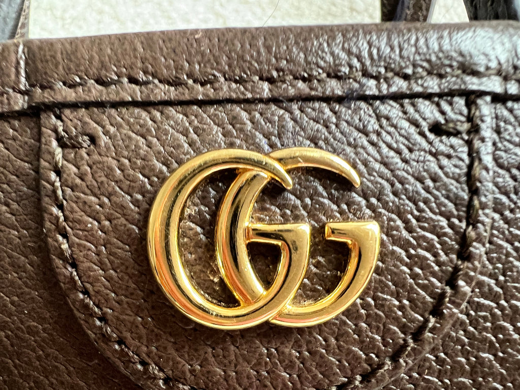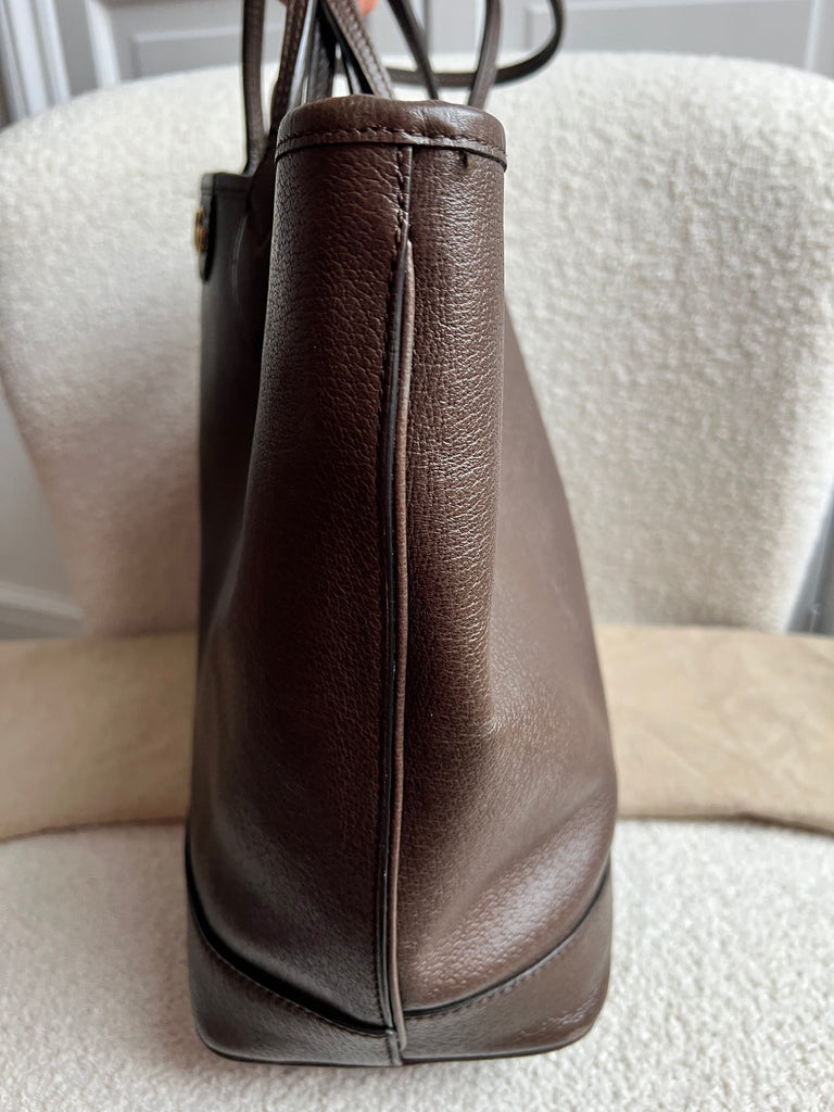 Gucci Ophidia Medium GG Ophidia Tote in Brown calfskin with gold hardware. Crafted in GG dark brown smooth calfskin leather. This large tote combines the signature motif with the web stripe - a timeless pairing that pays homage to Gucci’s roots. Can be carried over the shoulder comfortably or by hand. Ideal size for day to day use.