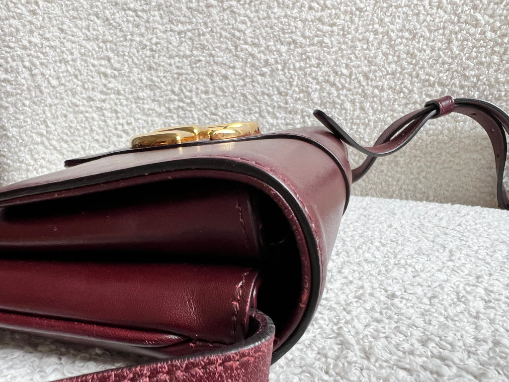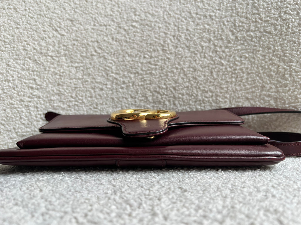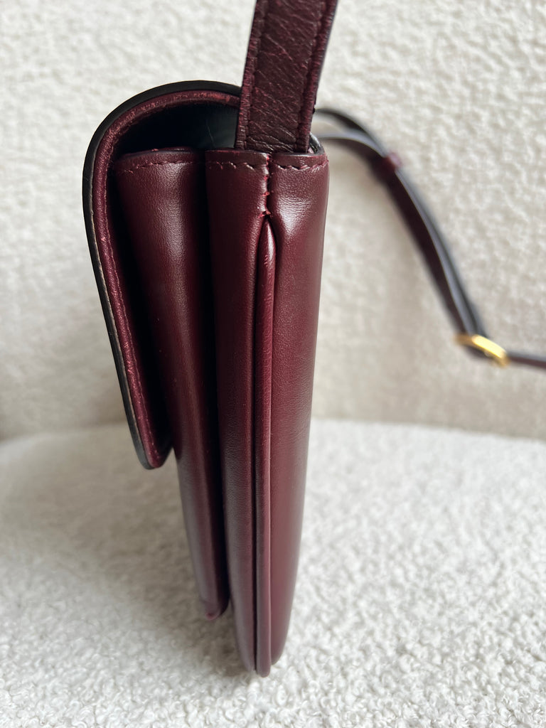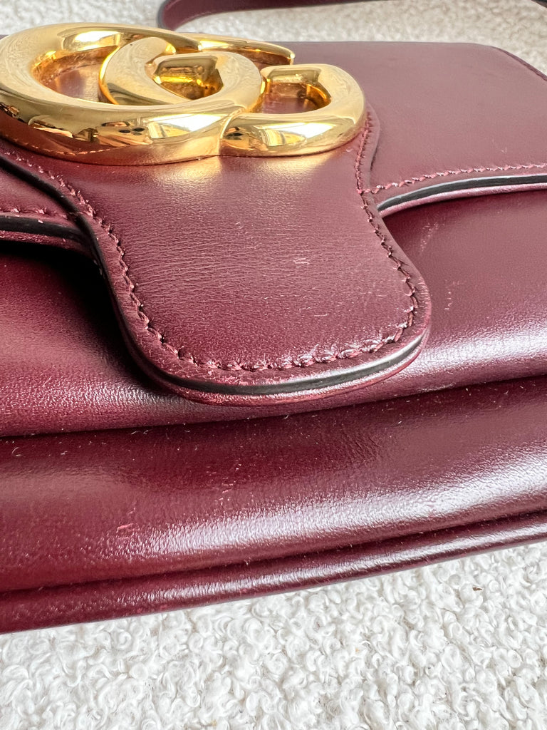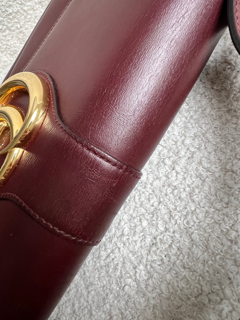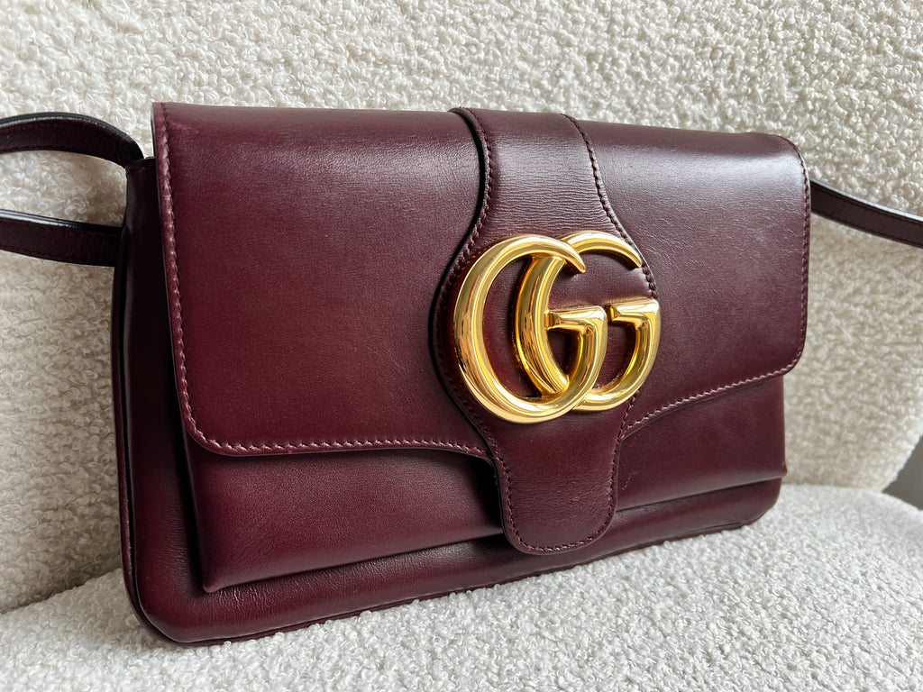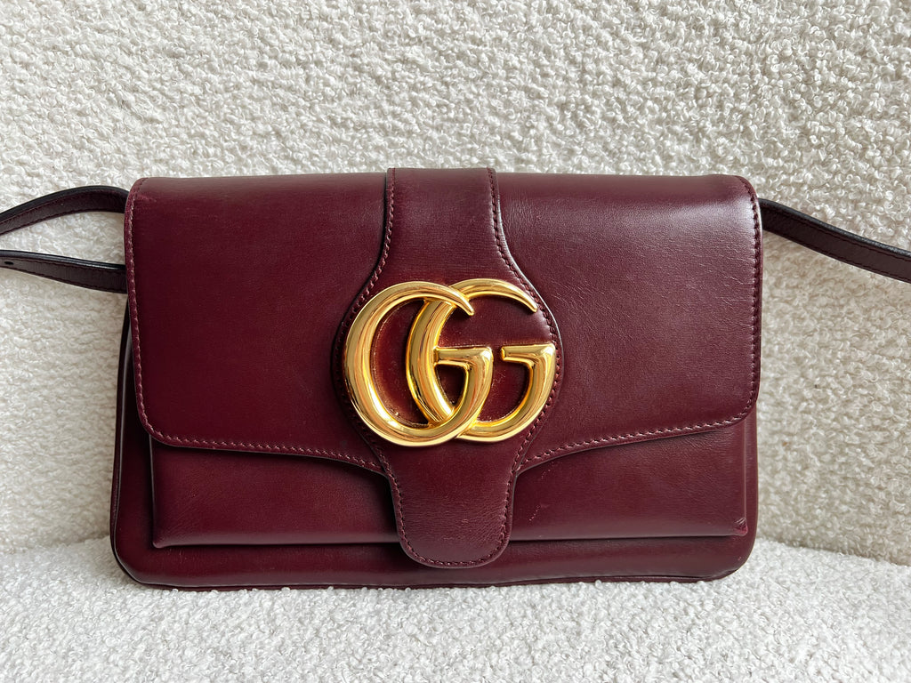 Gucci Small Arli Crossbody in Burgundy smooth calfskin with gold hardware. Featuring the iconic GG logo hardware, closure is via flap with hidden magnetic closure. With its sleek design and small interior, this bag can comfortably hold all your essentials. Carry cross-body for ultimate hands-free convenience using the long adjustable strap.