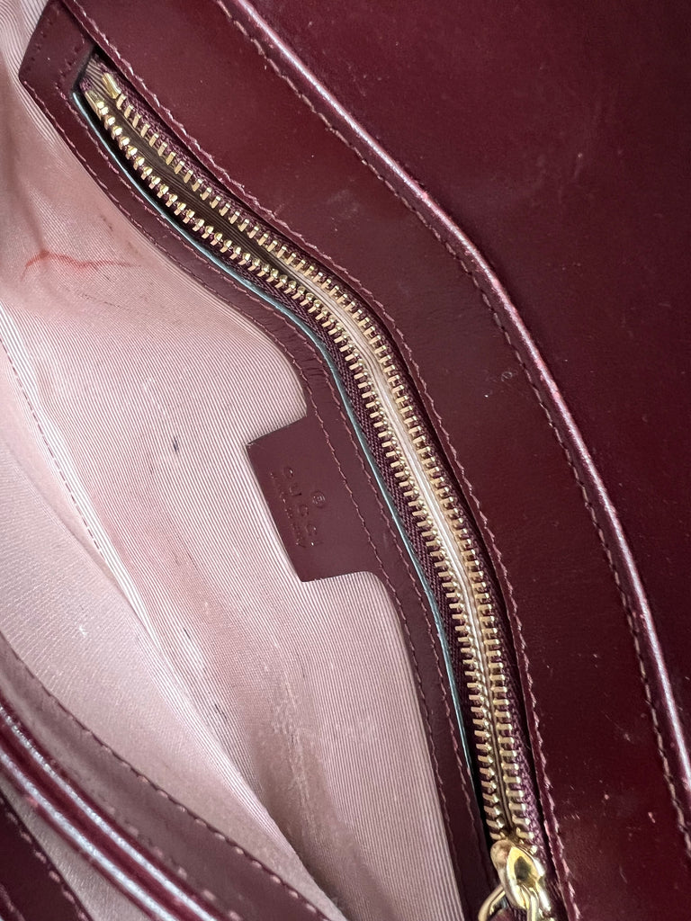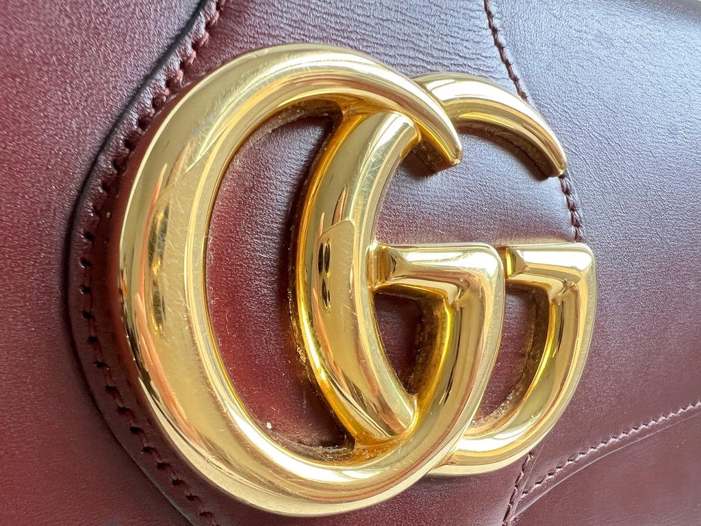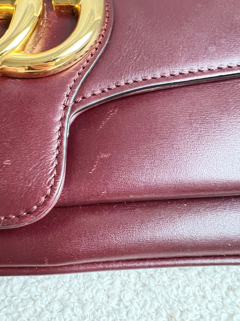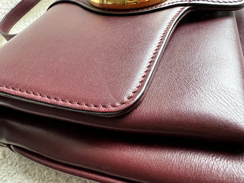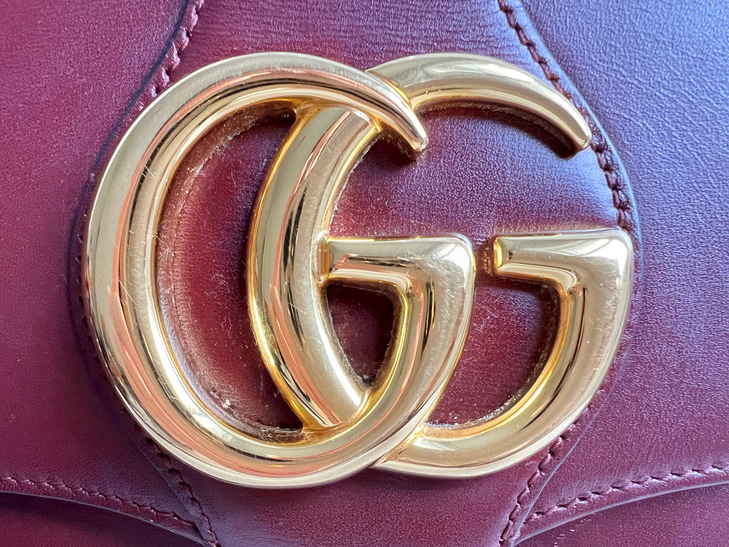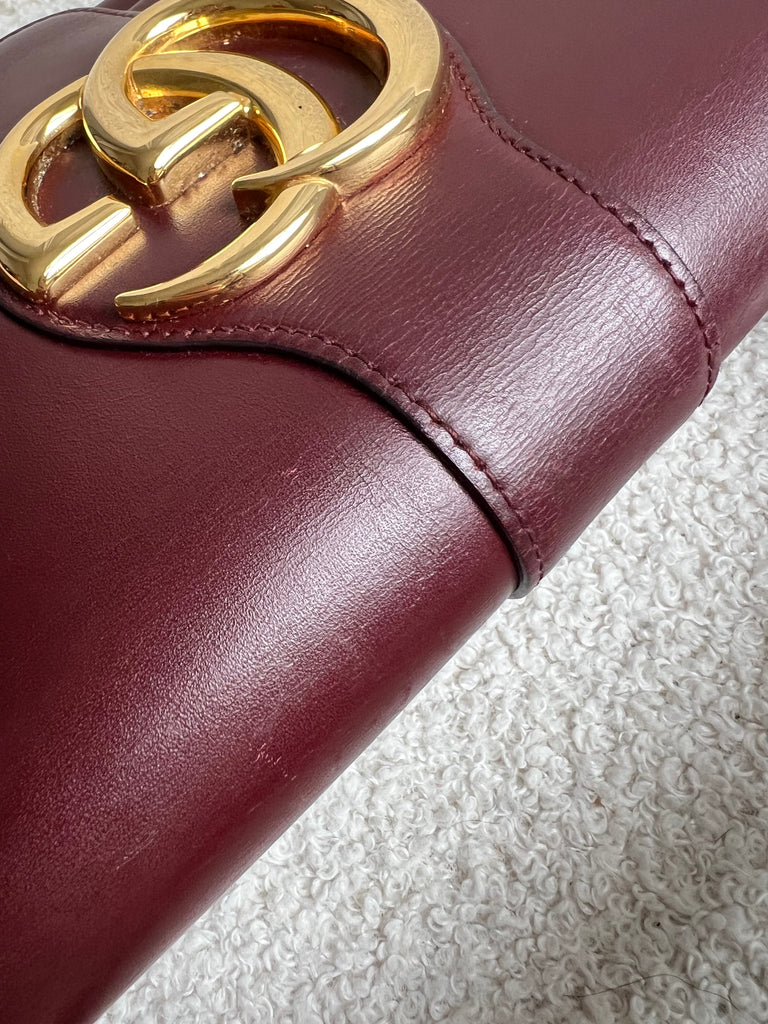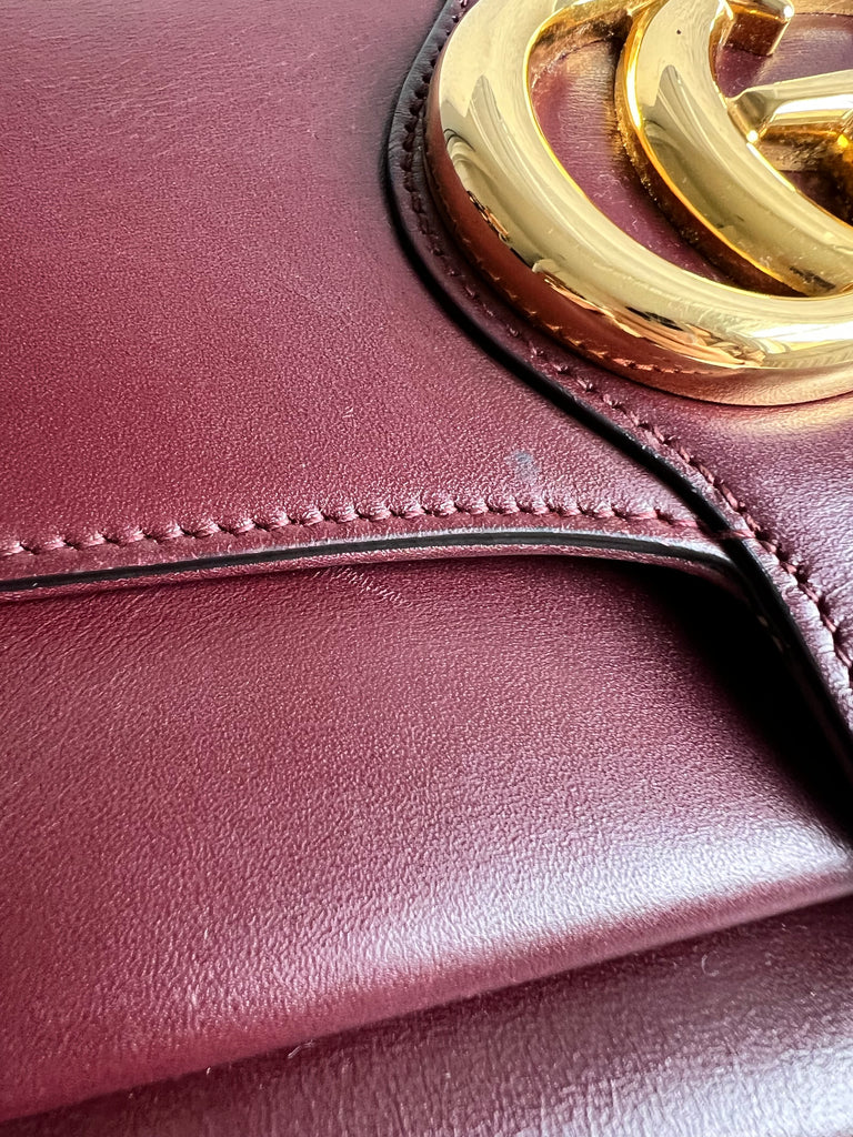Gucci Small Arli Crossbody in Burgundy smooth calfskin with gold hardware. Featuring the iconic GG logo hardware, closure is via flap with hidden magnetic closure. With its sleek design and small interior, this bag can comfortably hold all your essentials. Carry cross-body for ultimate hands-free convenience using the long adjustable strap.