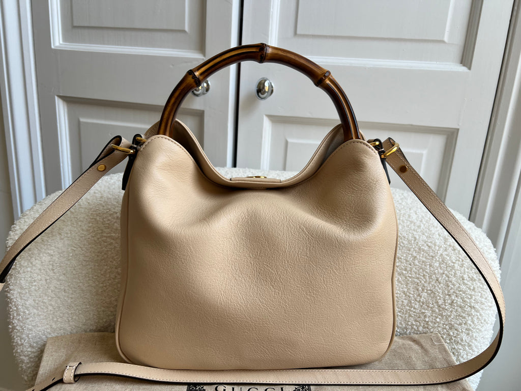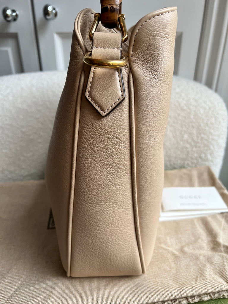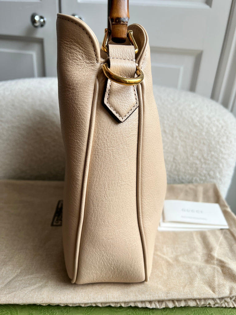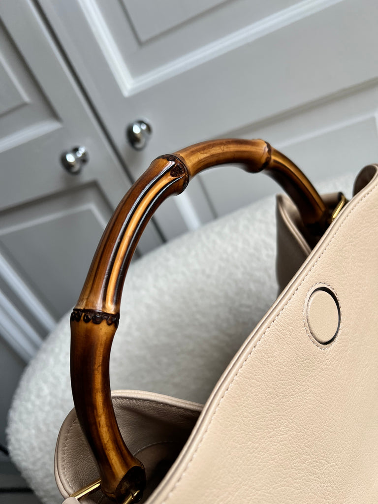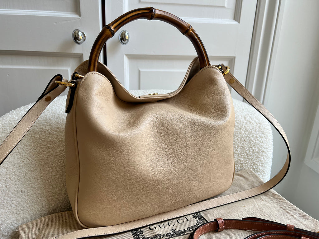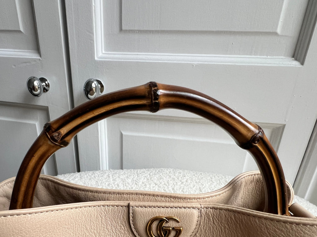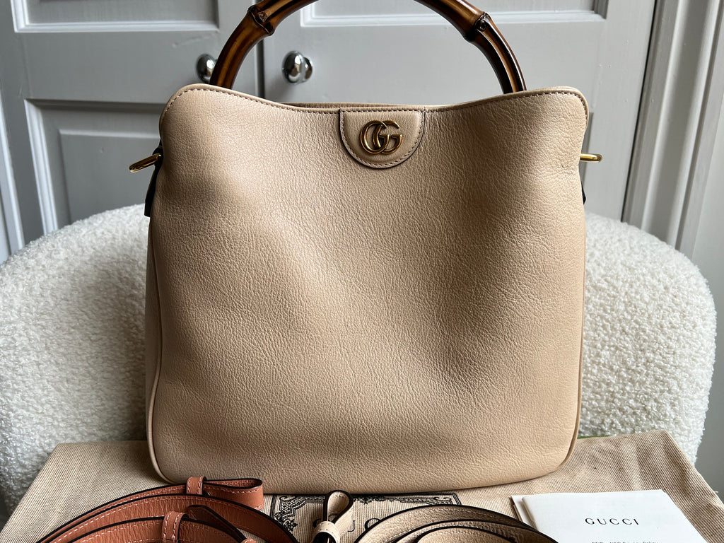 Gucci Medium Diana Shoulder Bag in Cream leather with gold hardware and bamboo handle. This medium size shoulder bag features GG hardware and bamboo top handle. This versatile day to day bag can be carried over shoulder or cross body using the adjustable leather straps (2 colour options). Slightly slouchy.
