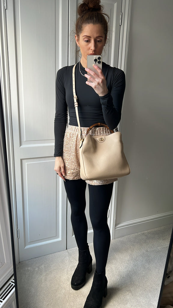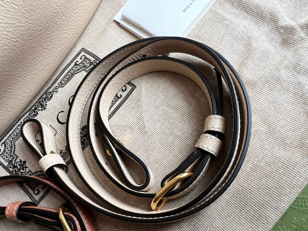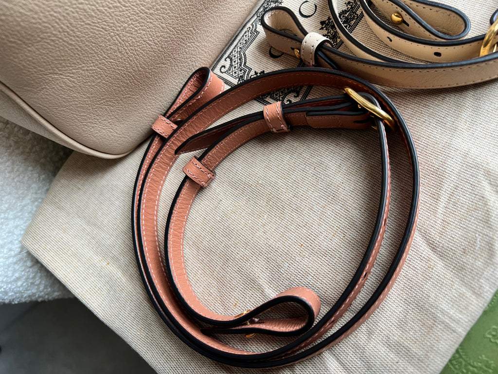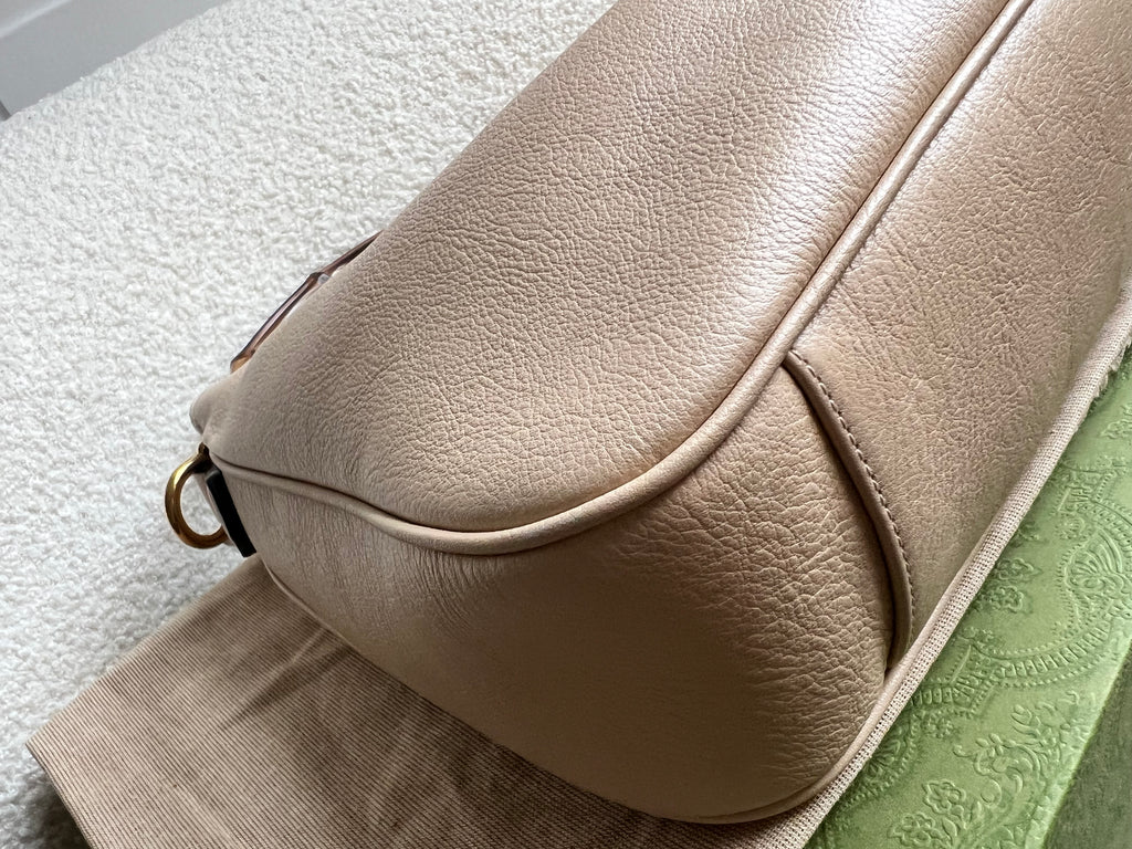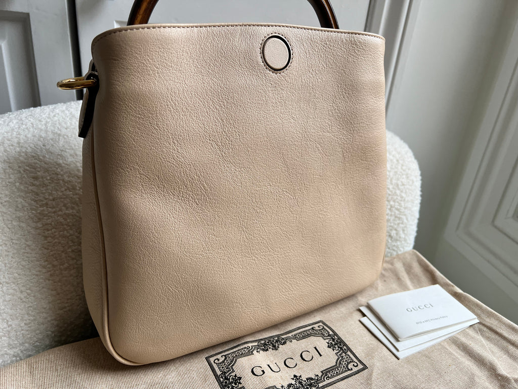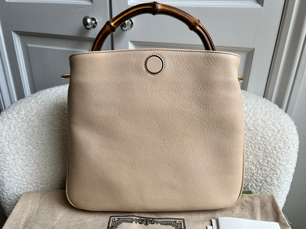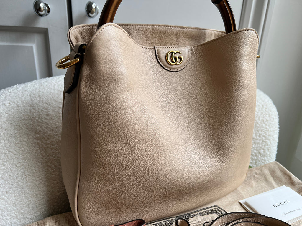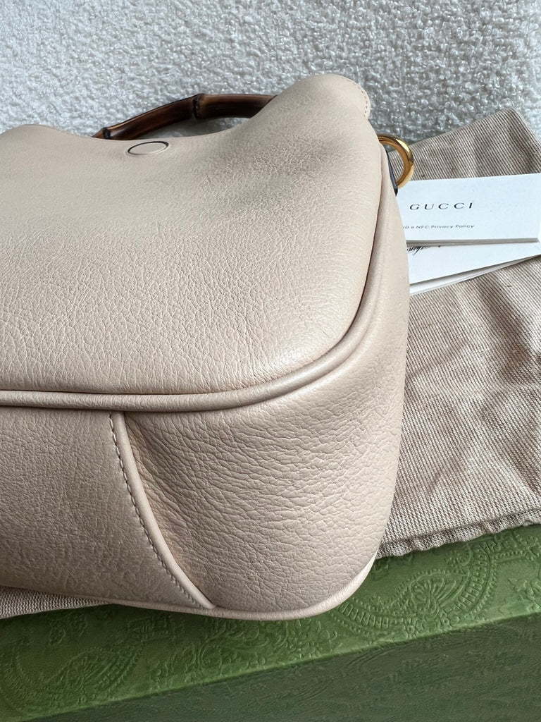 Gucci Medium Diana Shoulder Bag in Cream leather with gold hardware and bamboo handle. This medium size shoulder bag features GG hardware and bamboo top handle. This versatile day to day bag can be carried over shoulder or cross body using the adjustable leather straps (2 colour options). Slightly slouchy.