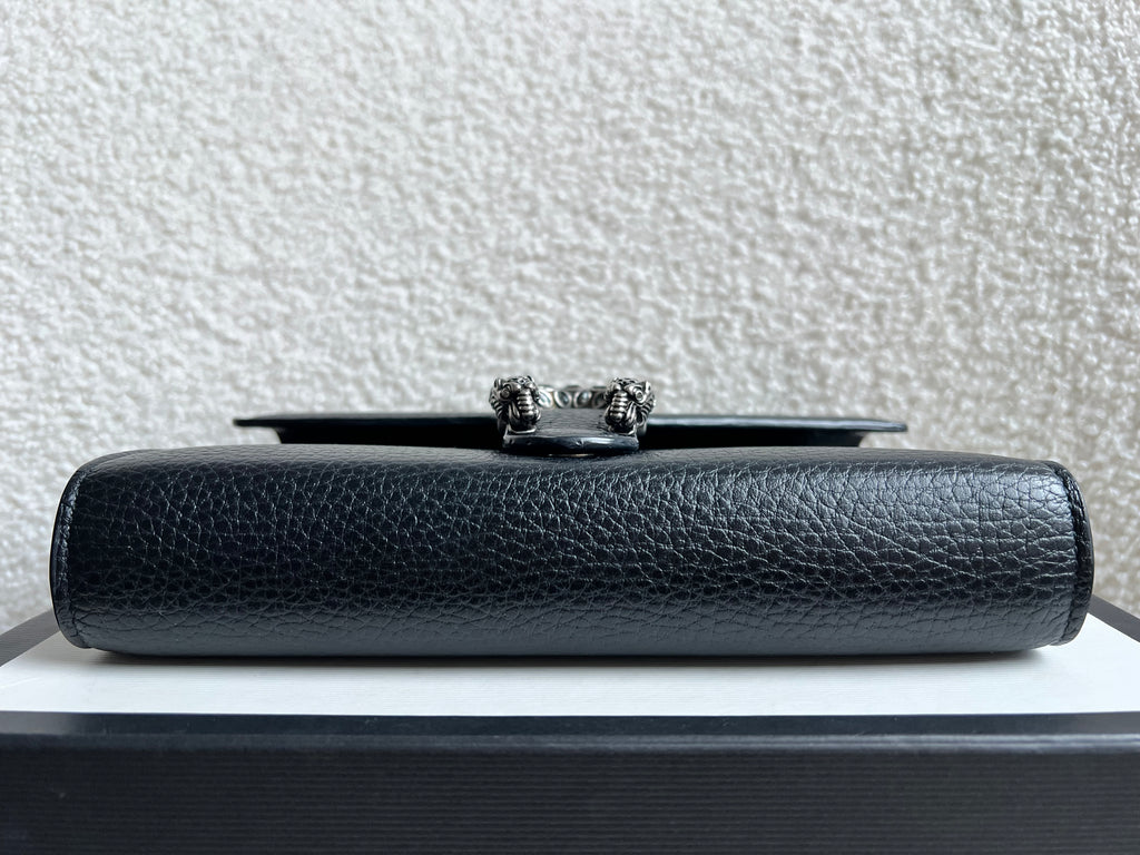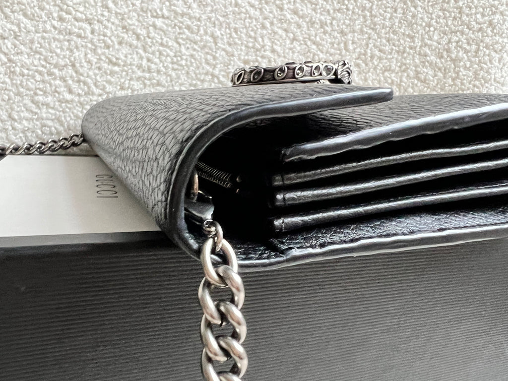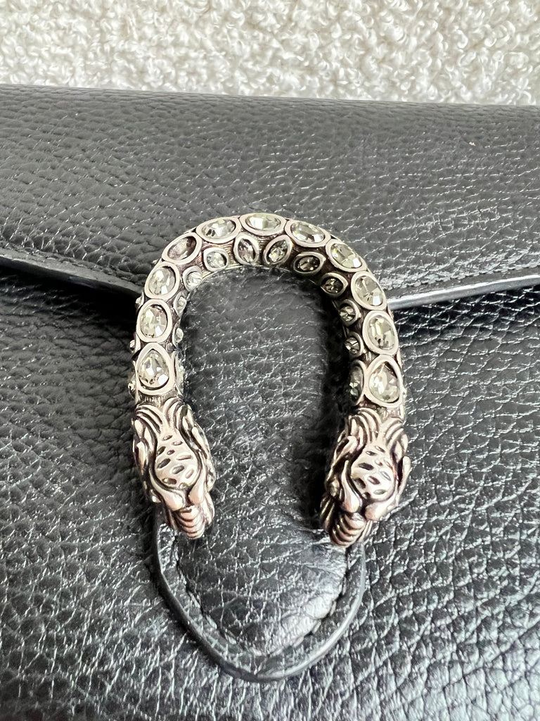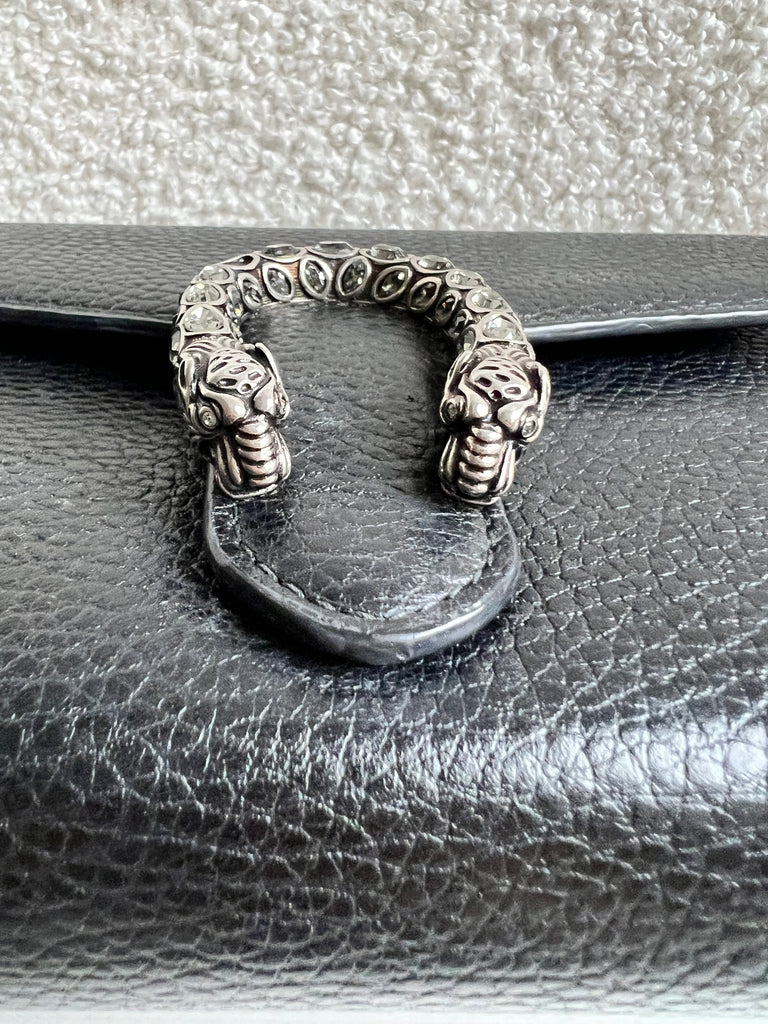 Gucci Dionysus Mini Chain bag in black grained calf leather with antique silver hardware. This chain wallet style features the textured tiger head press stud closure. The tiger head is enriched with Swarovski crystal stones. Ideal for evening or event wear. Can be carried over the shoulder or cross body, or carried as a handheld clutch with the detachable strap removed.