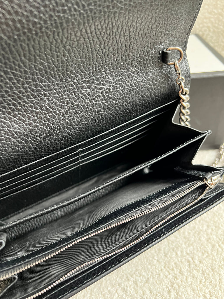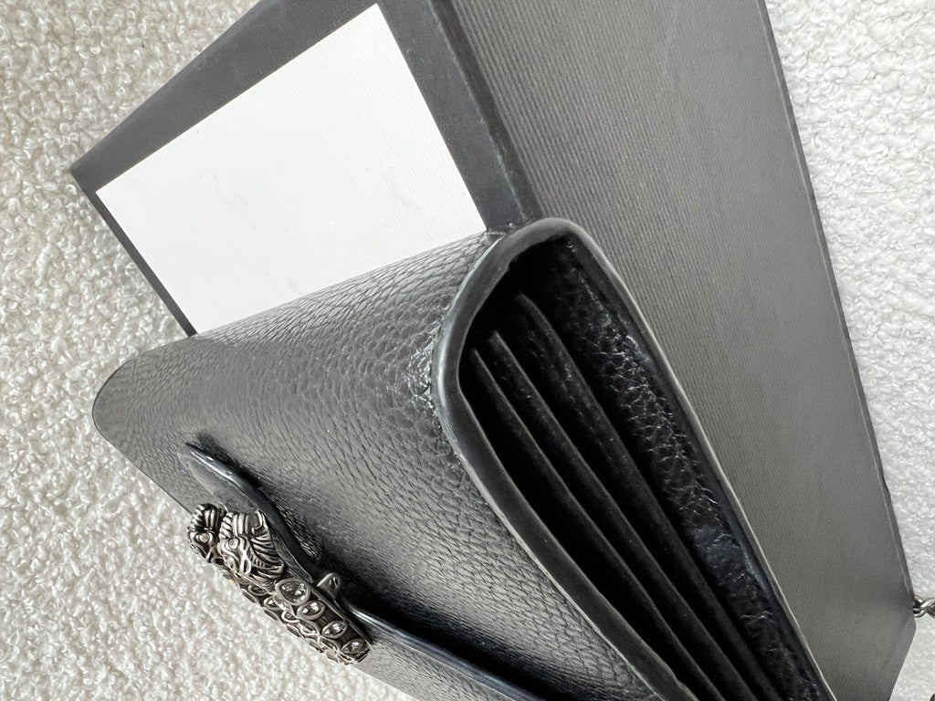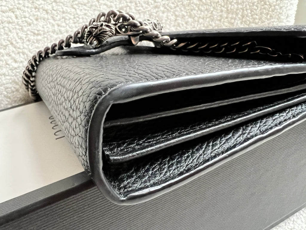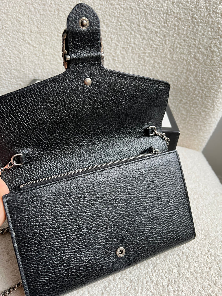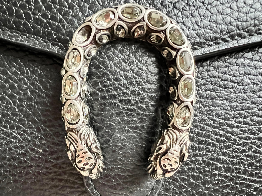 Gucci Dionysus Mini Chain bag in black grained calf leather with antique silver hardware. This chain wallet style features the textured tiger head press stud closure. The tiger head is enriched with Swarovski crystal stones. Ideal for evening or event wear. Can be carried over the shoulder or cross body, or carried as a handheld clutch with the detachable strap removed.