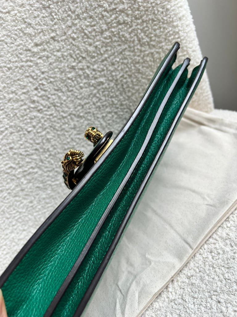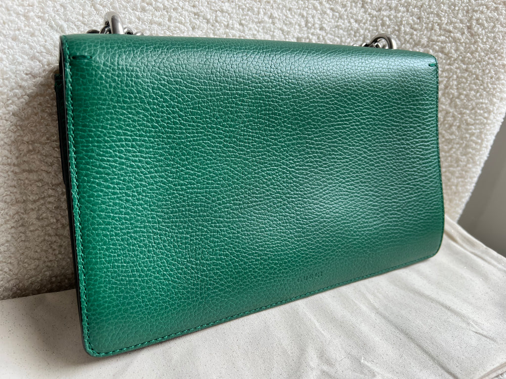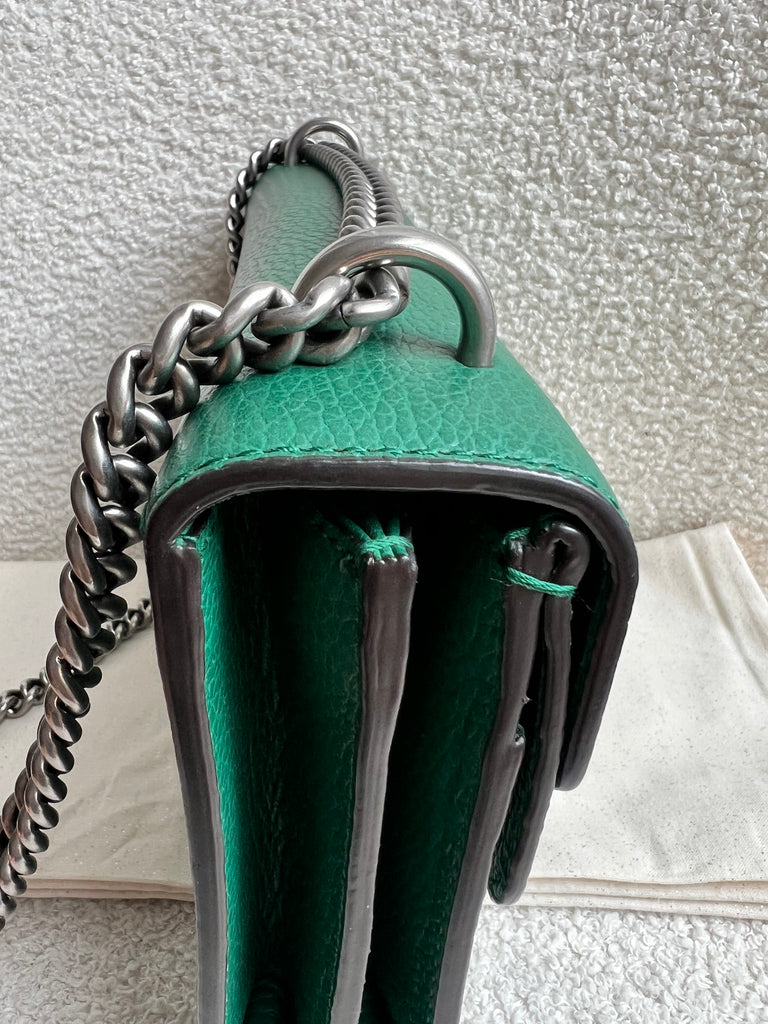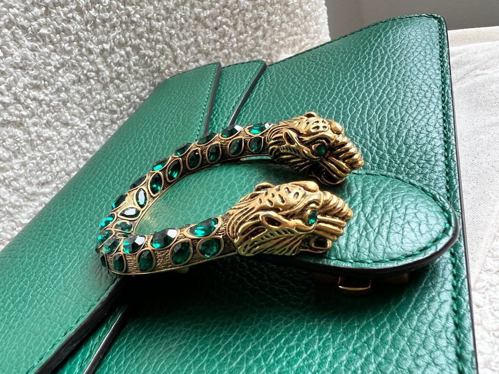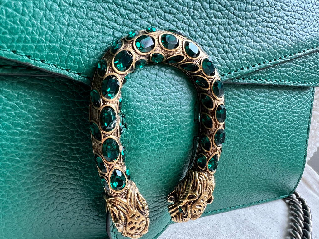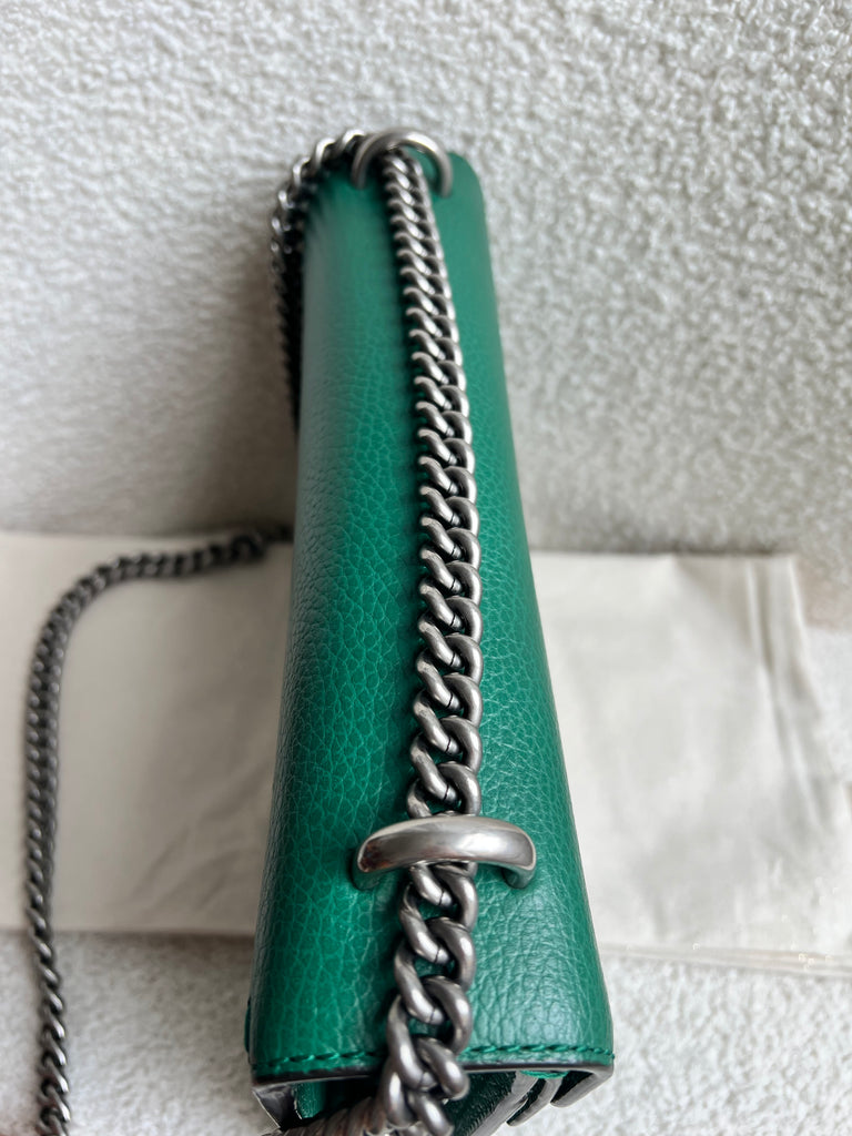 Gucci Small Dionysus GG Shoulder Bag in Green Grained Leather with silver hardware. The small Dionysus shoulder bag features the tiger head closure with Swarovski crystals. This iconic style is perfect for day or evening use. The sliding chain strap can be worn lengthened or doubled up over the shoulder or in the crook of the arm. Note the strap is not long enough to be worn cross body.