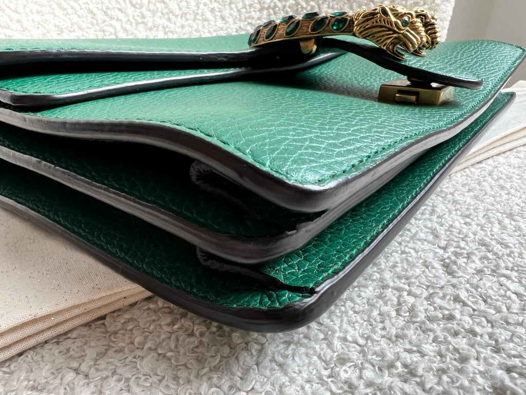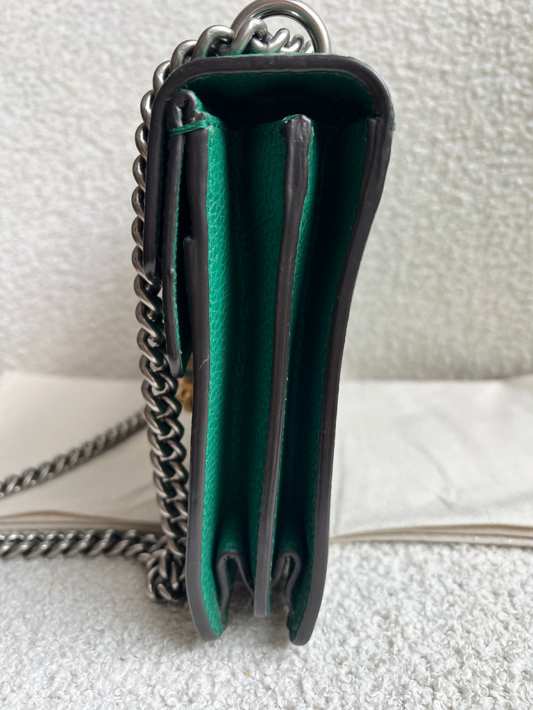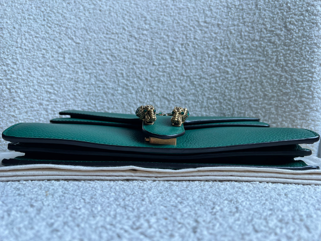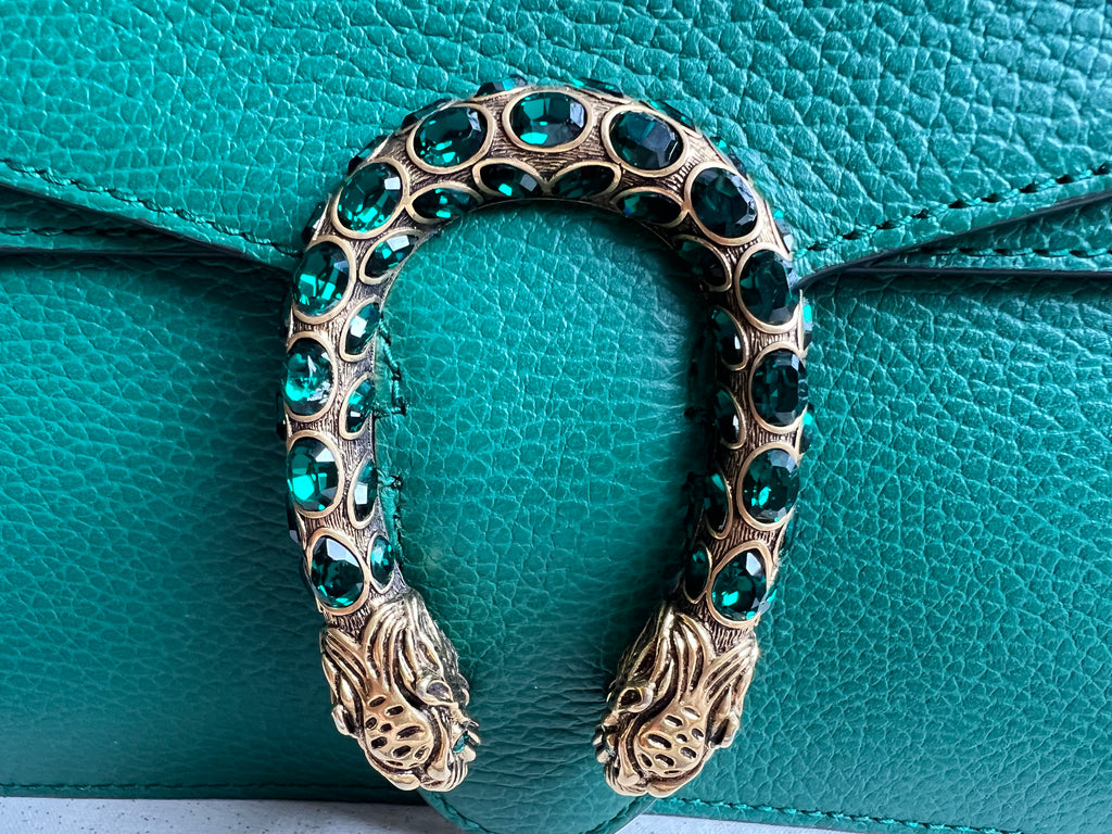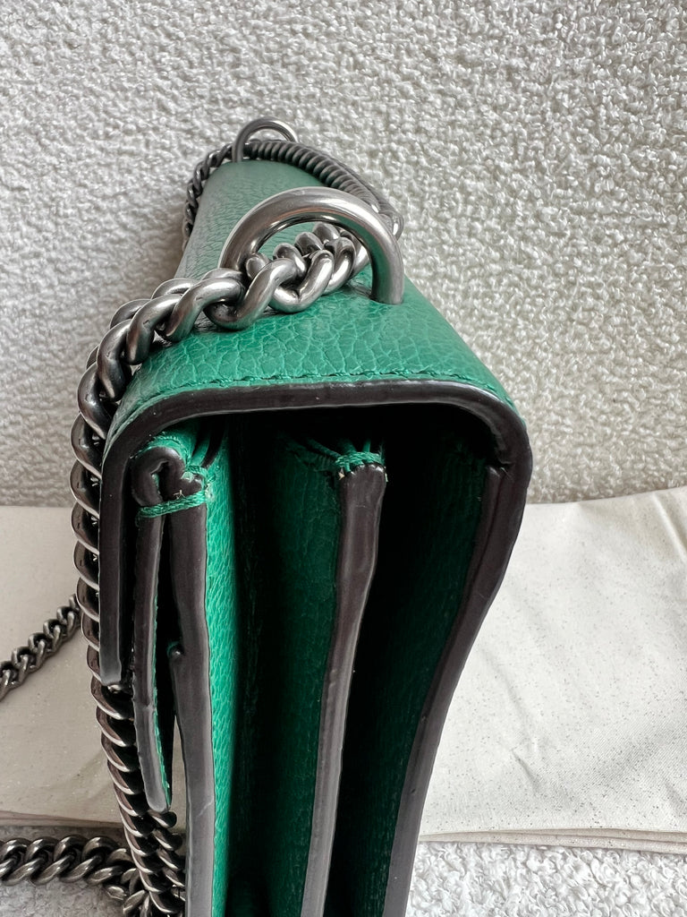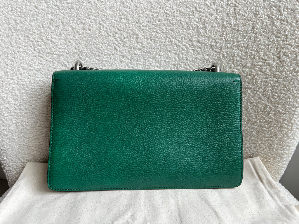 Gucci Small Dionysus GG Shoulder Bag in Green Grained Leather with silver hardware. The small Dionysus shoulder bag features the tiger head closure with Swarovski crystals. This iconic style is perfect for day or evening use. The sliding chain strap can be worn lengthened or doubled up over the shoulder or in the crook of the arm. Note the strap is not long enough to be worn cross body.
