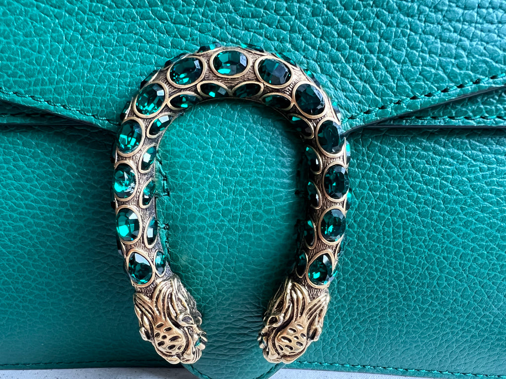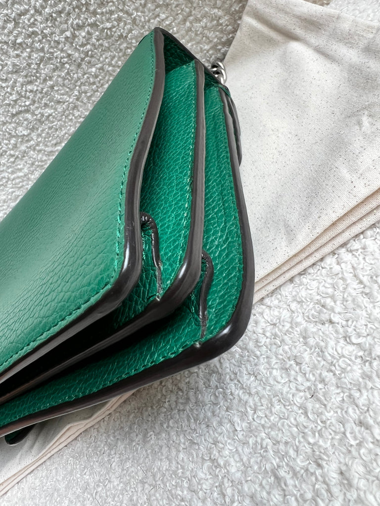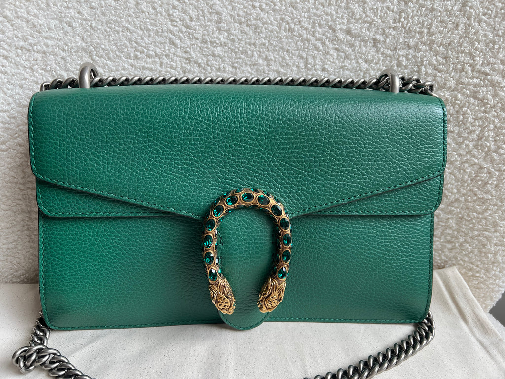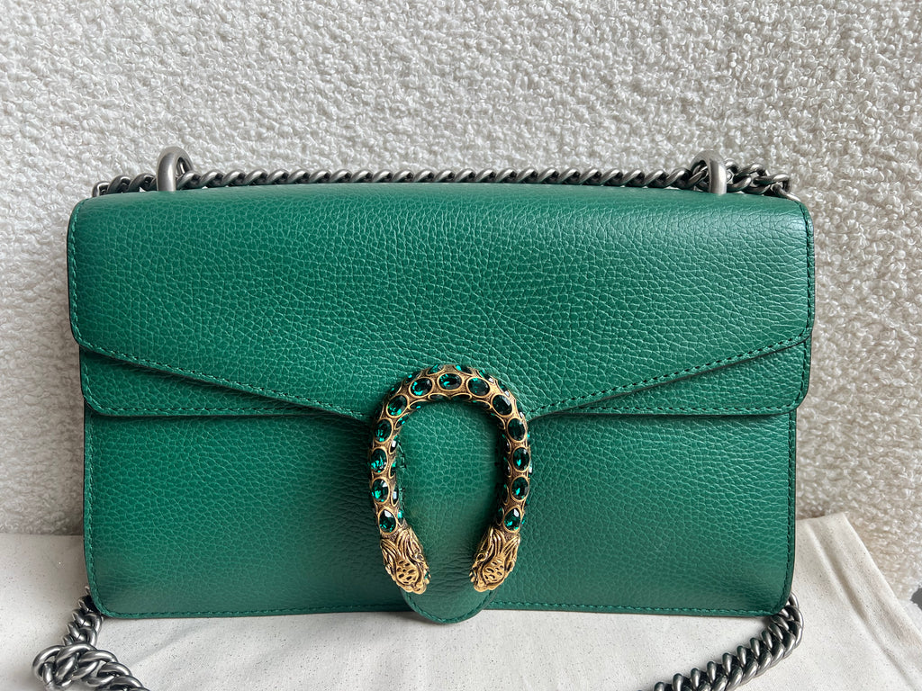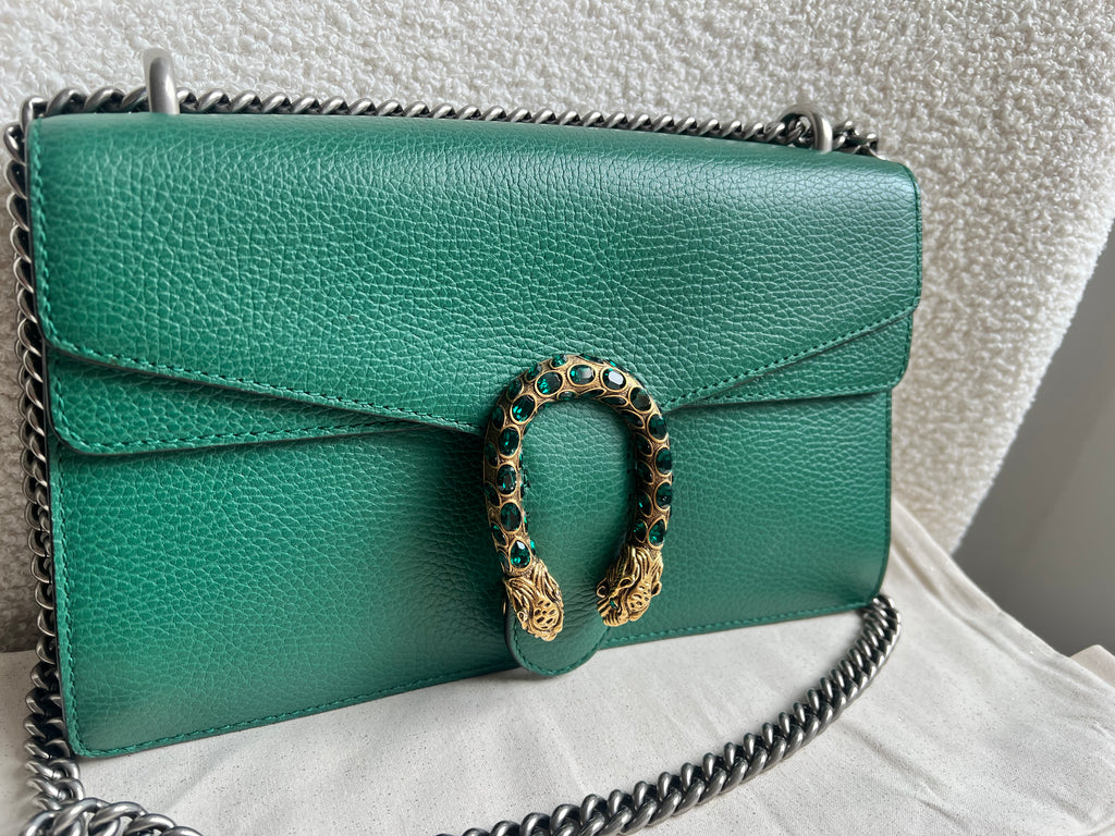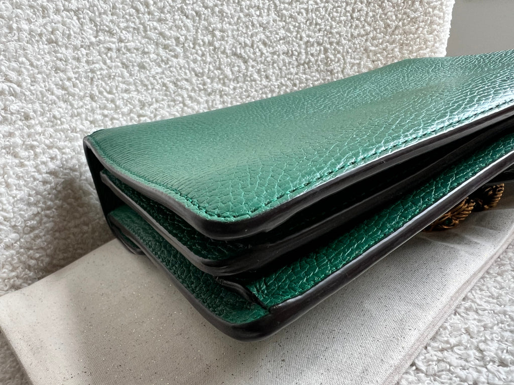 Gucci Small Dionysus GG Shoulder Bag in Green Grained Leather with silver hardware. The small Dionysus shoulder bag features the tiger head closure with Swarovski crystals. This iconic style is perfect for day or evening use. The sliding chain strap can be worn lengthened or doubled up over the shoulder or in the crook of the arm. Note the strap is not long enough to be worn cross body.