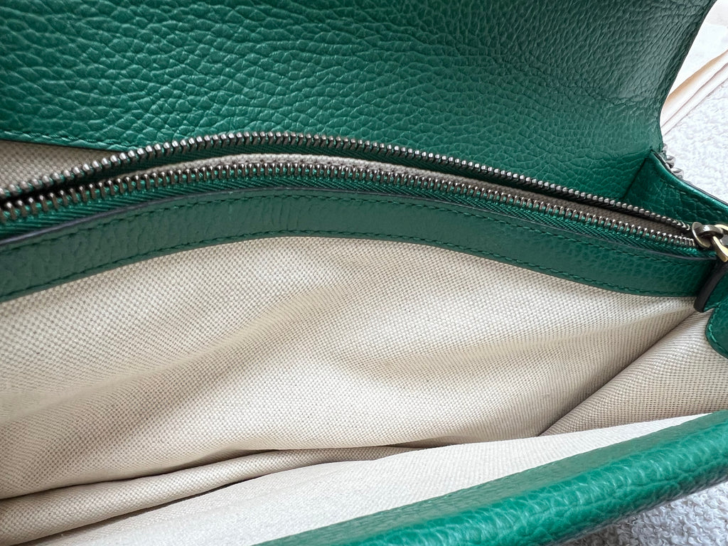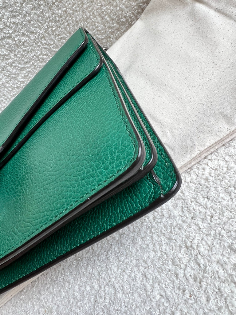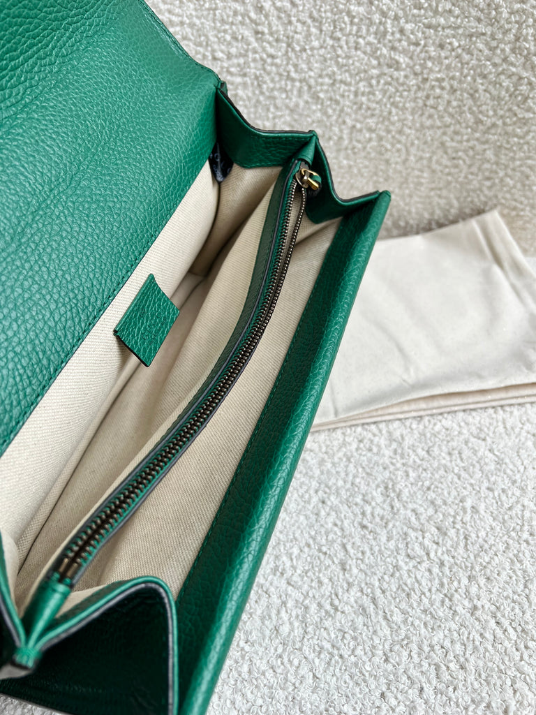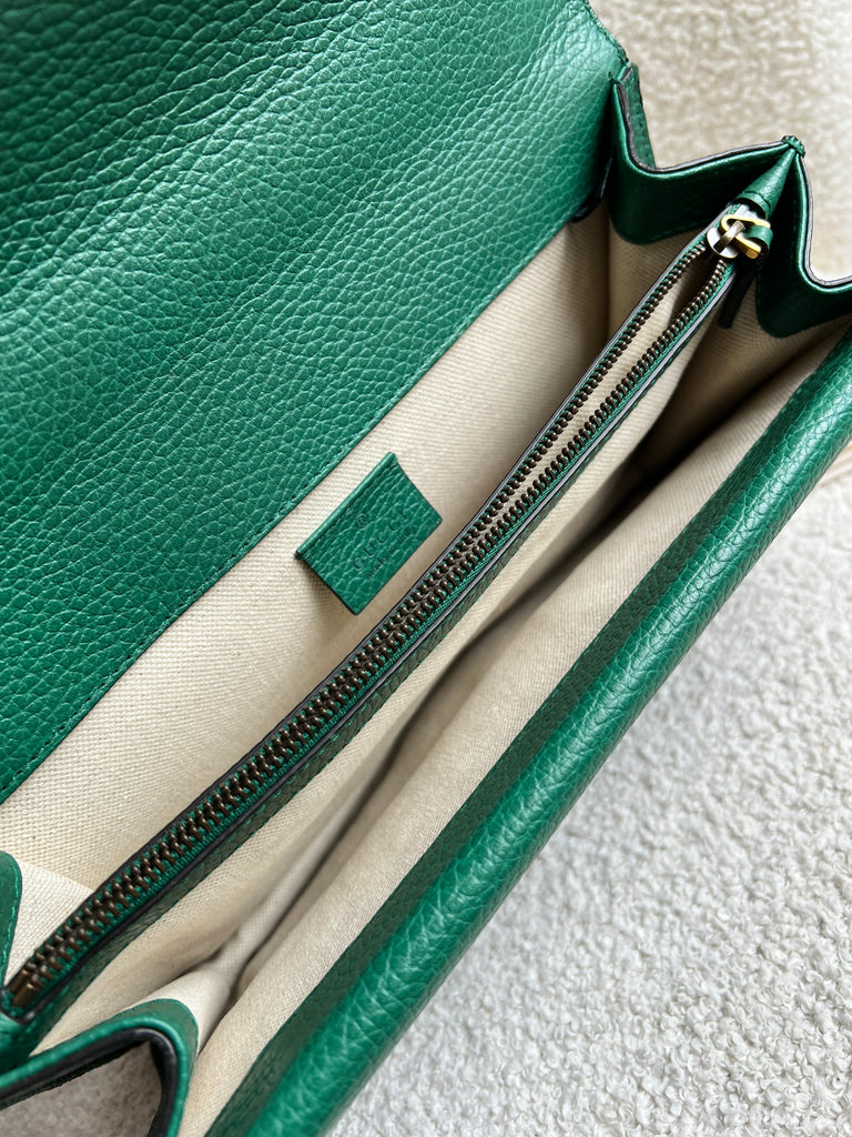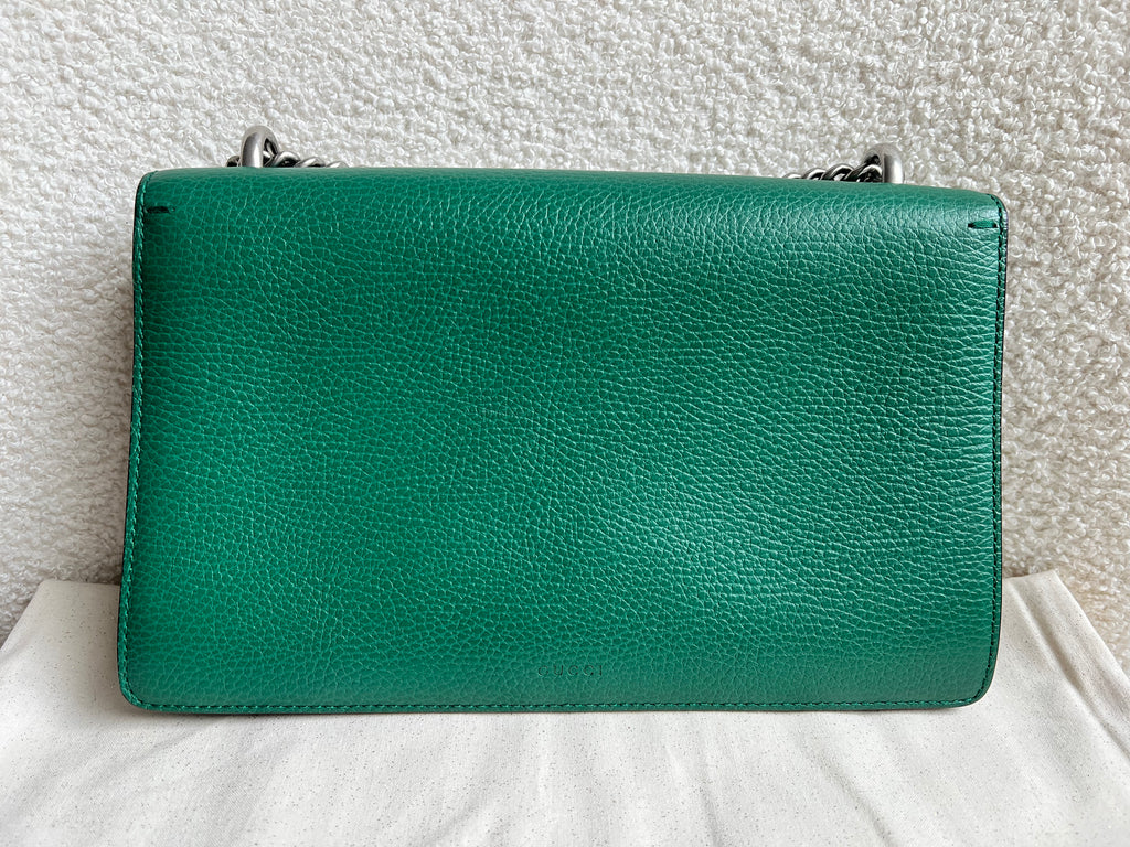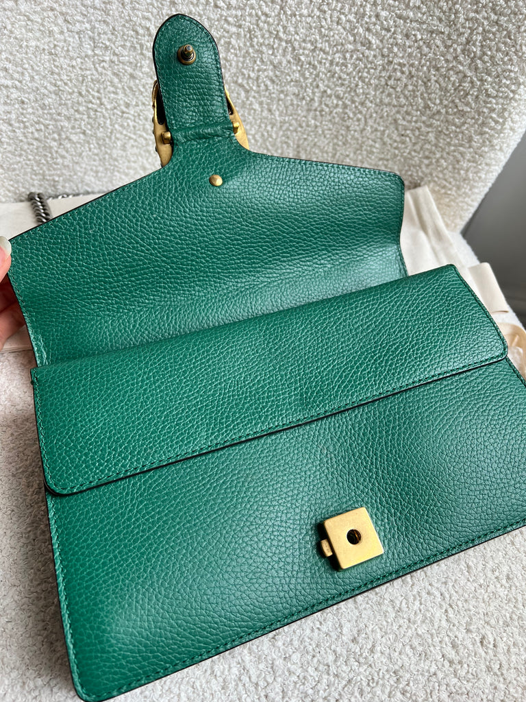 Gucci Small Dionysus GG Shoulder Bag in Green Grained Leather with silver hardware. The small Dionysus shoulder bag features the tiger head closure with Swarovski crystals. This iconic style is perfect for day or evening use. The sliding chain strap can be worn lengthened or doubled up over the shoulder or in the crook of the arm. Note the strap is not long enough to be worn cross body.