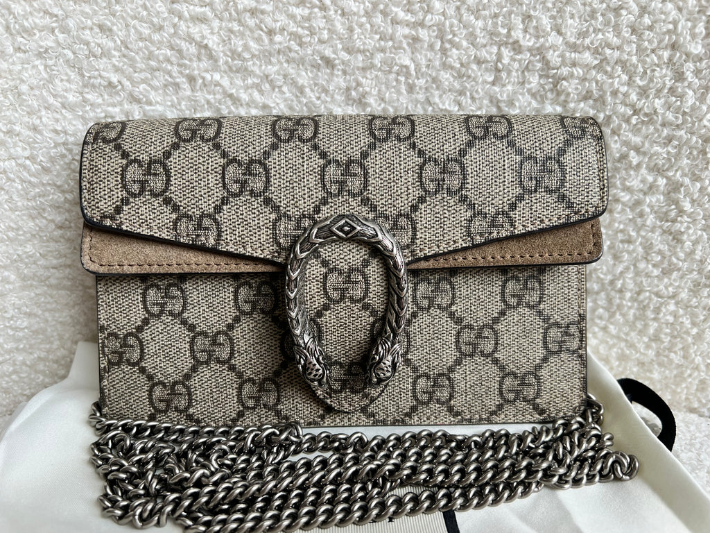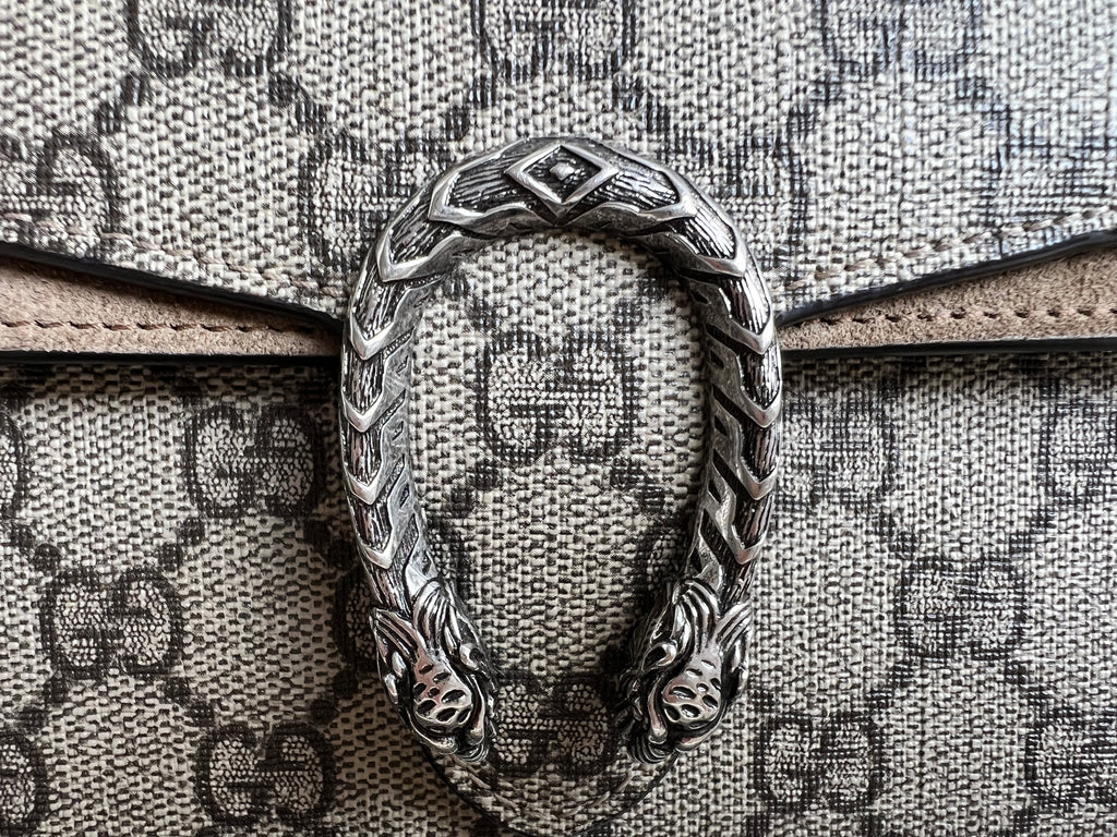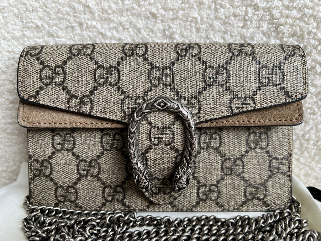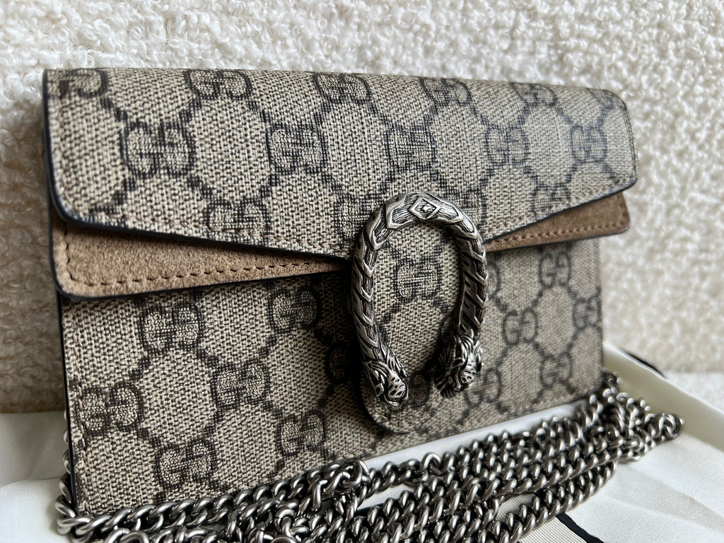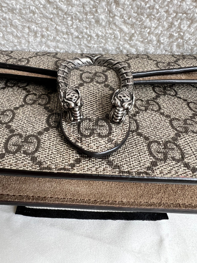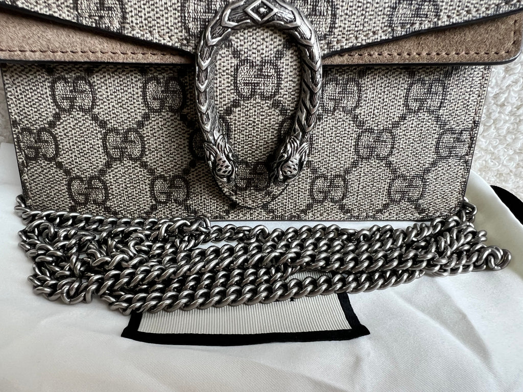 Gucci Super Mini Dionysus GG Shoulder Bag in Supreme Canvas. The super mini Dionysus shoulder bag is presented in the signature GG pattern, trimmed with taupe suede details. Featuring the tiger head closure, this mini style is perfect for those who only need to carry the essentials. Can be worn over shoulder or cross body for either day or evening wear. Chain can also be detached and used as a handheld clutch.