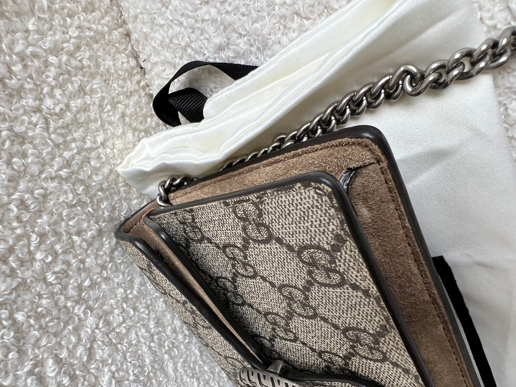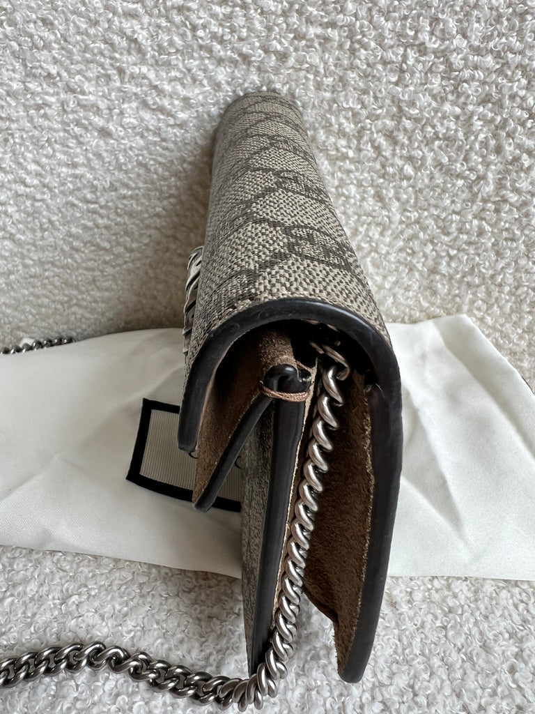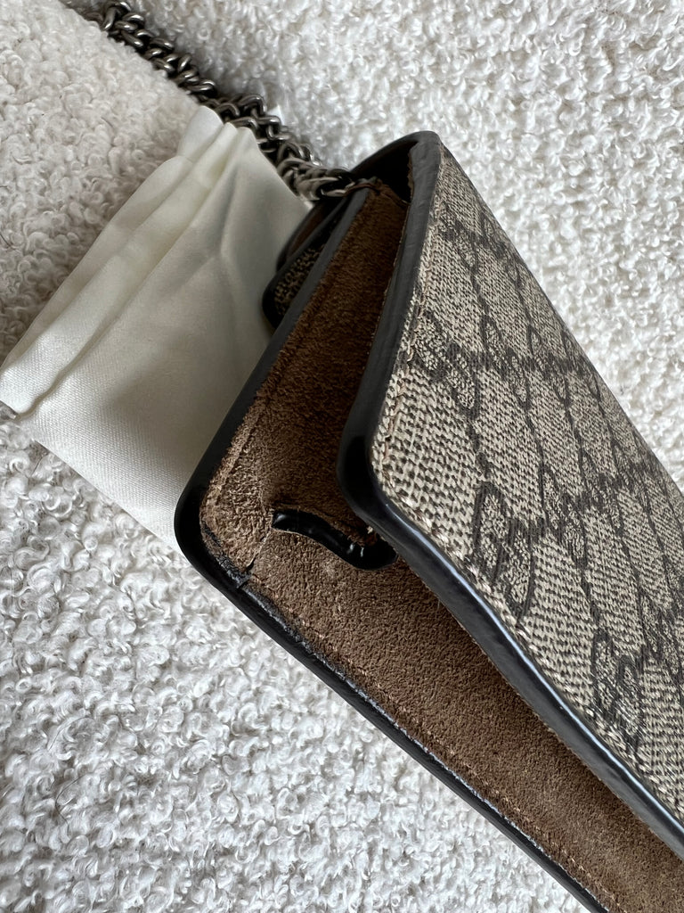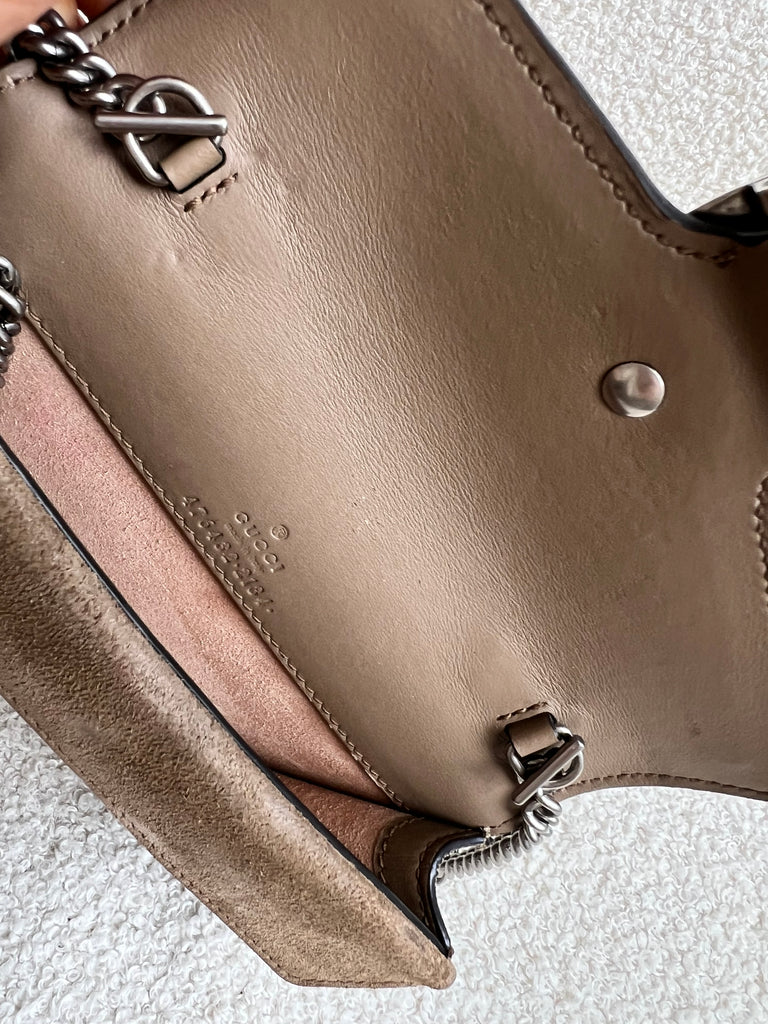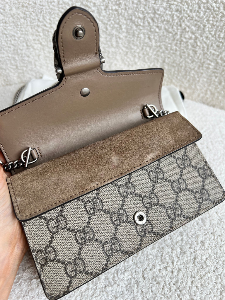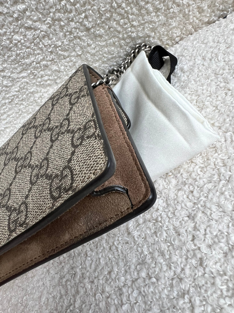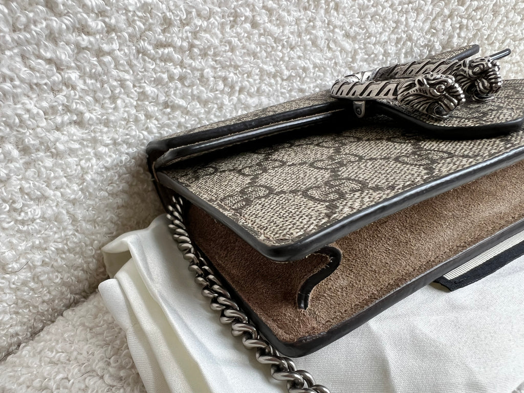 Gucci Super Mini Dionysus GG Shoulder Bag in Supreme Canvas. The super mini Dionysus shoulder bag is presented in the signature GG pattern, trimmed with taupe suede details. Featuring the tiger head closure, this mini style is perfect for those who only need to carry the essentials. Can be worn over shoulder or cross body for either day or evening wear. Chain can also be detached and used as a handheld clutch.