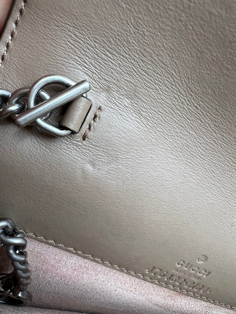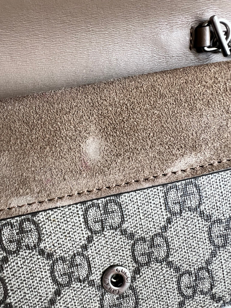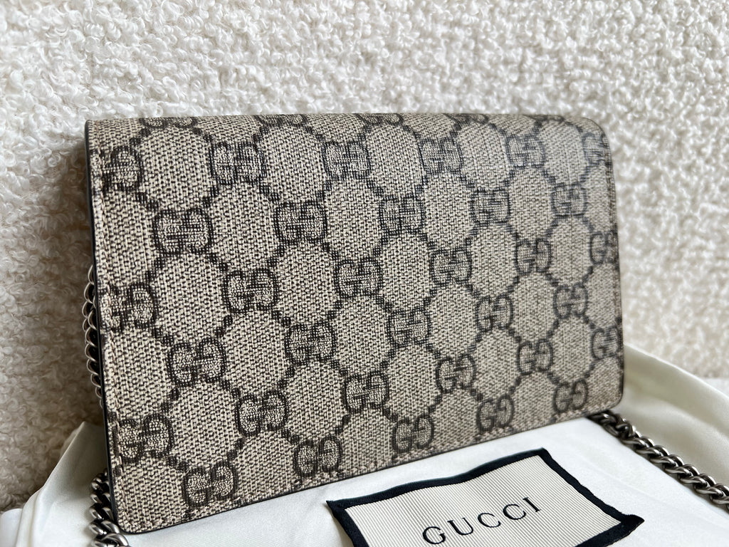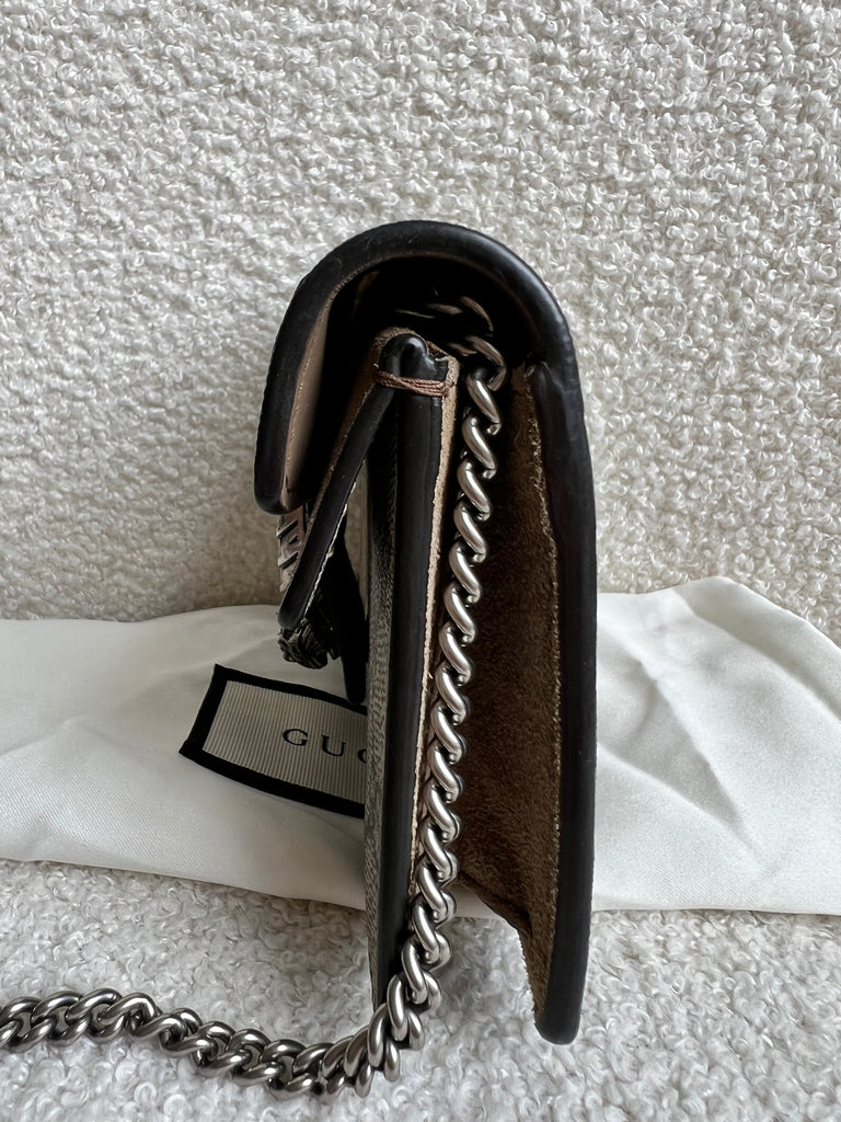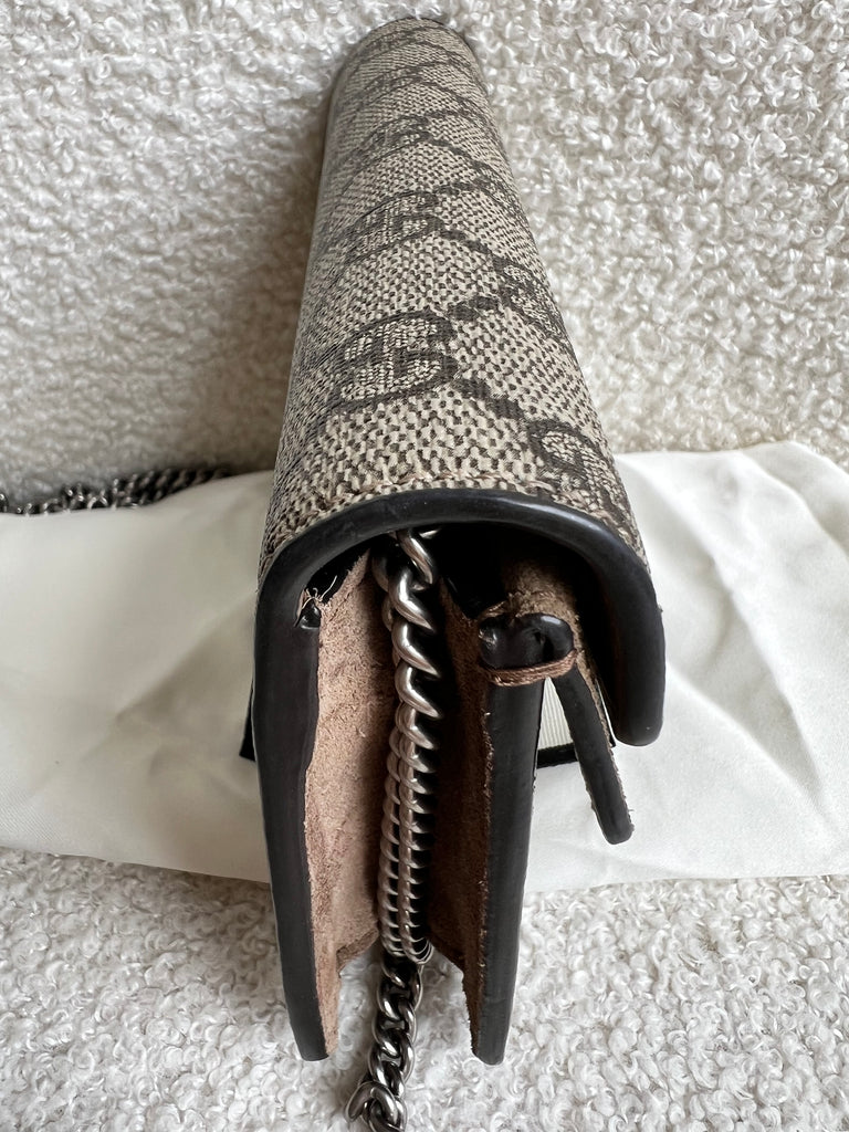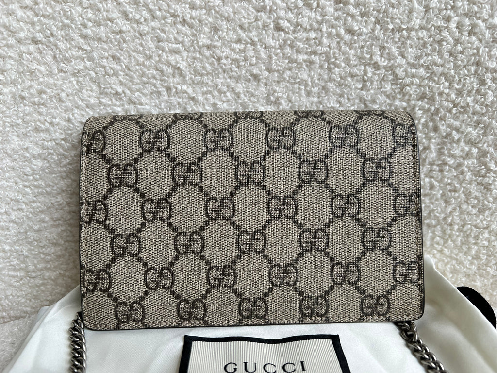 Gucci Super Mini Dionysus GG Shoulder Bag in Supreme Canvas. The super mini Dionysus shoulder bag is presented in the signature GG pattern, trimmed with taupe suede details. Featuring the tiger head closure, this mini style is perfect for those who only need to carry the essentials. Can be worn over shoulder or cross body for either day or evening wear. Chain can also be detached and used as a handheld clutch.