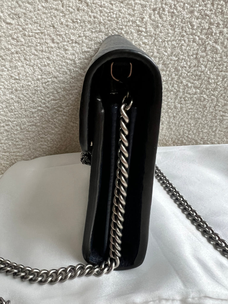 Gucci Dionysus Mini Chain bag in nany grained calf leather with antique silver hardware. This chain wallet style features the textured tiger head press stud closure. The tiger head is enriched with Swarovski crystal stones. Ideal for evening or event wear. Can be carried over the shoulder or cross body, or carried as a handheld clutch with the detachable strap removed. Note image 2 shows black version for size reference.