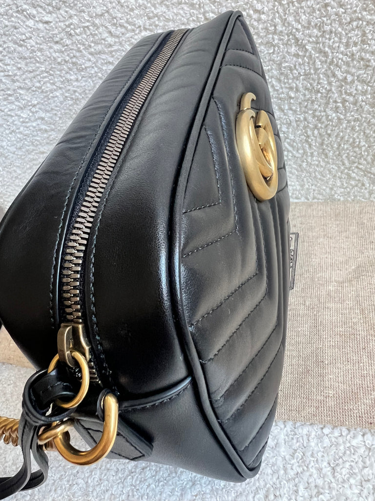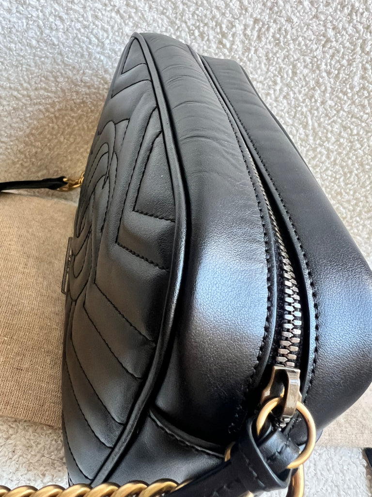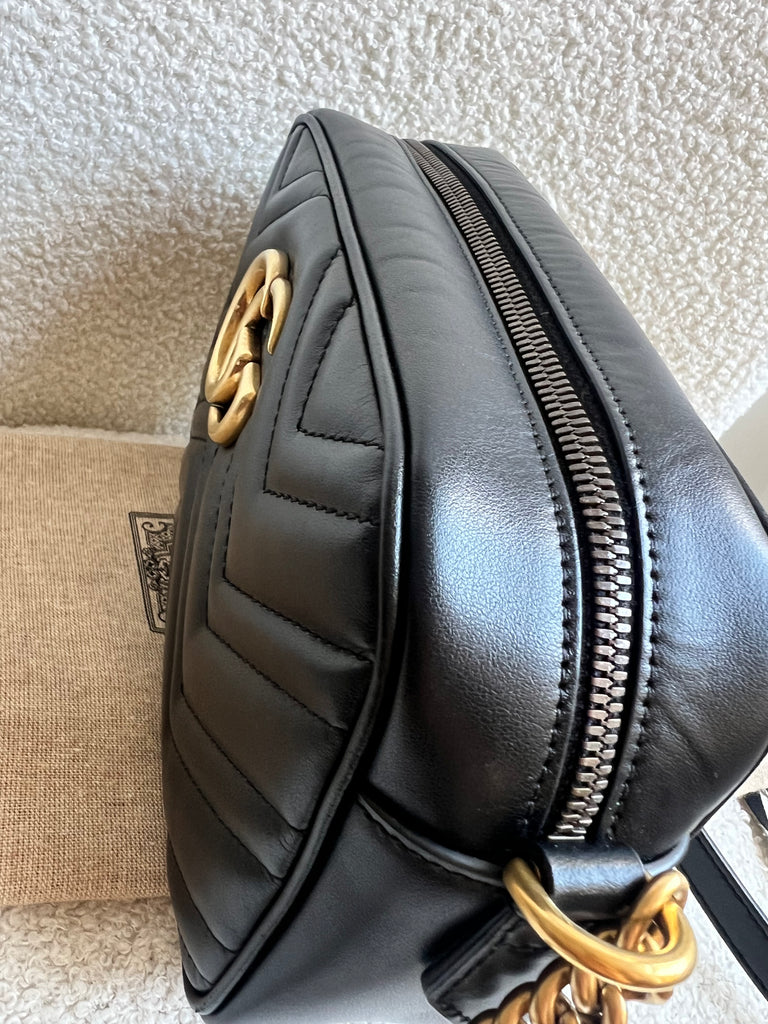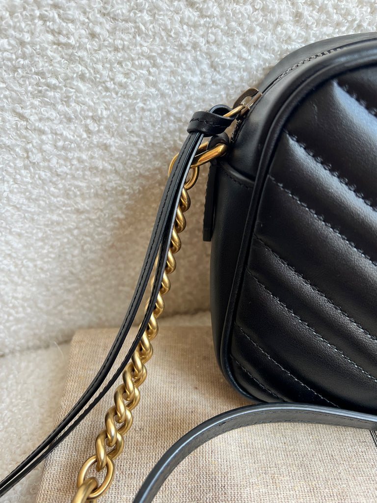 Gucci GG Marmont small shoulder bag in black chevron matelassé leather with gold hardware. This small Marmont chain camera style bag has a softly structured shape and zip top closure. Effortlessly chic and sophisticated, this style can be worn both with a casual outfit or for evening wear. Suitable for both day to day or occasion wear and ideal for those who prefer a cross body option.