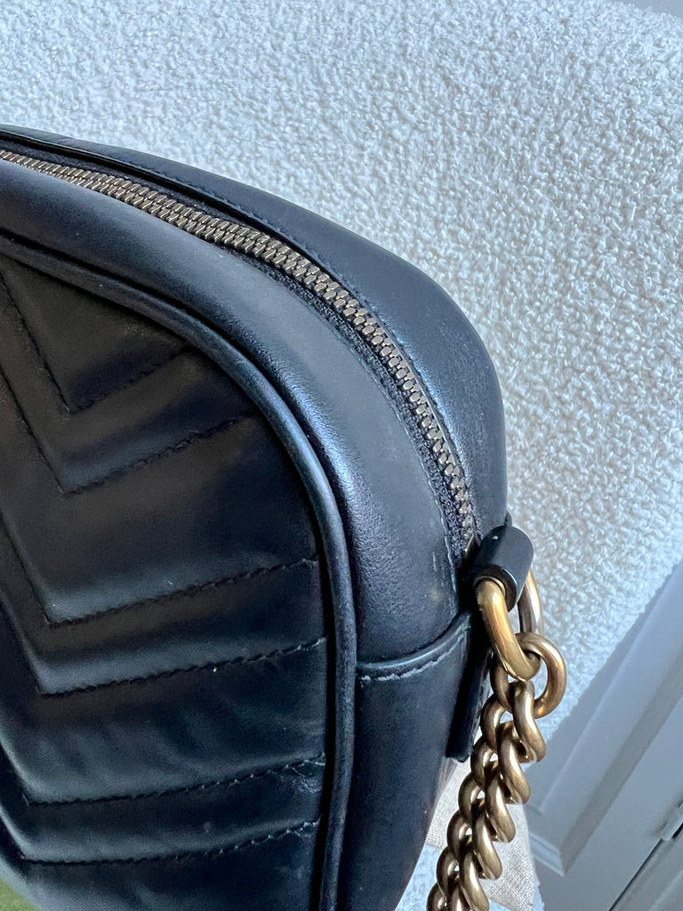 Gucci GG Marmont small shoulder bag in black chevron matelassé leather with gold hardware. This small Marmont chain camera style bag has a softly structured shape and zip top closure. Effortlessly chic and sophisticated, this style can be worn both with a casual outfit or for evening wear. Suitable for both day to day or occasion wear and ideal for those who prefer a cross body option.