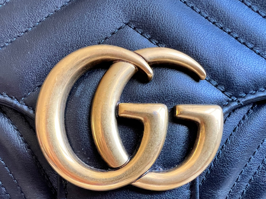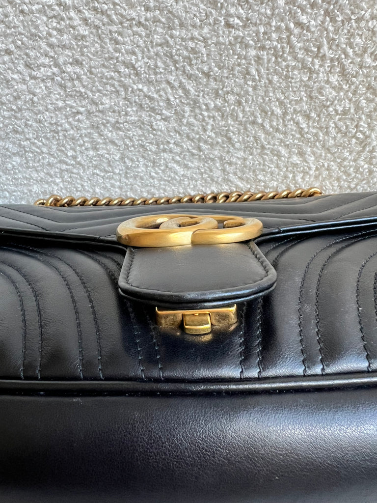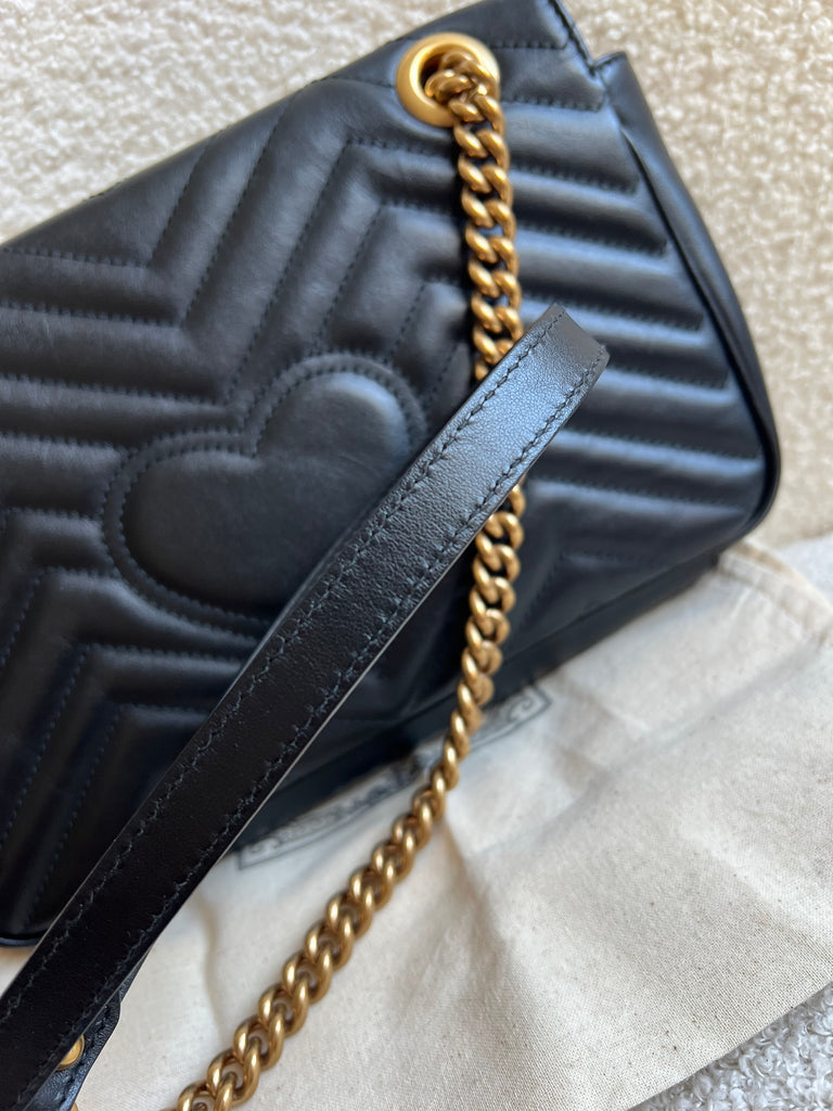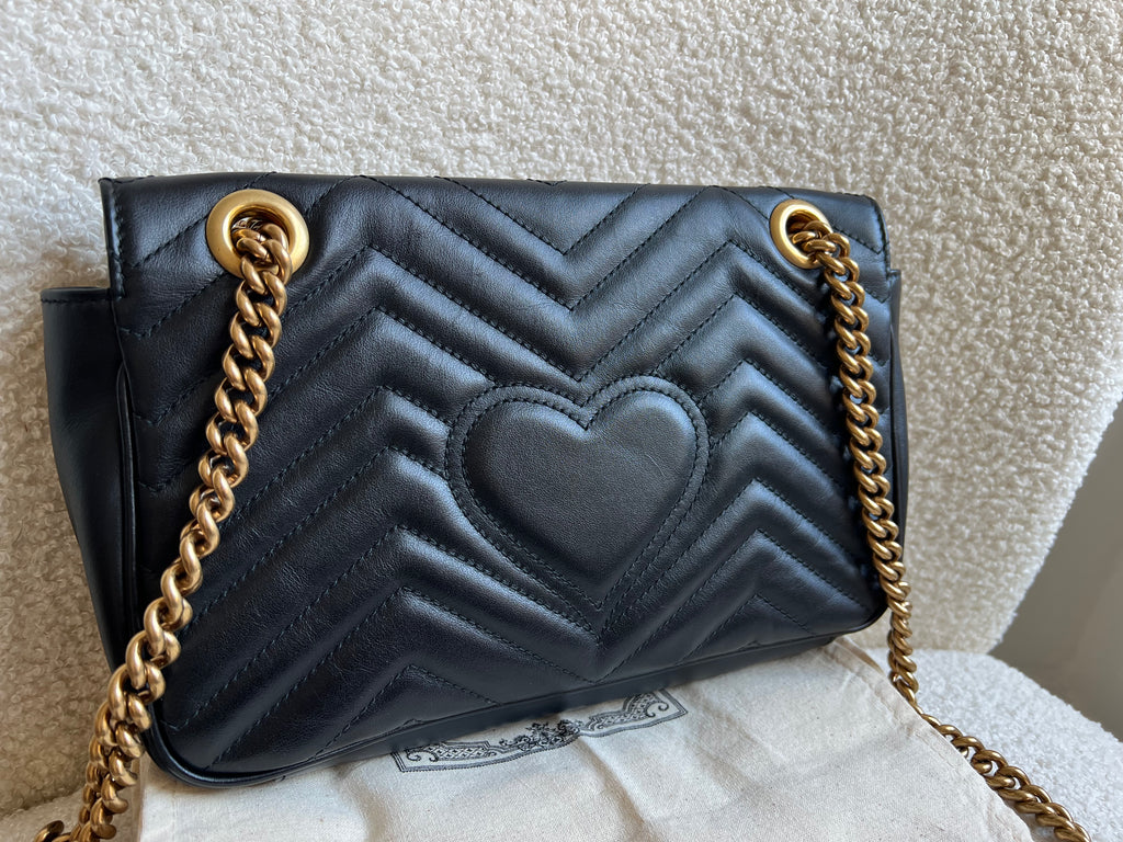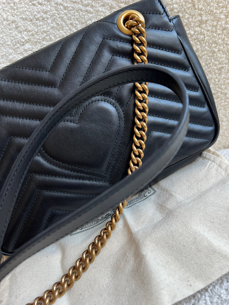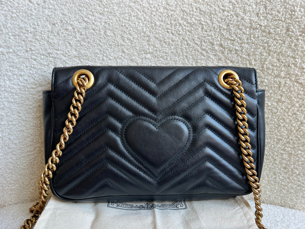Gucci GG Marmont small shoulder bag in black matelasse leather with gold hardware. This small Marmont bag has a softly structured shape and an oversized flap with GG hardware and heart detail on the back. The sliding chain can be worn multiple ways either doubled up or lengthened. Effortlessly chic and sophisticated, this style can be worn both with a casual outfit or for evening wear. Suitable for both event or occasion wear and ideal for those who prefer a cross body option.