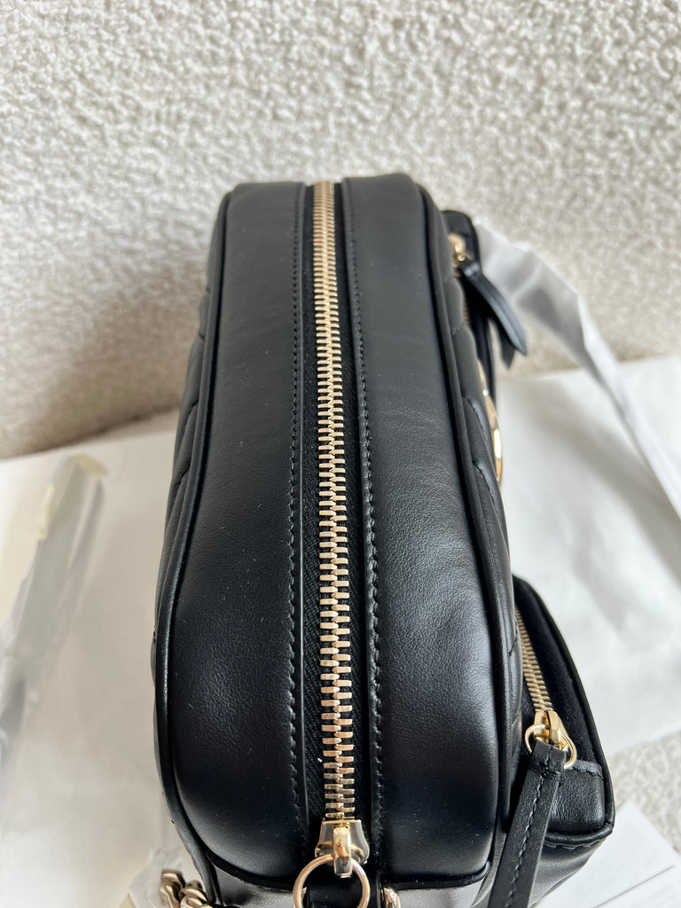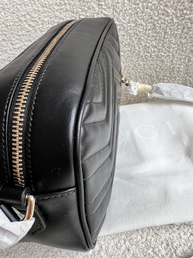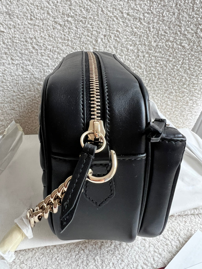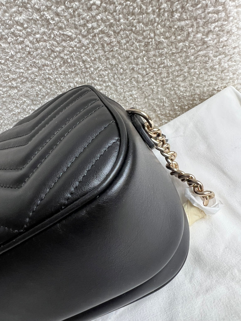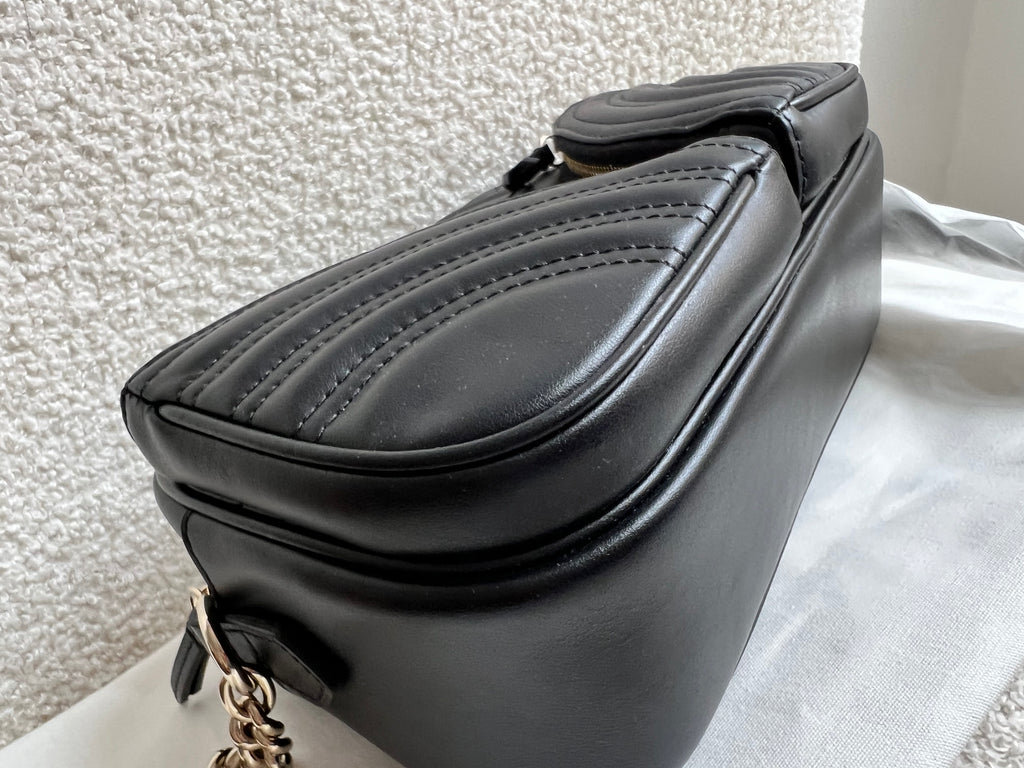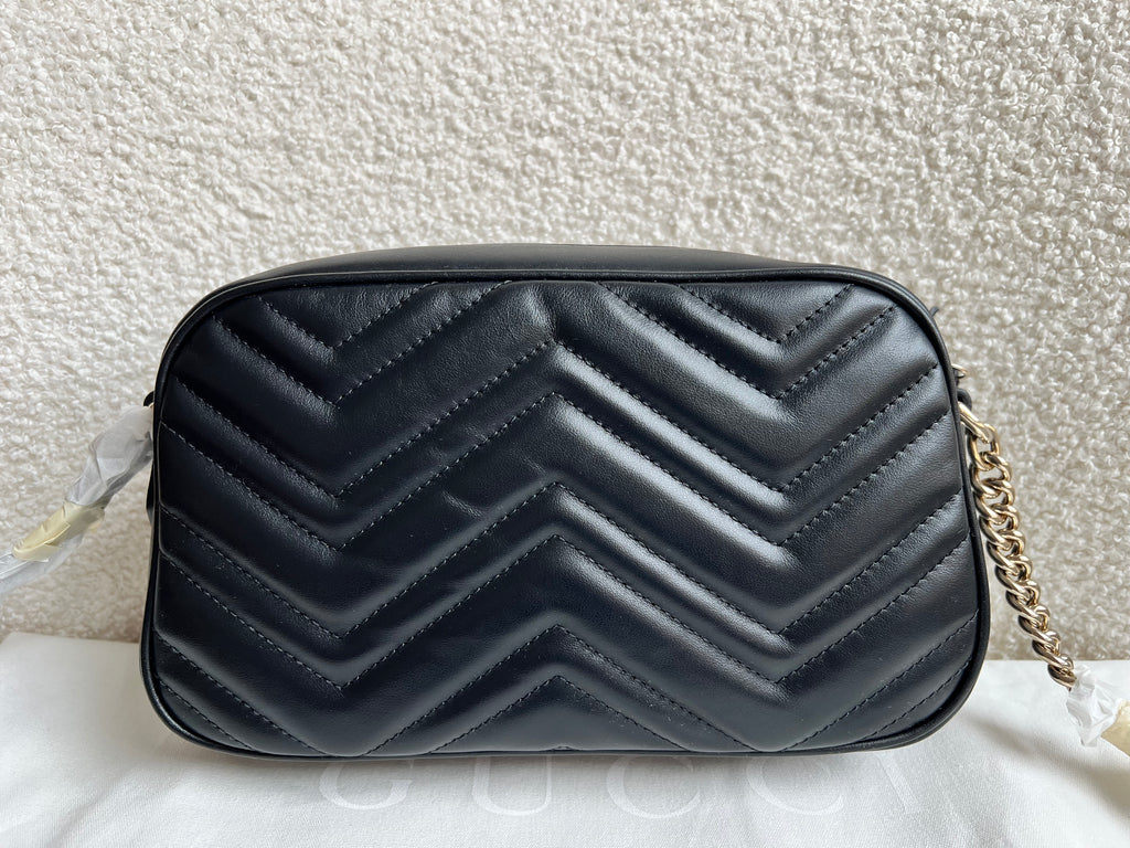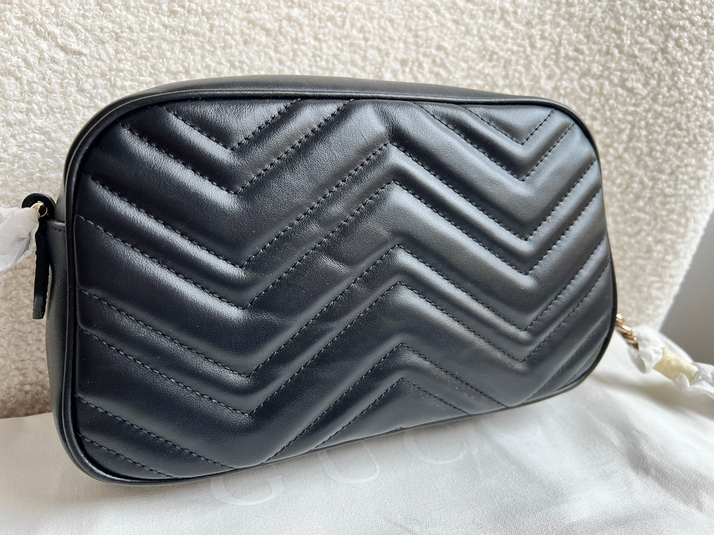 Gucci GG Marmont multipocket shoulder bag in black chevron matelassé leather with gold hardware. This small Marmont chain camera style bag has a softly structured shape and zip top closure. Effortlessly chic and sophisticated, this style can be worn both with a casual outfit or for evening wear. Suitable for both day to day or occasion wear and ideal for those who prefer a cross body option.