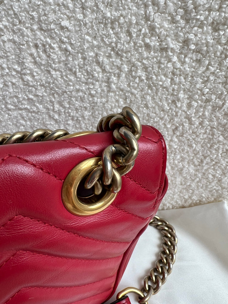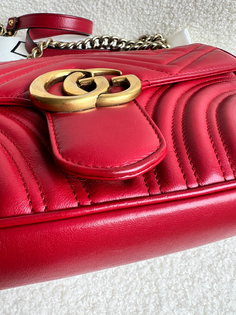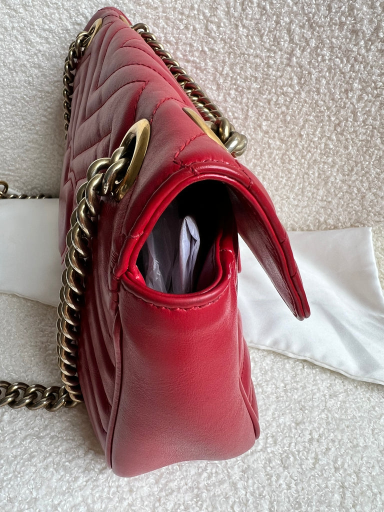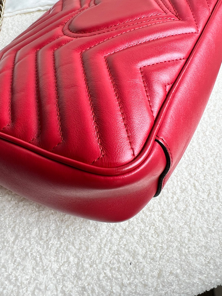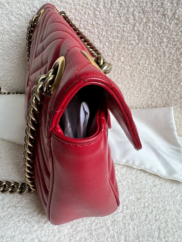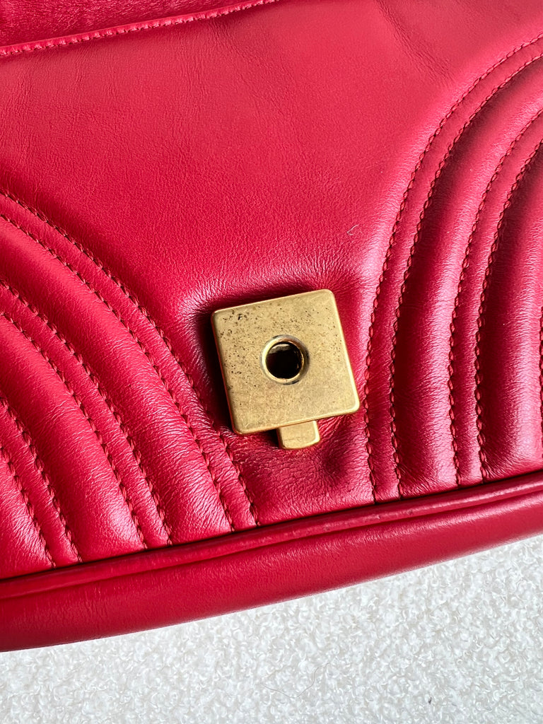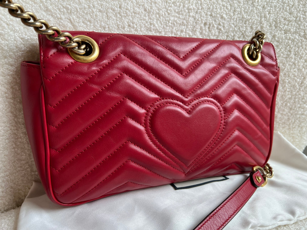 Gucci GG Marmont small shoulder bag in hibiscus red matelasse chevron leather with gold hardware. This small Marmont bag has a softly structured shape and an oversized flap with GG hardware and heart detail on the back. The sliding chain can be worn multiple ways either doubled up or lengthened. Effortlessly chic and sophisticated, this style can be worn both with a casual outfit or for evening wear. Suitable for both day to day or occasion wear and ideal for those who prefer a cross body option.