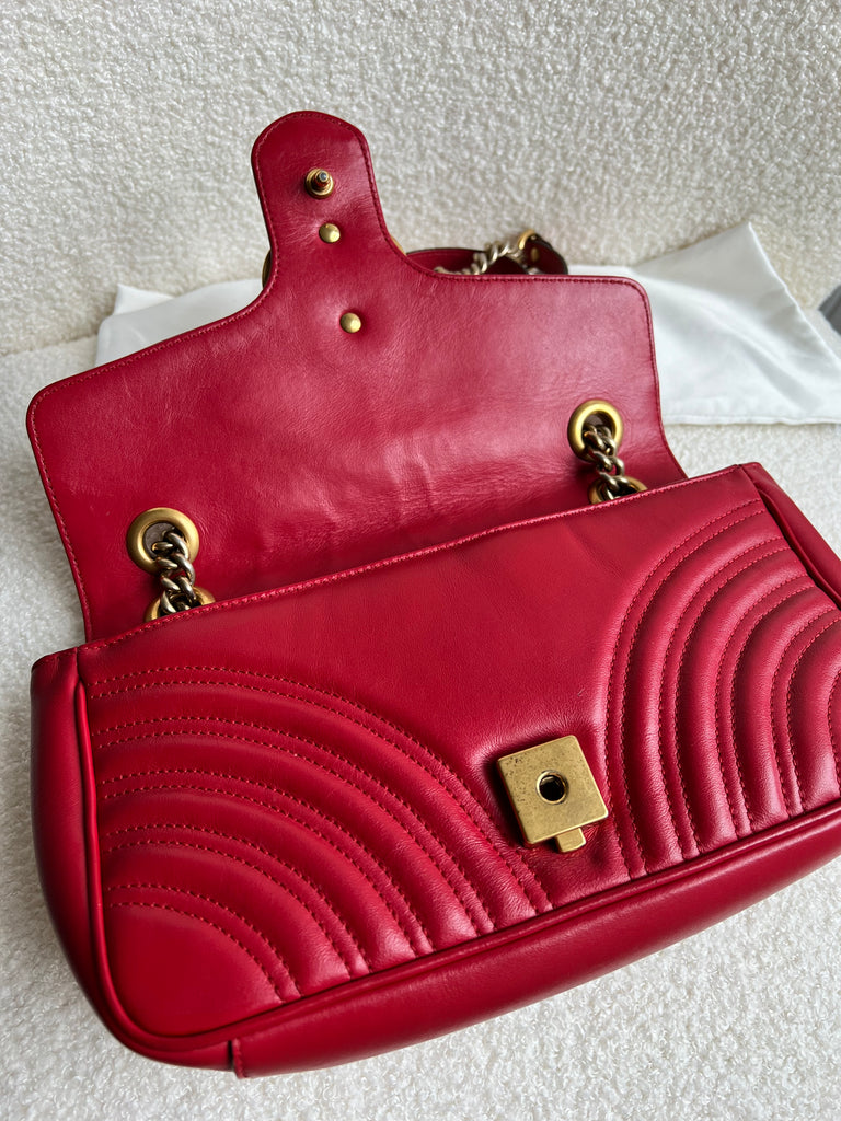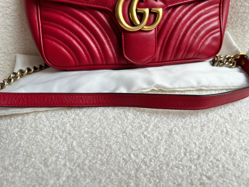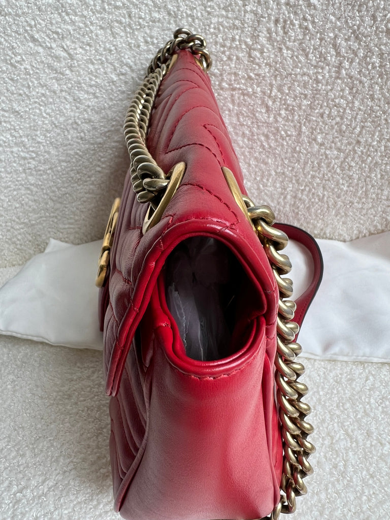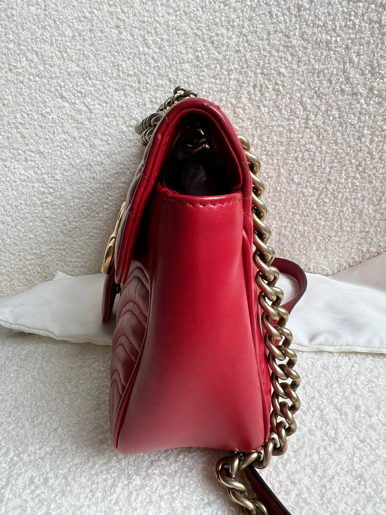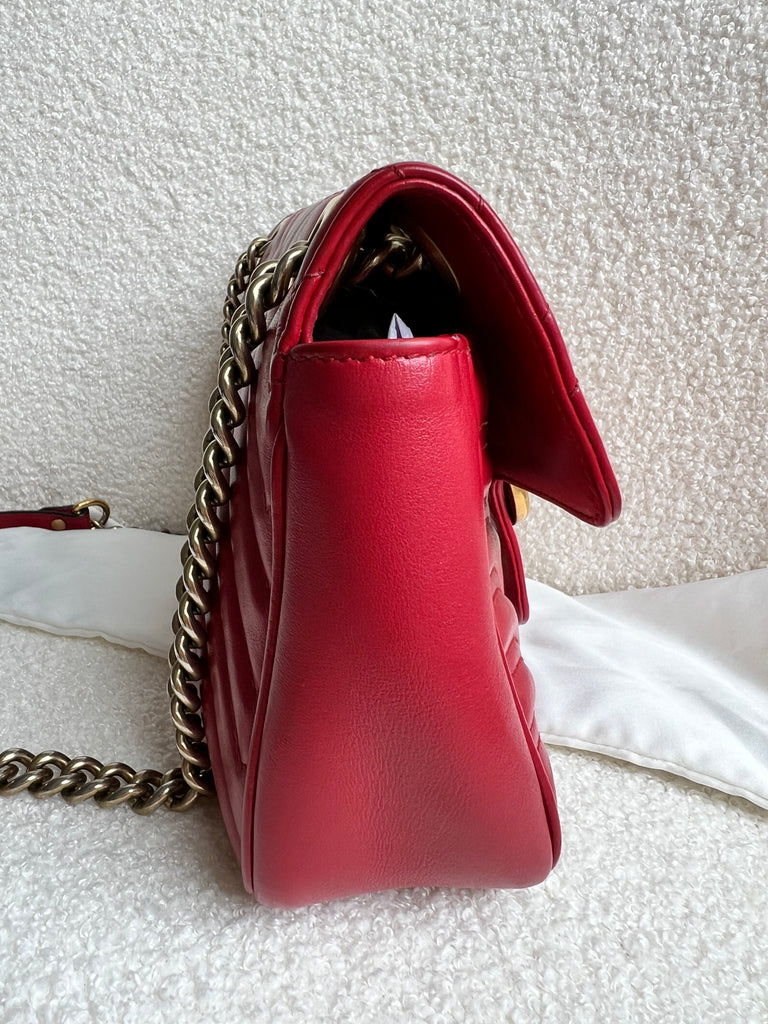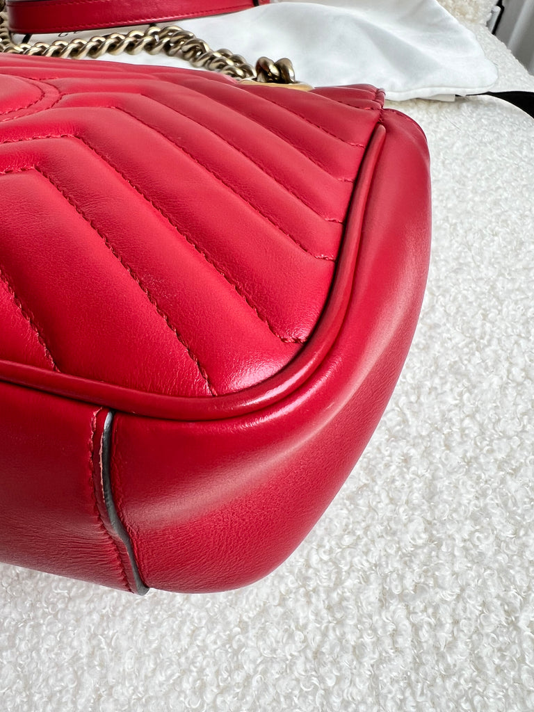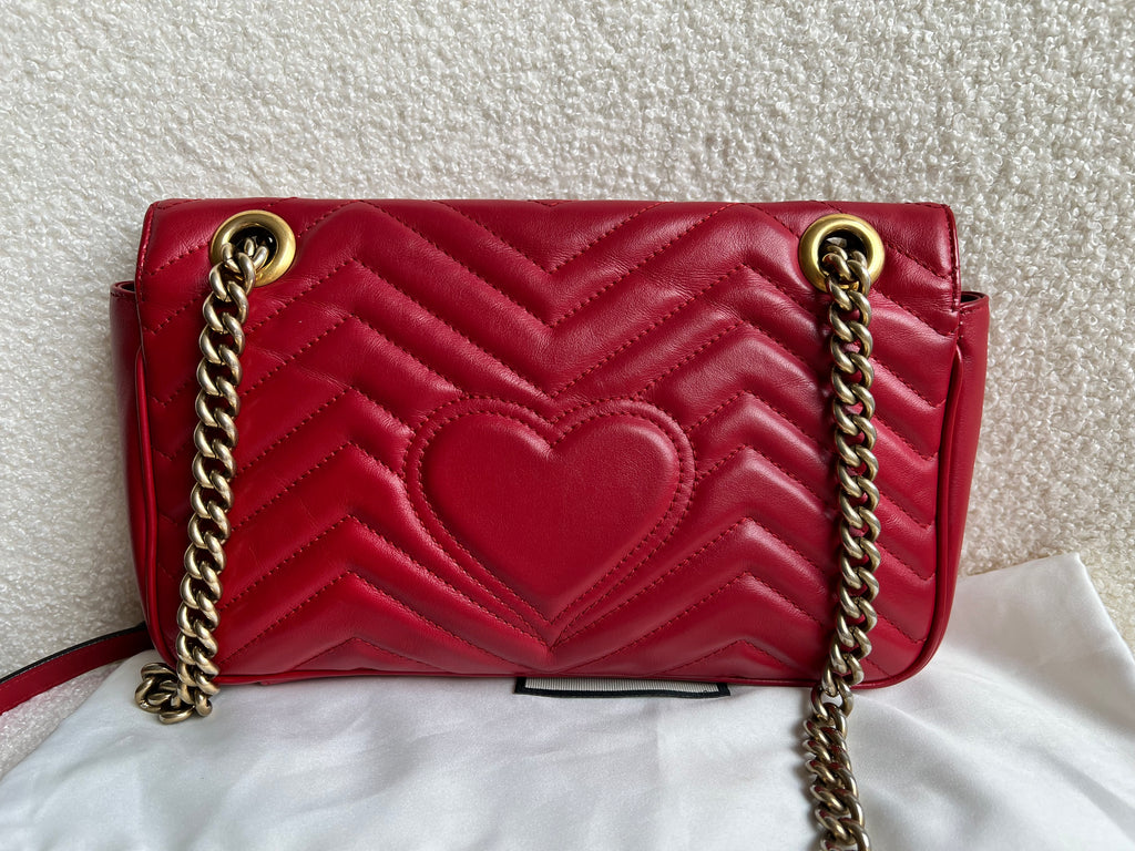 Gucci GG Marmont small shoulder bag in hibiscus red matelasse chevron leather with gold hardware. This small Marmont bag has a softly structured shape and an oversized flap with GG hardware and heart detail on the back. The sliding chain can be worn multiple ways either doubled up or lengthened. Effortlessly chic and sophisticated, this style can be worn both with a casual outfit or for evening wear. Suitable for both day to day or occasion wear and ideal for those who prefer a cross body option.