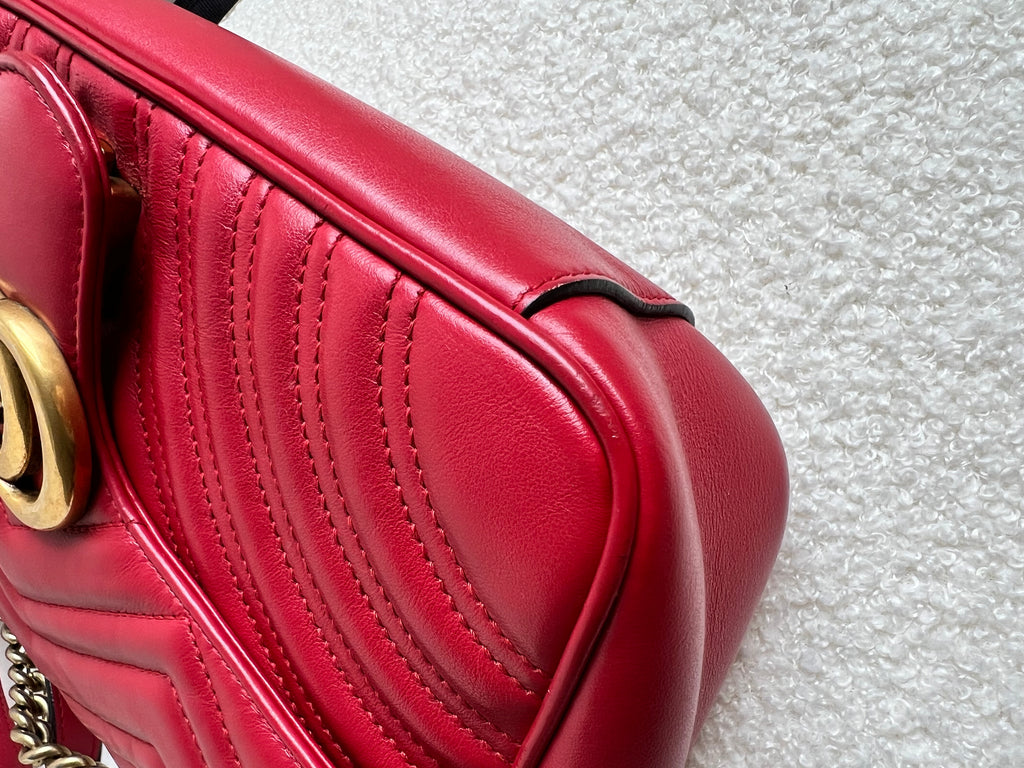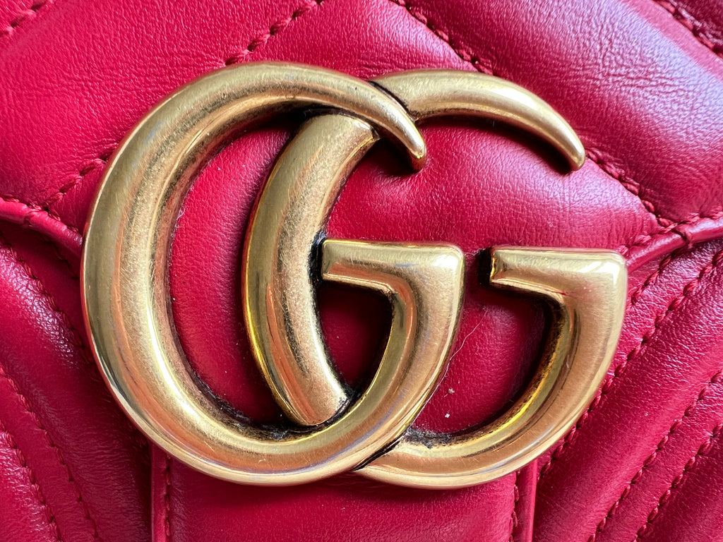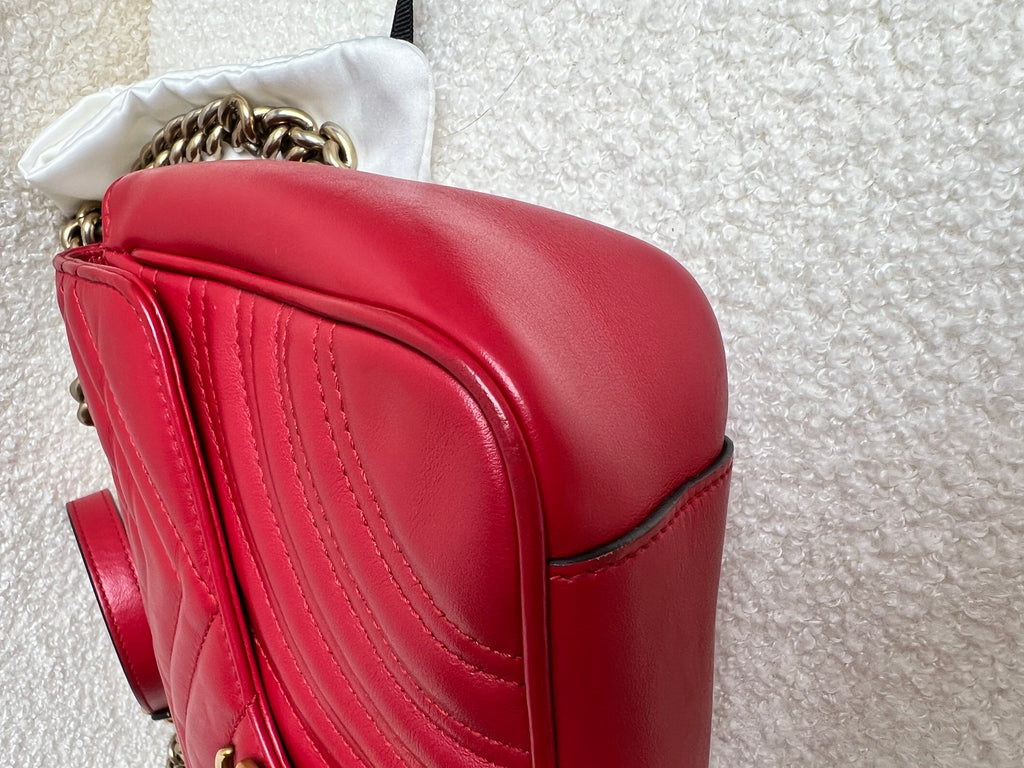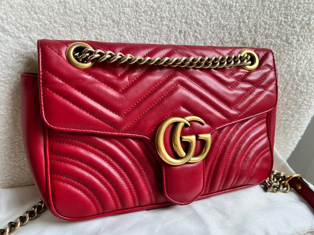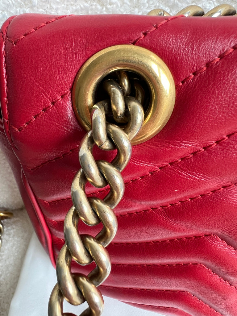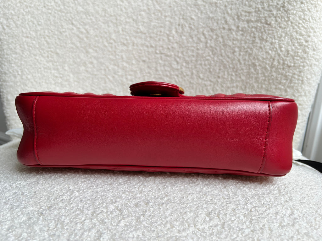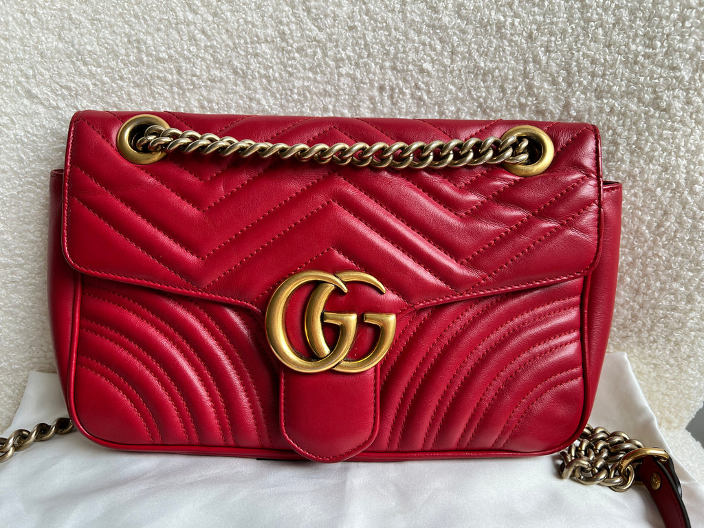 Gucci GG Marmont small shoulder bag in hibiscus red matelasse chevron leather with gold hardware. This small Marmont bag has a softly structured shape and an oversized flap with GG hardware and heart detail on the back. The sliding chain can be worn multiple ways either doubled up or lengthened. Effortlessly chic and sophisticated, this style can be worn both with a casual outfit or for evening wear. Suitable for both day to day or occasion wear and ideal for those who prefer a cross body option.
