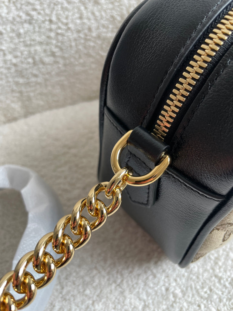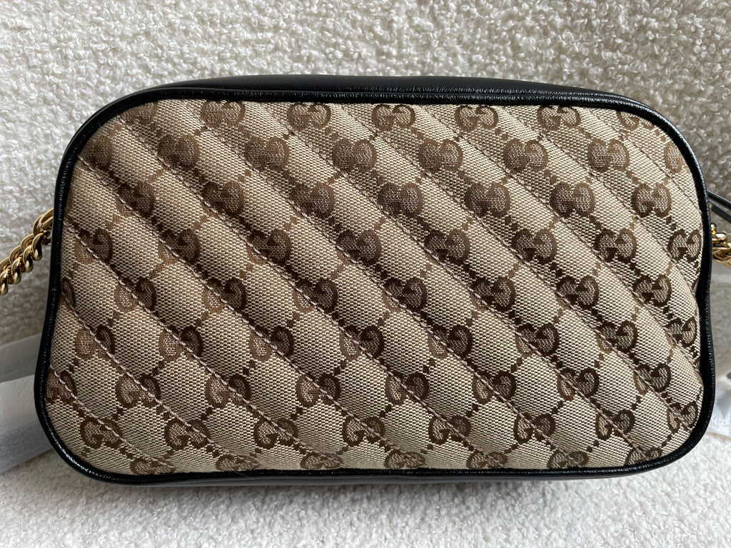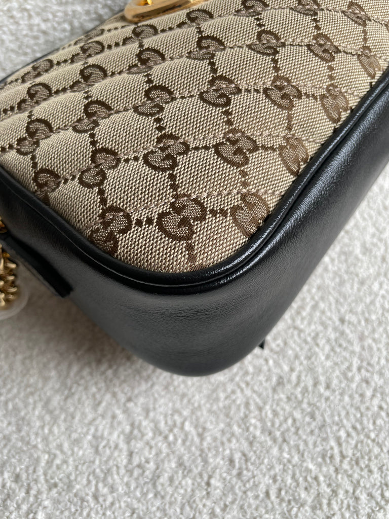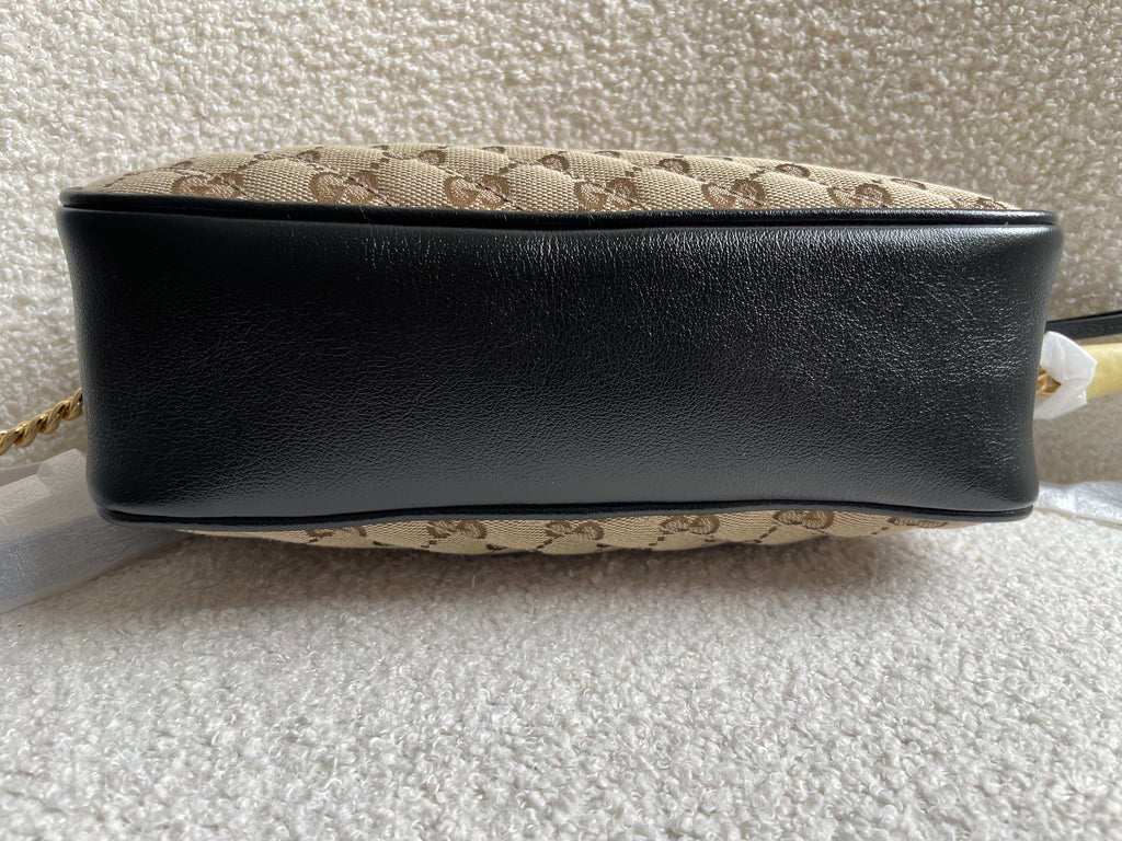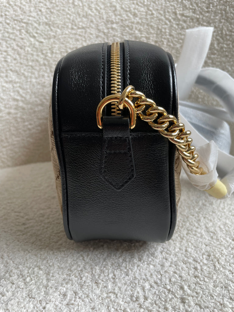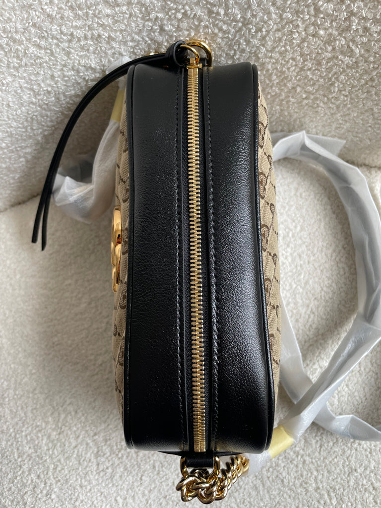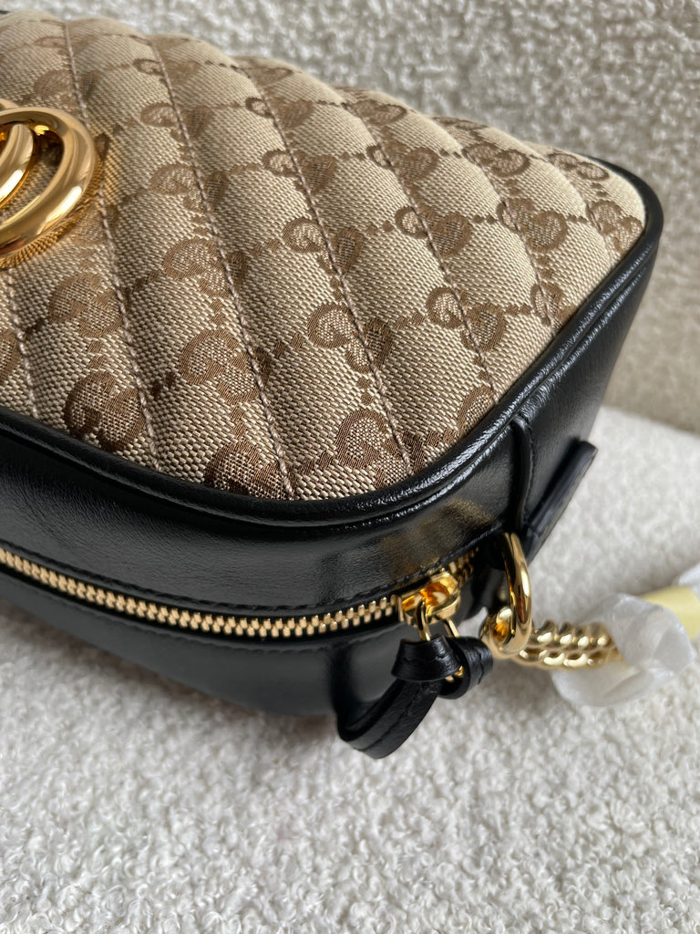Gucci GG Marmont Small Bag in Beige/ebony GG canvas with shiny gold hardware. This small Marmont chain camera style bag has a softly structured shape and zip top closure. Effortlessly chic and sophisticated, this style can be worn both with a casual outfit or for evening wear. Suitable for both day to day or occasion wear and ideal for those who prefer a cross body option.