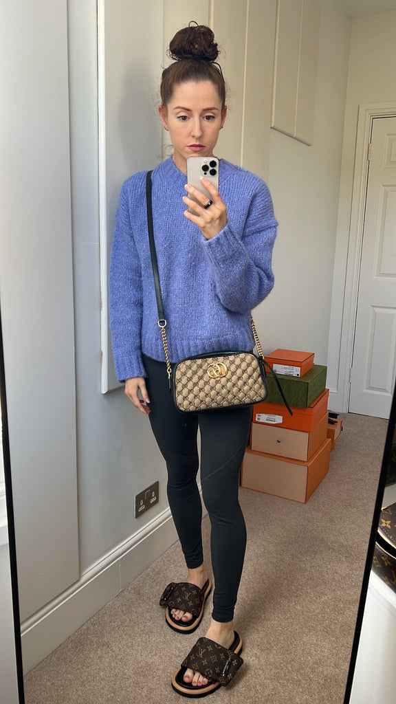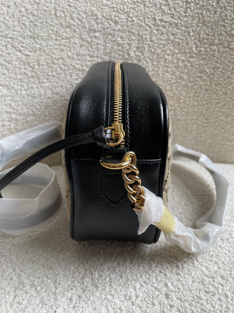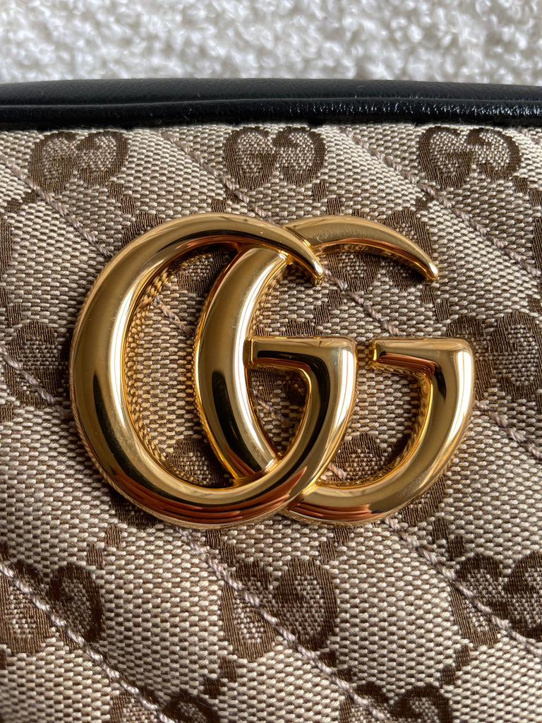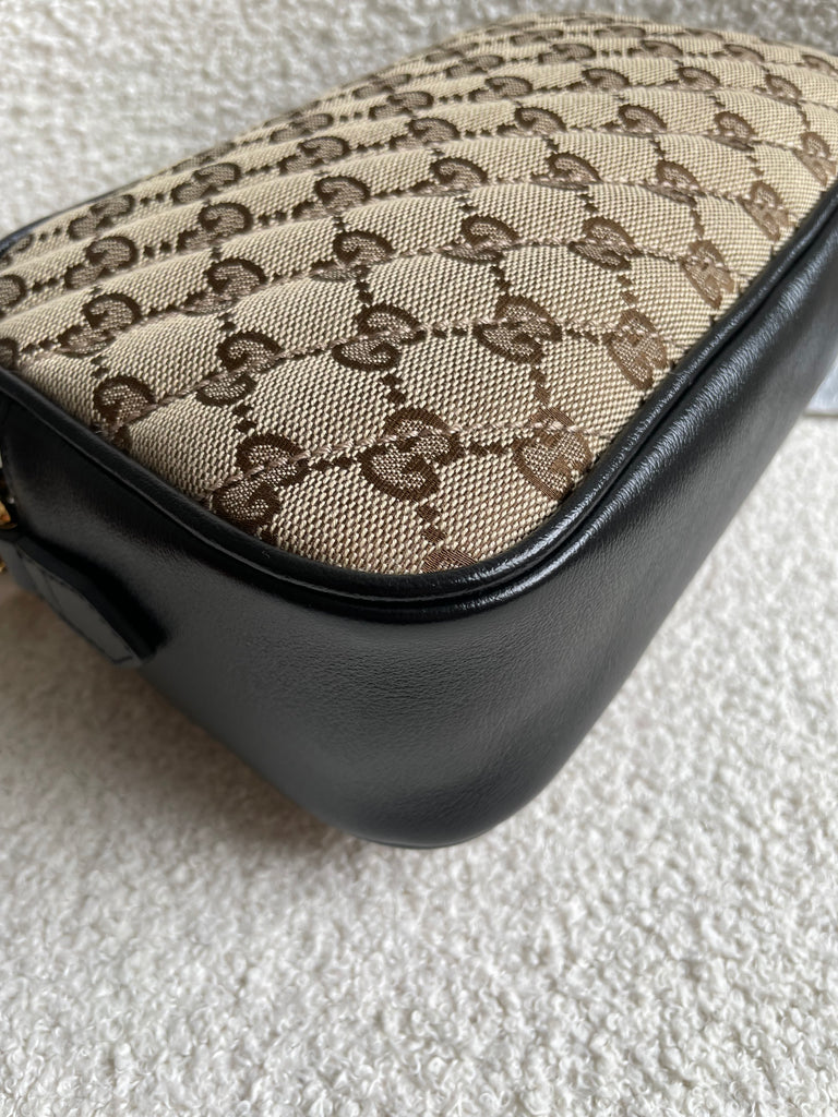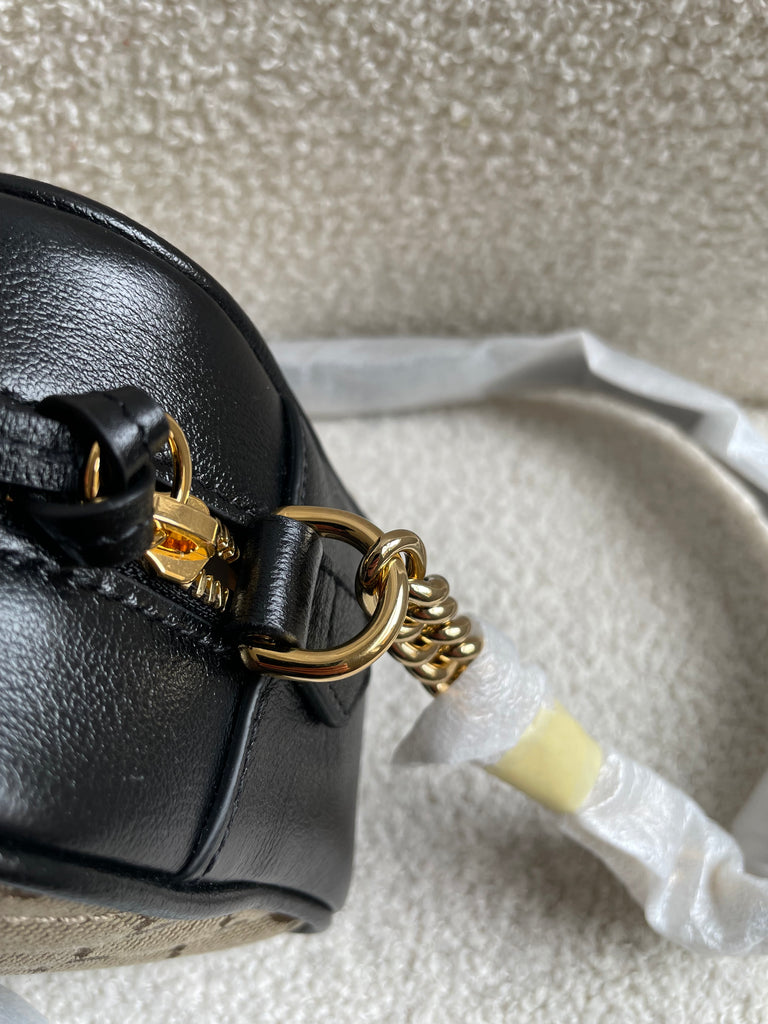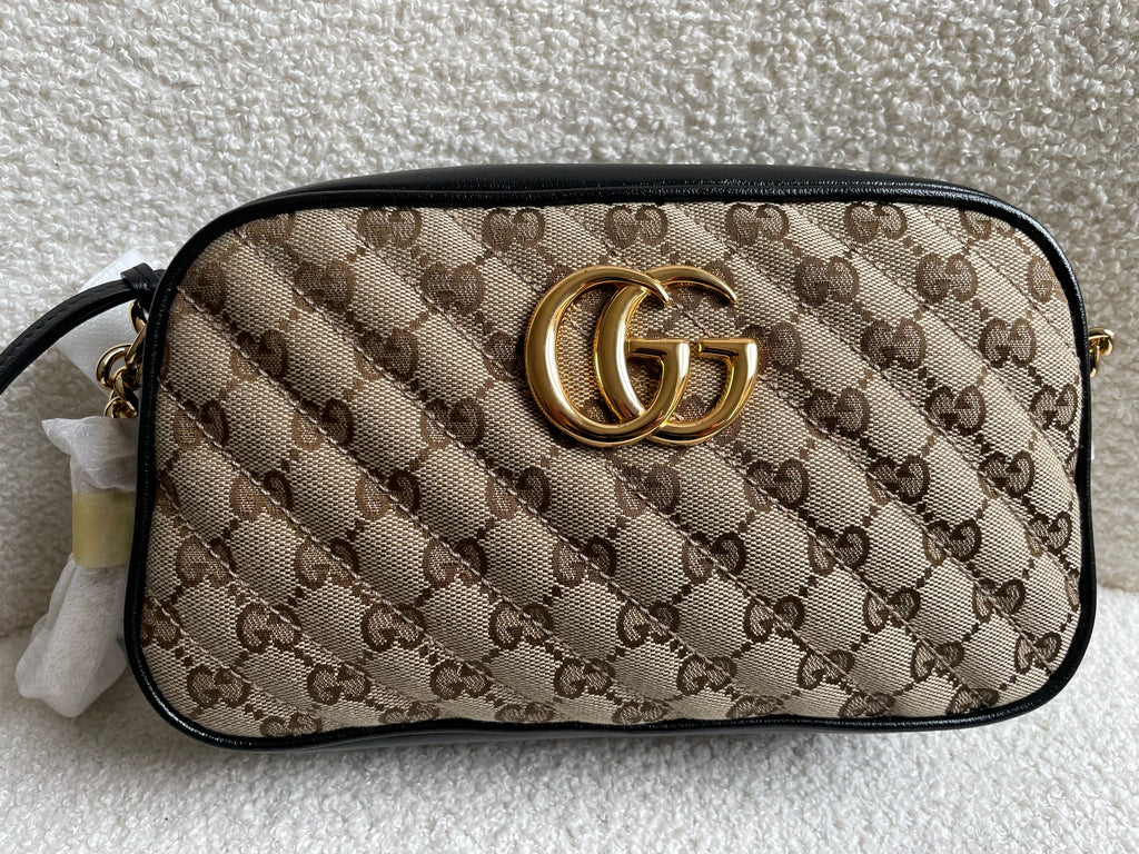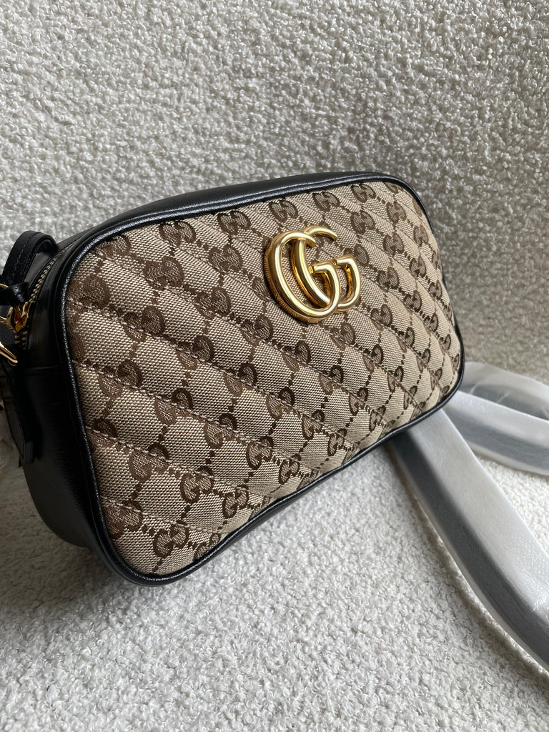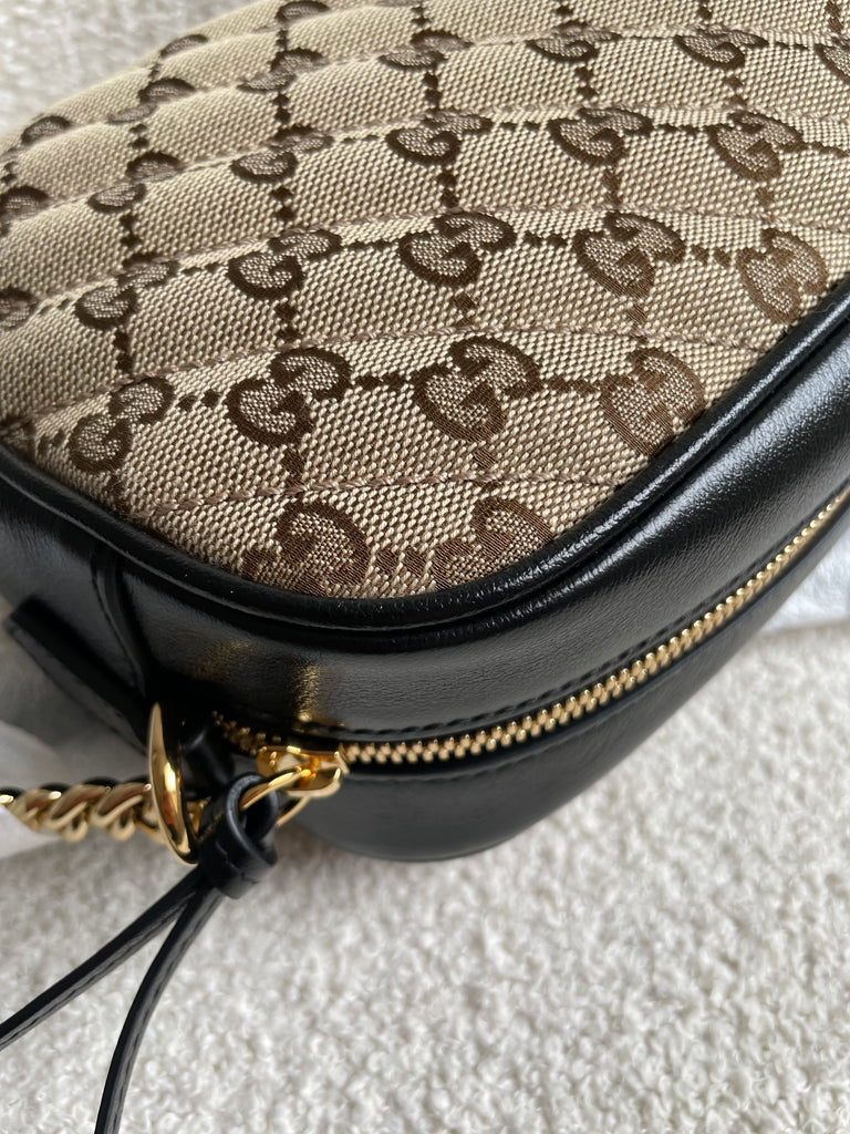 Gucci GG Marmont Small Bag in Beige/ebony GG canvas with shiny gold hardware. This small Marmont chain camera style bag has a softly structured shape and zip top closure. Effortlessly chic and sophisticated, this style can be worn both with a casual outfit or for evening wear. Suitable for both day to day or occasion wear and ideal for those who prefer a cross body option.