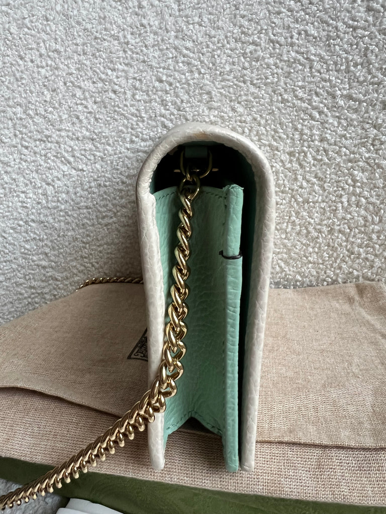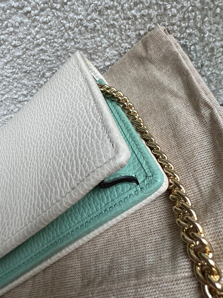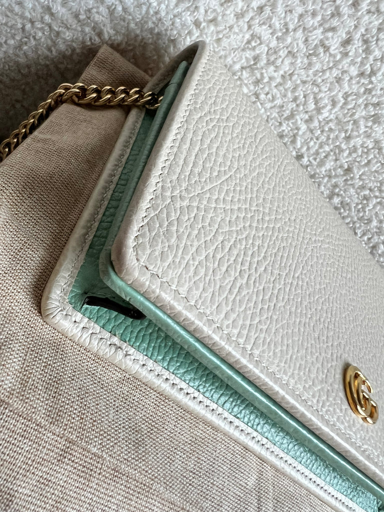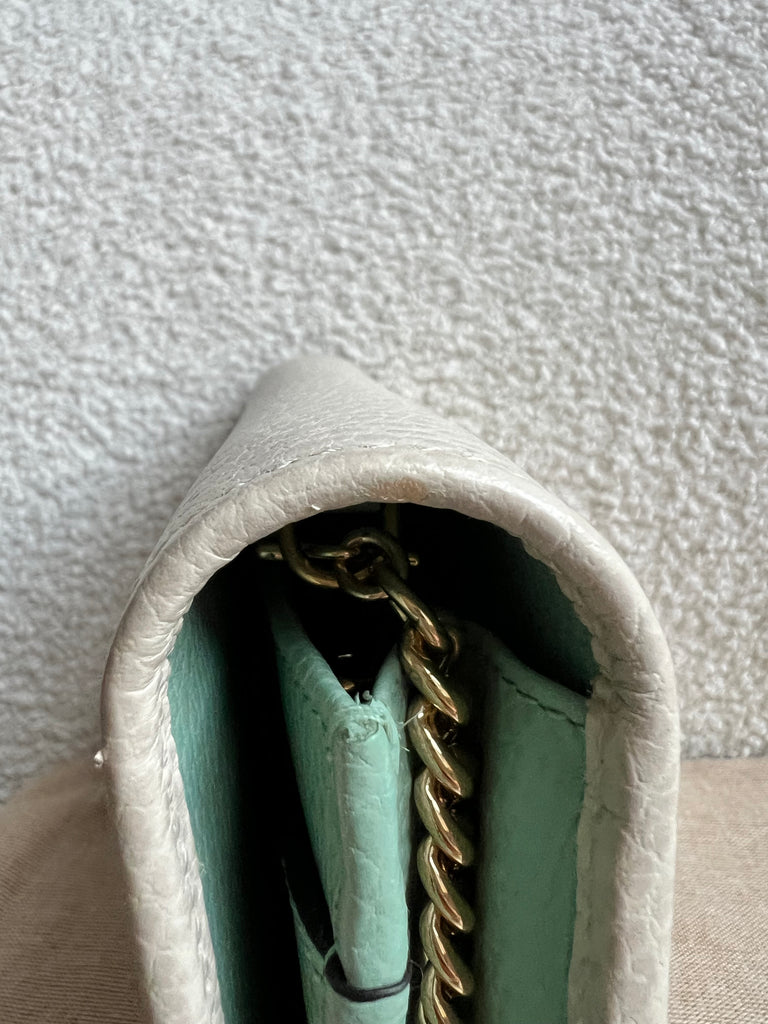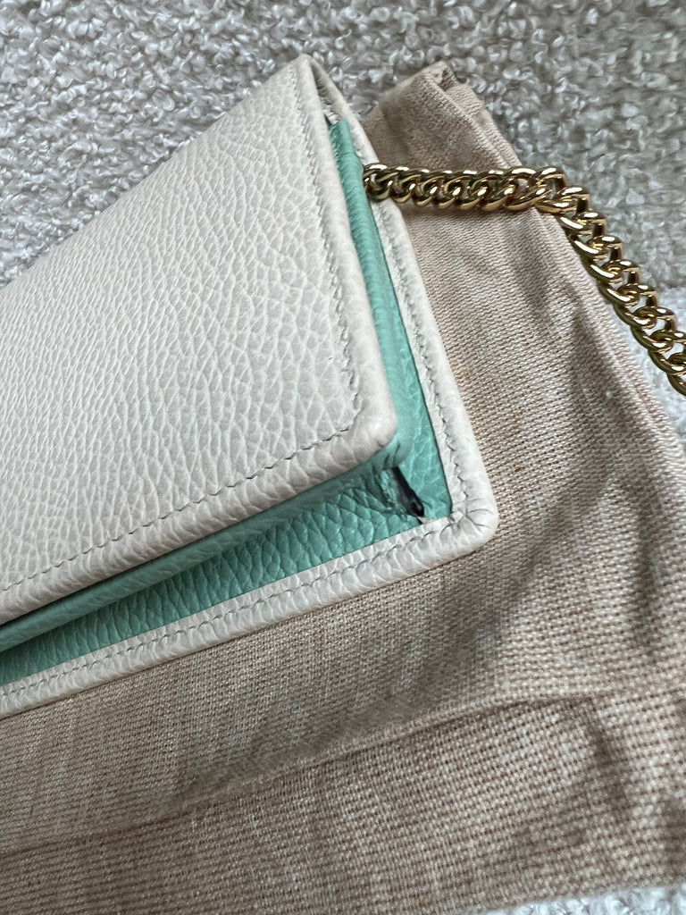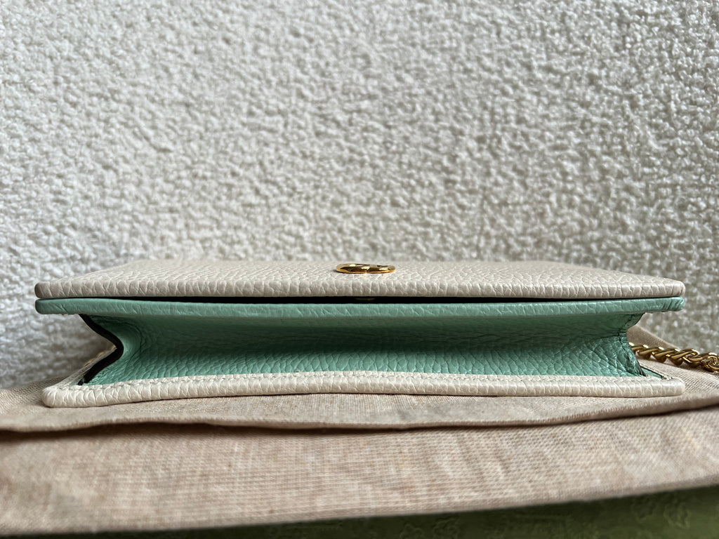 Gucci GG Marmont Chain Wallet in Cream / Teal Grained Calfskin with gold hardware. This classic wallet on chain is the perfect addition to an outfit for evening or event wear. The chain is detachable so can be worn cross body or used as a hand held clutch. Featuring GG hardware and flap and press stud closure, there is a zipped section inside and plenty of card slots.