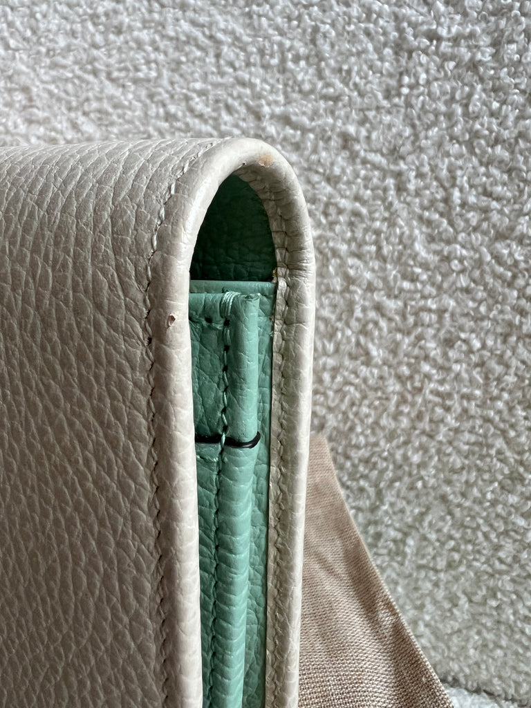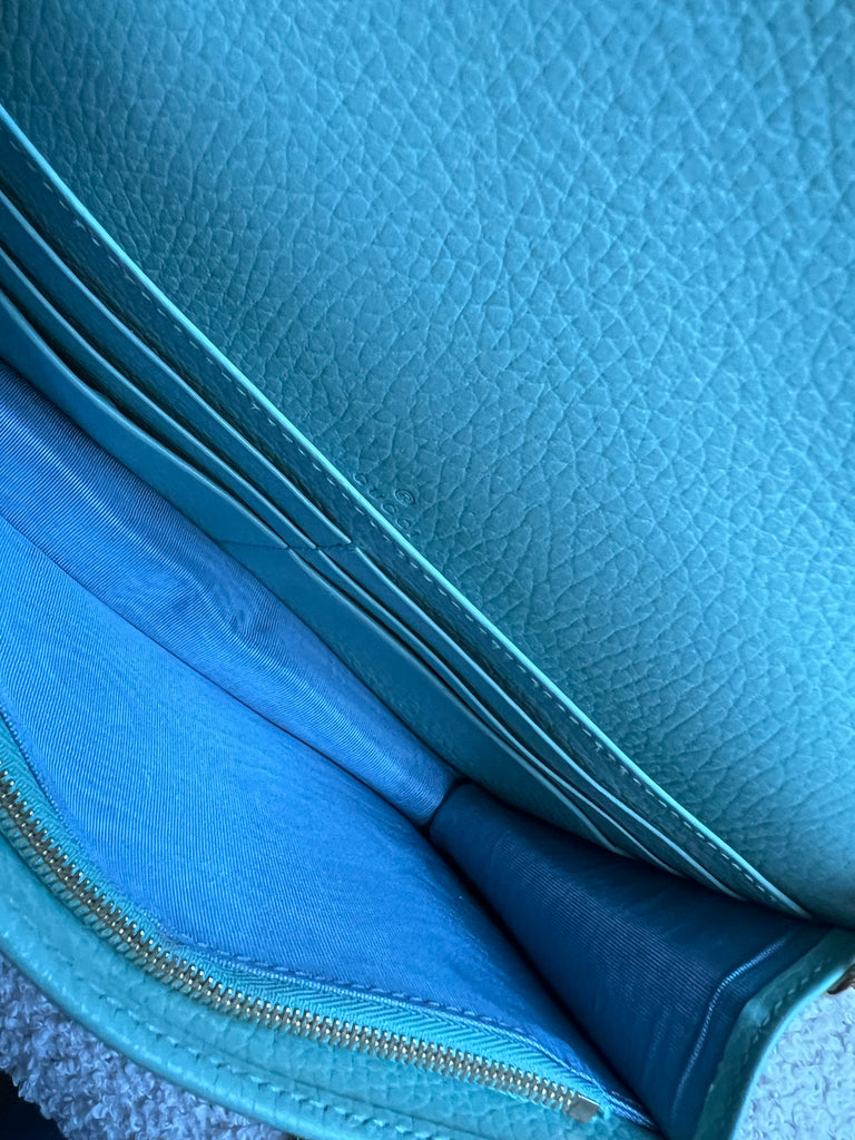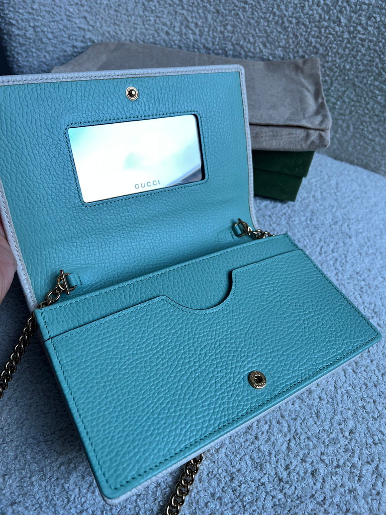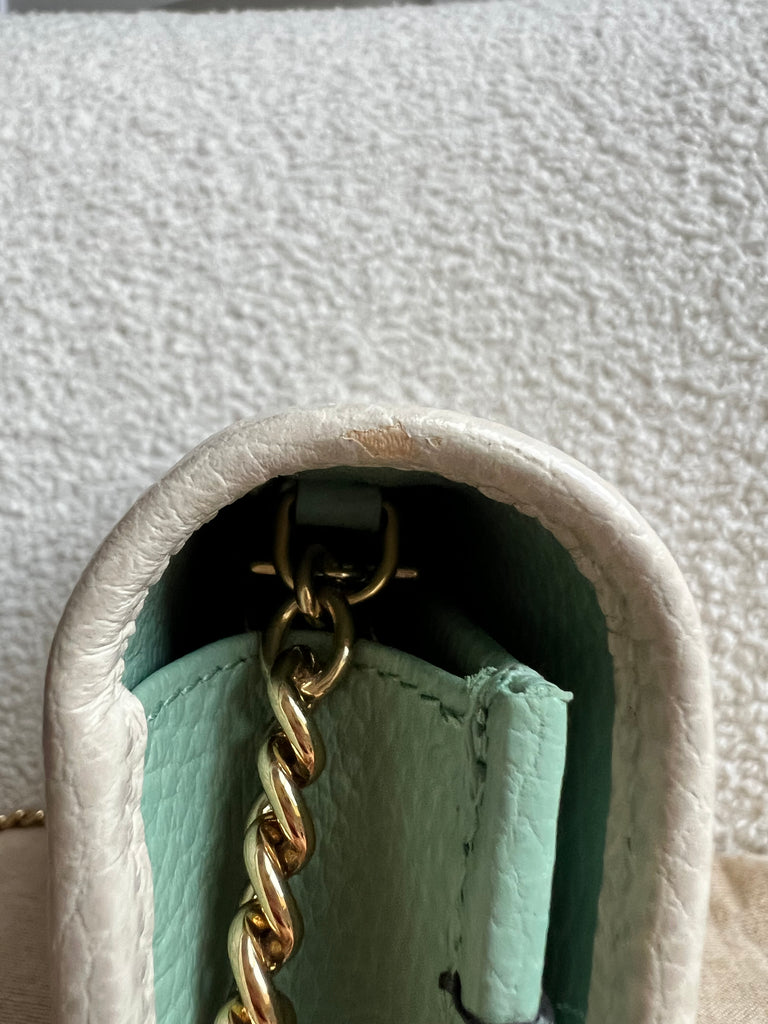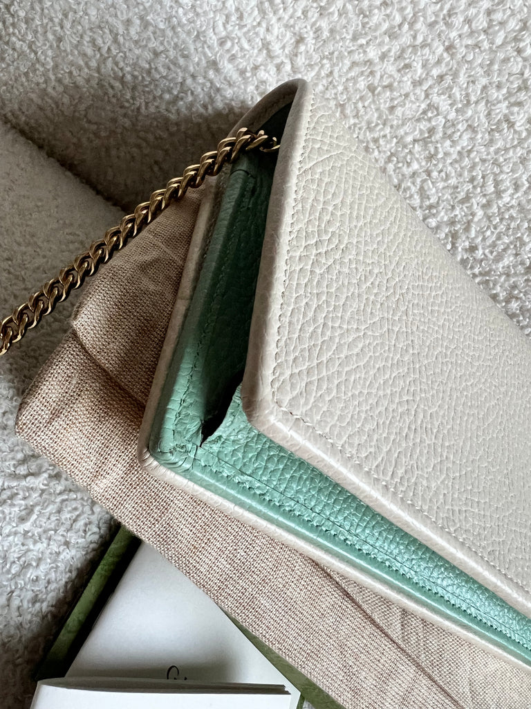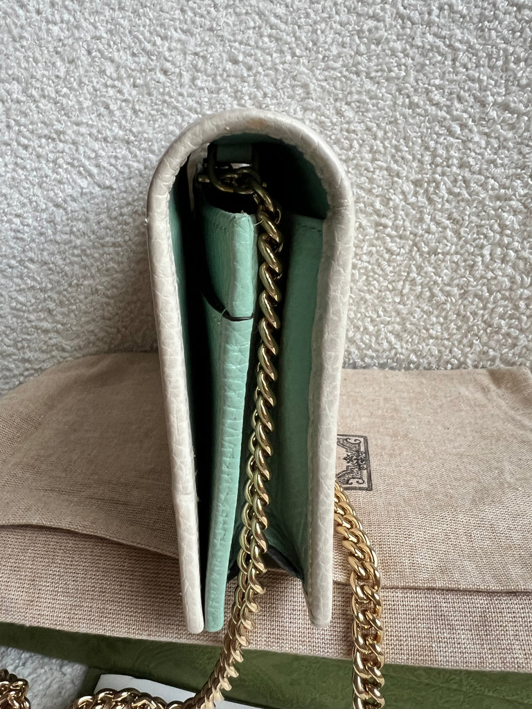 Gucci GG Marmont Chain Wallet in Cream / Teal Grained Calfskin with gold hardware. This classic wallet on chain is the perfect addition to an outfit for evening or event wear. The chain is detachable so can be worn cross body or used as a hand held clutch. Featuring GG hardware and flap and press stud closure, there is a zipped section inside and plenty of card slots.