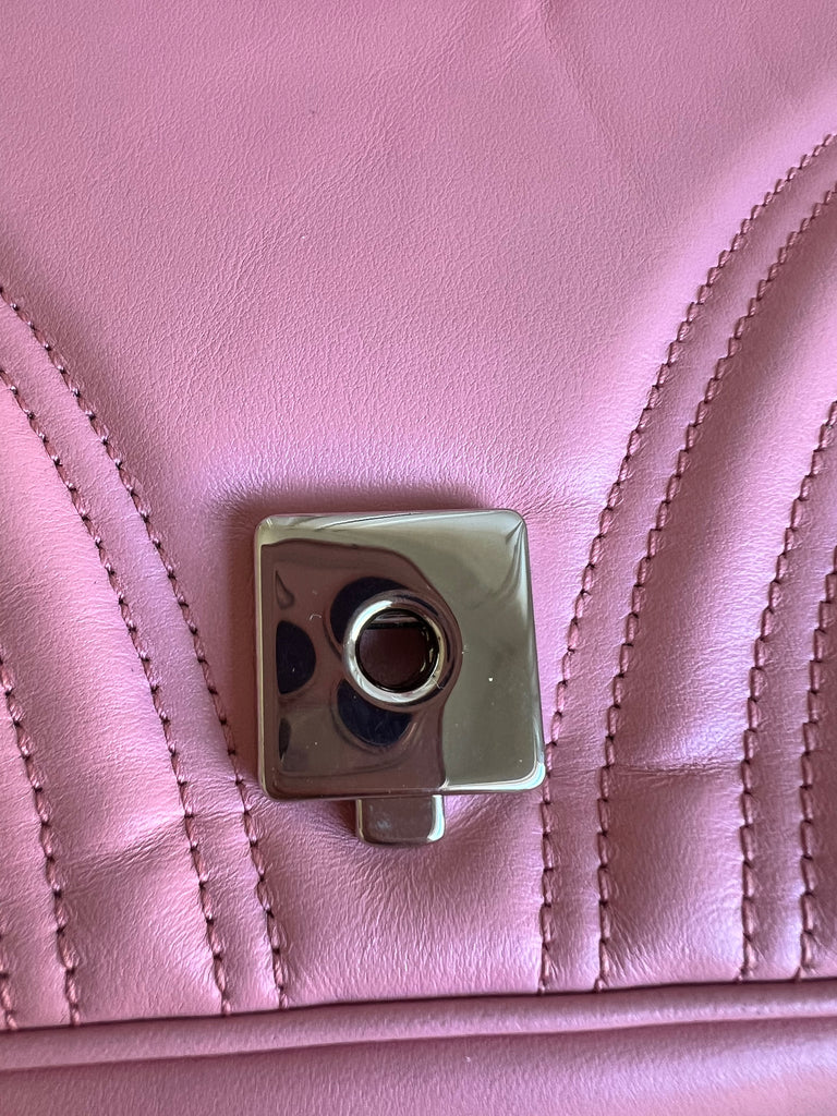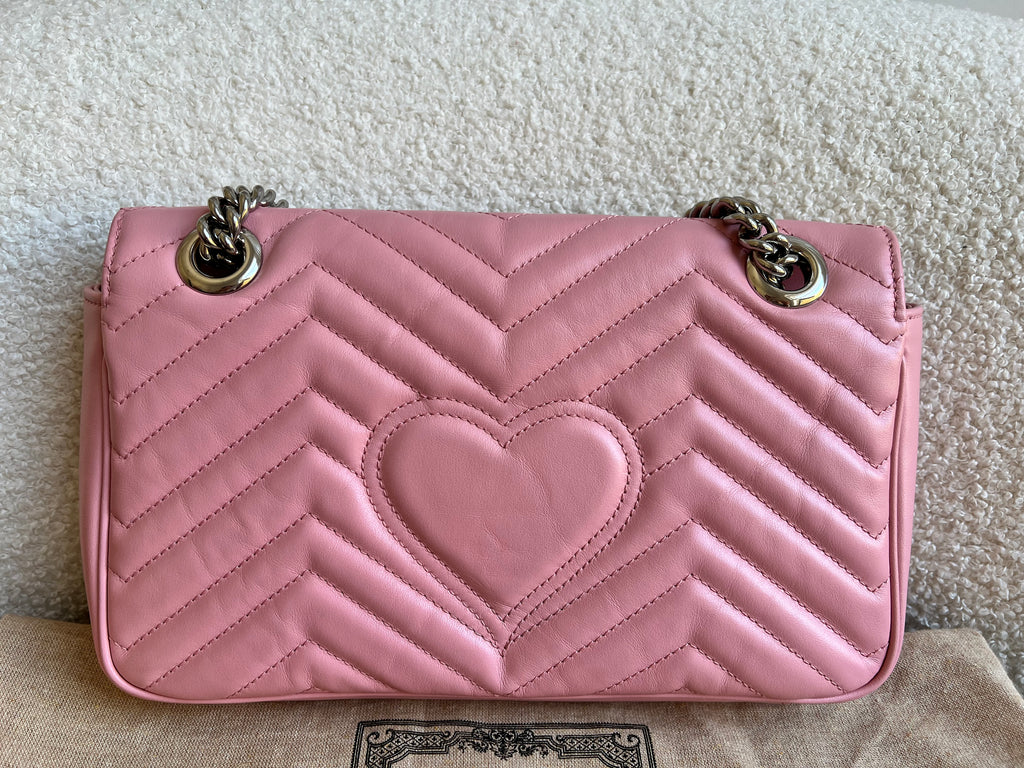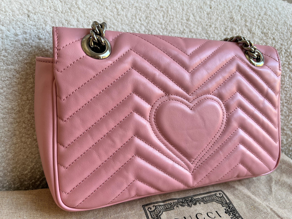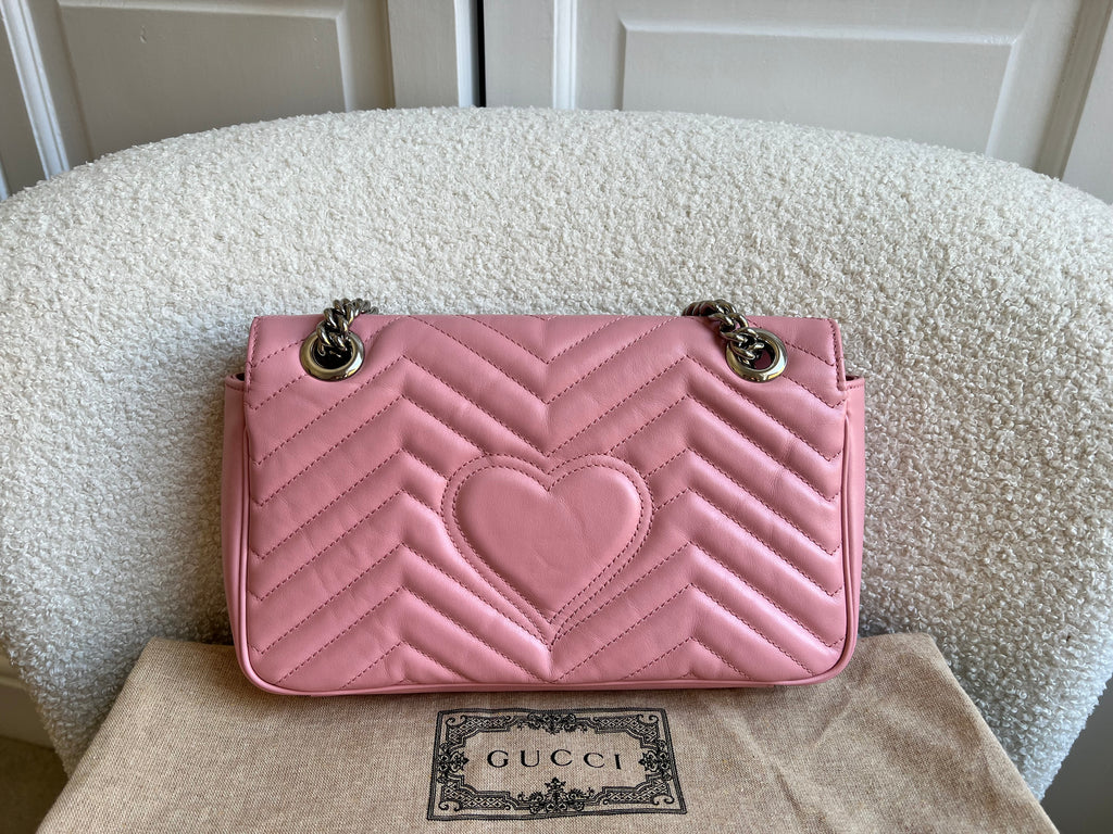 Gucci GG Marmont small shoulder bag in pale pink matelasse leather with silver hardware. This small Marmont bag has a softly structured shape and an oversized flap with GG hardware and heart detail on the back. The sliding chain can be worn multiple ways either doubled up or lengthened. Effortlessly chic and sophisticated, this style can be worn both with a casual outfit or for evening wear. Suitable for both event or occasion wear and ideal for those who prefer a cross body option.