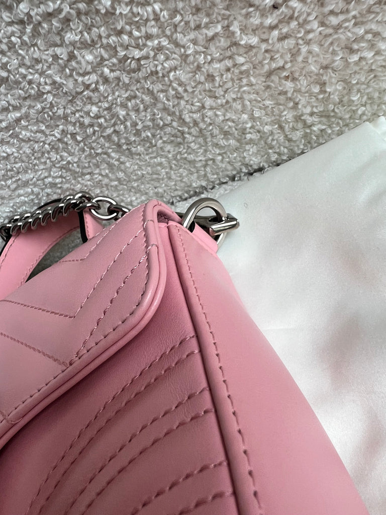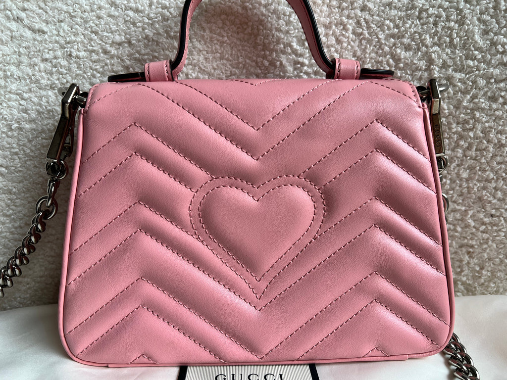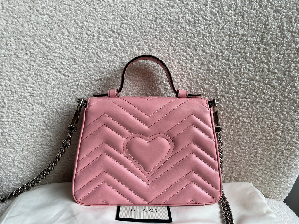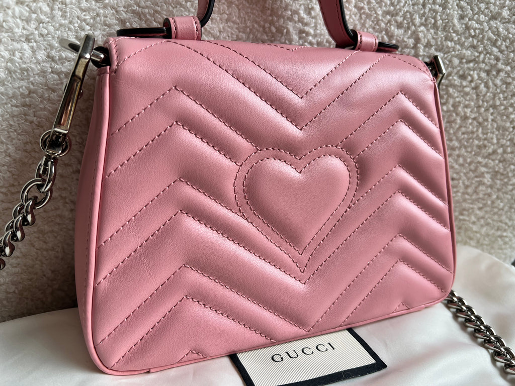 Gucci GG Marmont mini top handle bag in pink chevron matelassé leather with silver hardware. This mini top handle bag has a softly structured shape and an oversized flap closure with GG hardware. Featuring a leather top handle and chain shoulder strap, there is heart detailing on the back. Effortlessly chic and sophisticated, this style can be worn both with a casual outfit or for evening wear. Suitable for both day to day or occasion wear and ideal for those who prefer a cross body option.