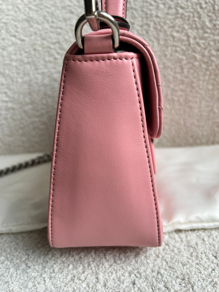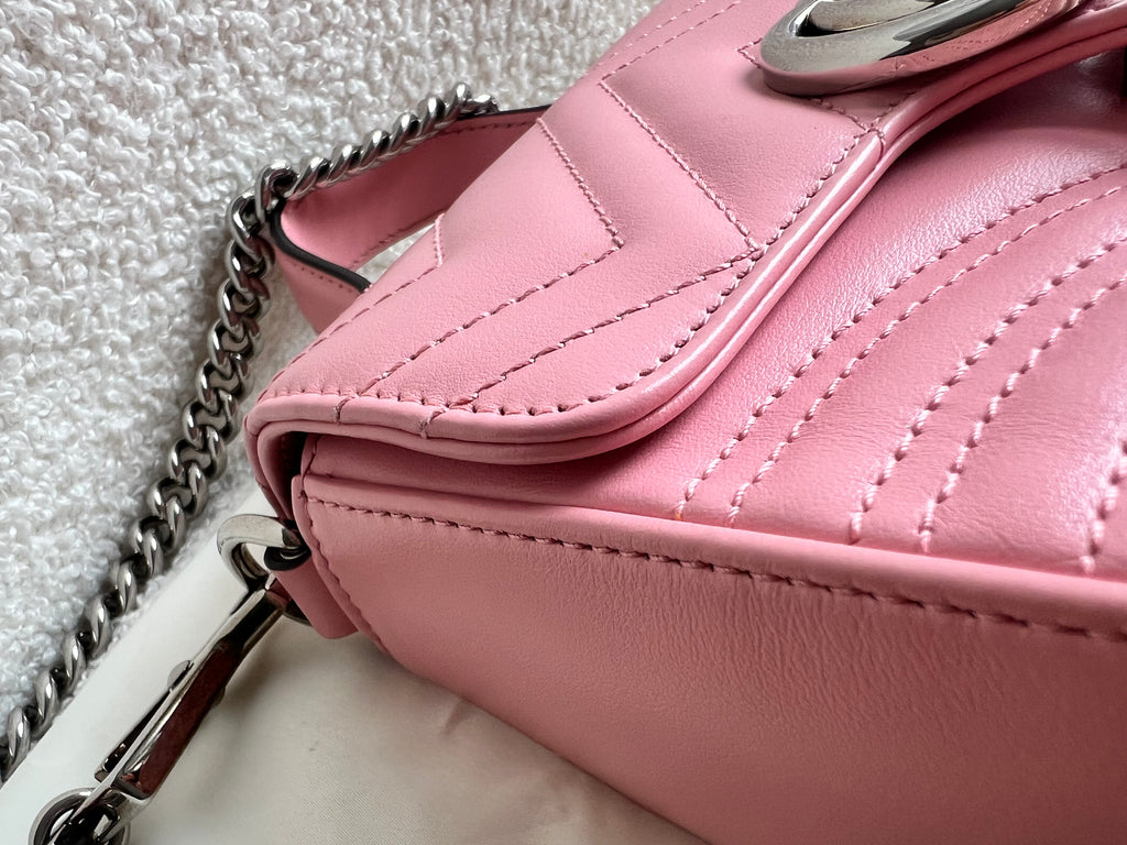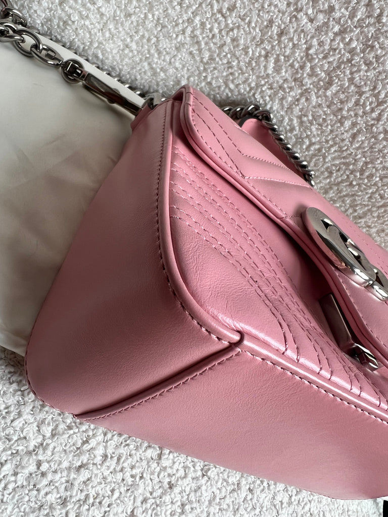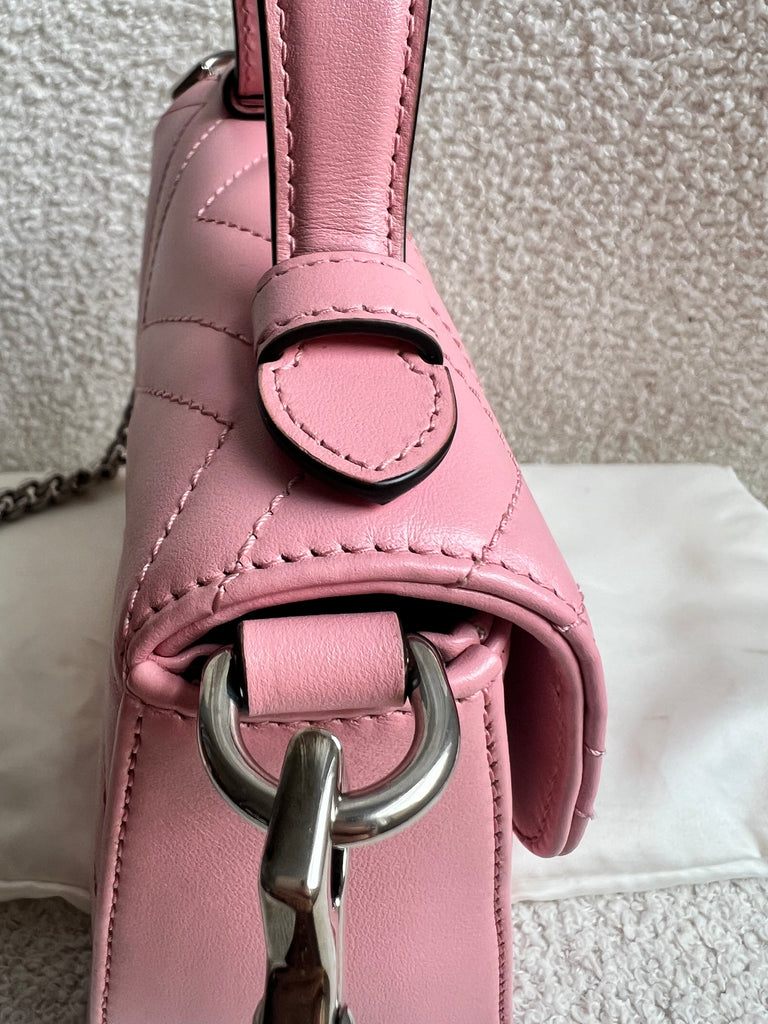 Gucci GG Marmont mini top handle bag in pink chevron matelassé leather with silver hardware. This mini top handle bag has a softly structured shape and an oversized flap closure with GG hardware. Featuring a leather top handle and chain shoulder strap, there is heart detailing on the back. Effortlessly chic and sophisticated, this style can be worn both with a casual outfit or for evening wear. Suitable for both day to day or occasion wear and ideal for those who prefer a cross body option.