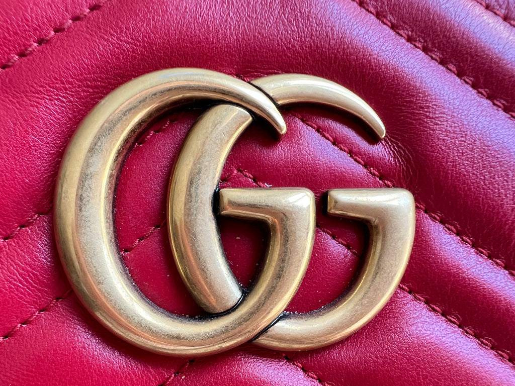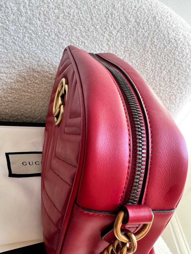 Gucci GG Marmont small shoulder bag in hibiscus red chevron matelassé leather with gold hardware. This small Marmont chain camera style bag has a softly structured shape and zip top closure. Effortlessly chic and sophisticated, this style can be worn both with a casual outfit or for evening wear. Suitable for both day to day or occasion wear and ideal for those who prefer a cross body option.
