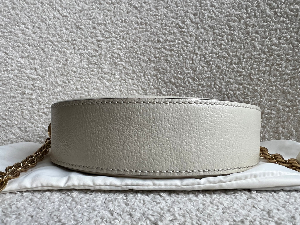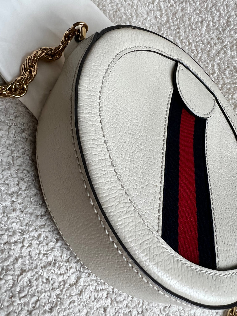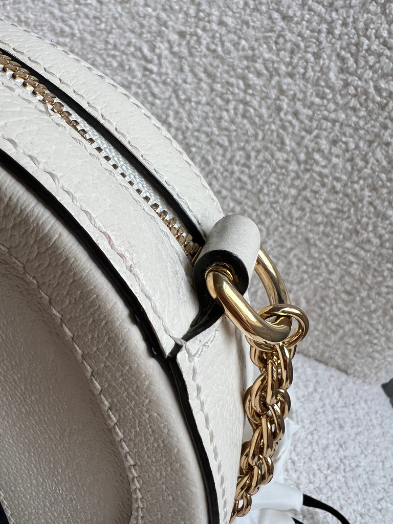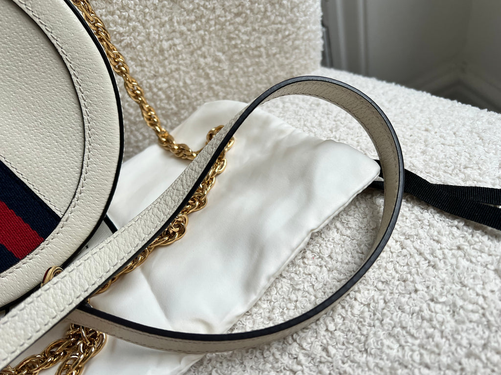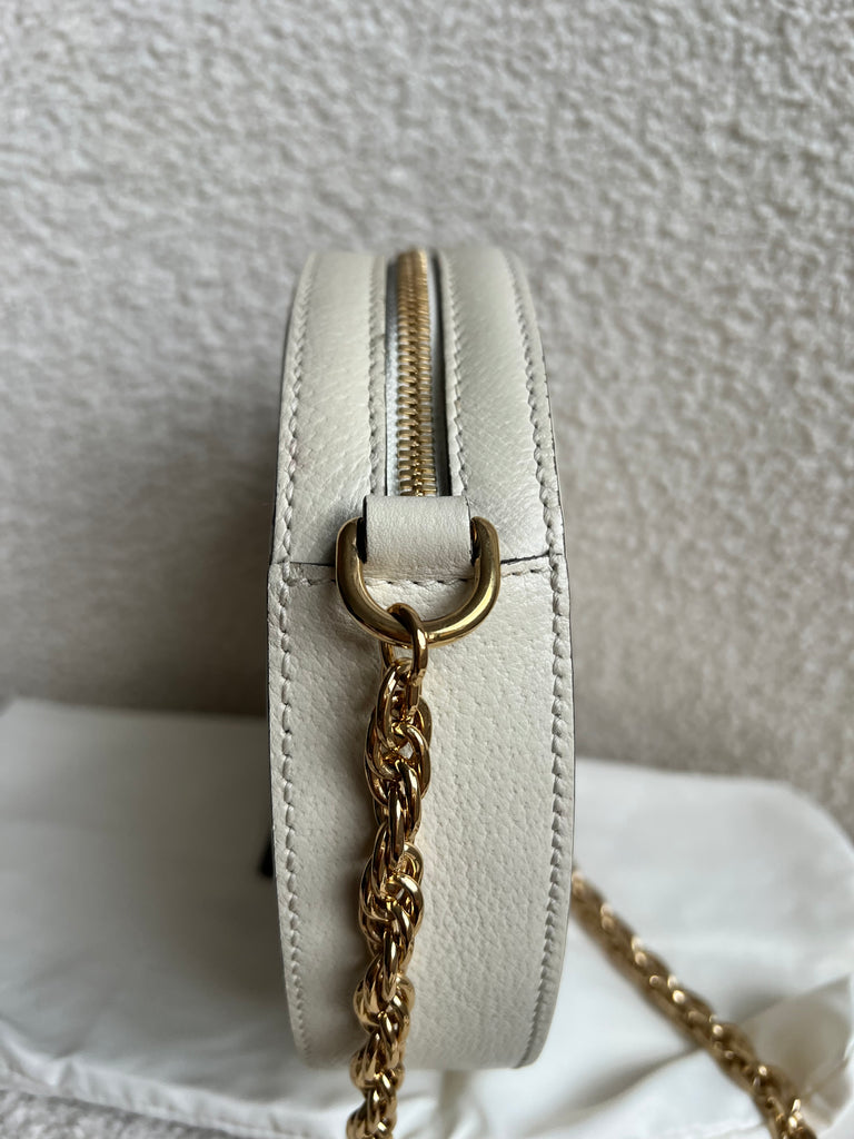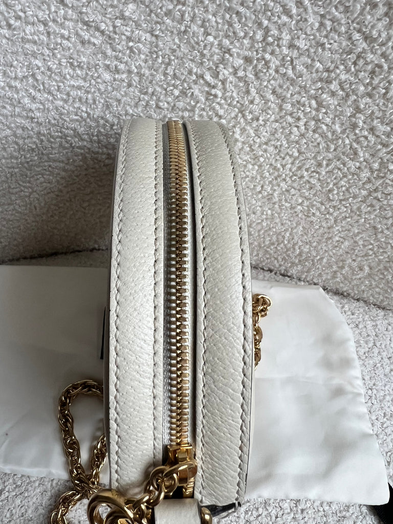 Gucci GG Ophidia Mini round shoulder bag in white calfskin leather with gold hardware. This small Round chain style bag has a softly structured shape and zip top closure. Effortlessly chic and sophisticated, this style can be worn both with a casual outfit or for evening wear. Suitable for both day to day or occasion wear and ideal for those who prefer a cross body option.