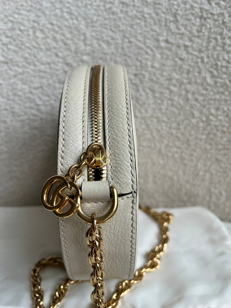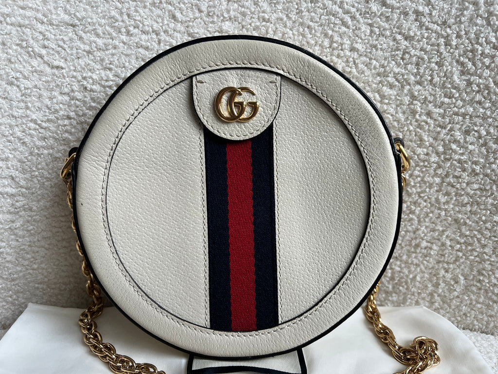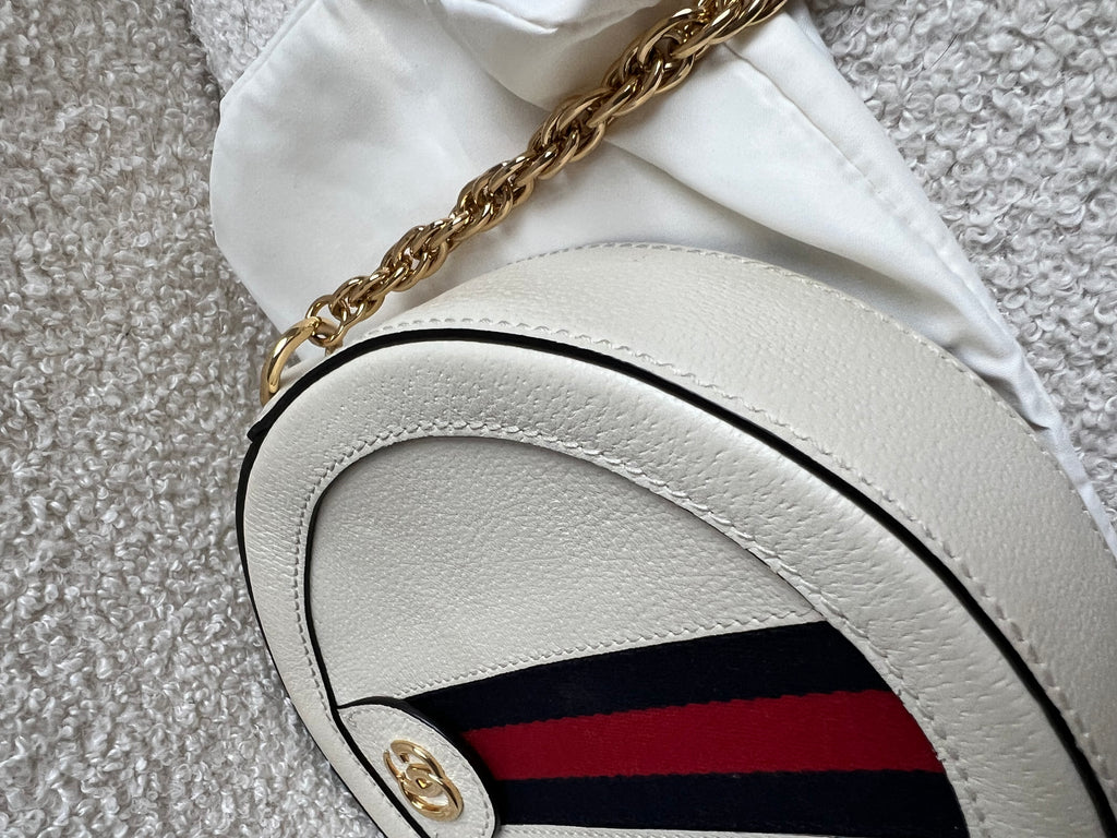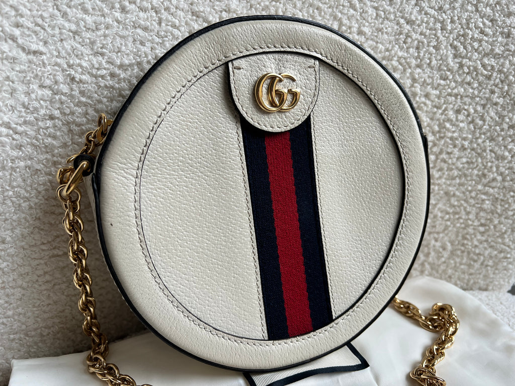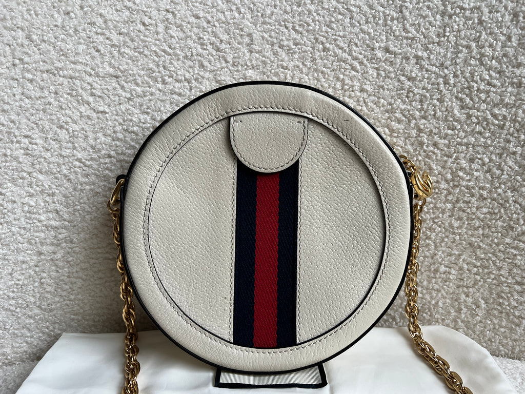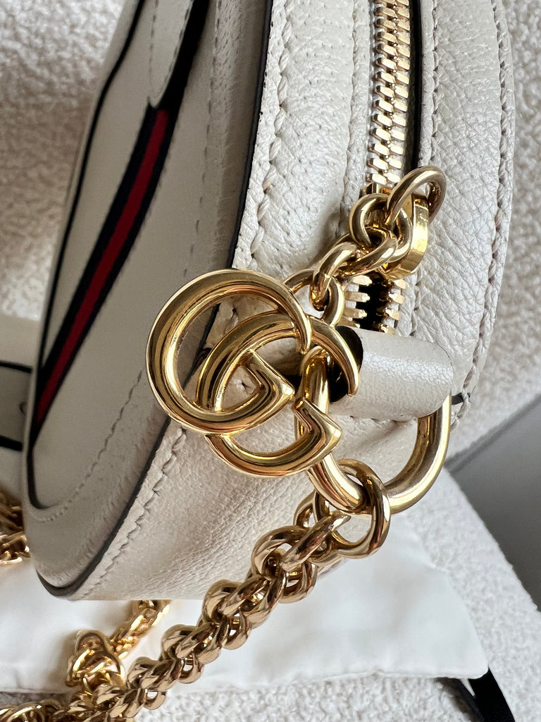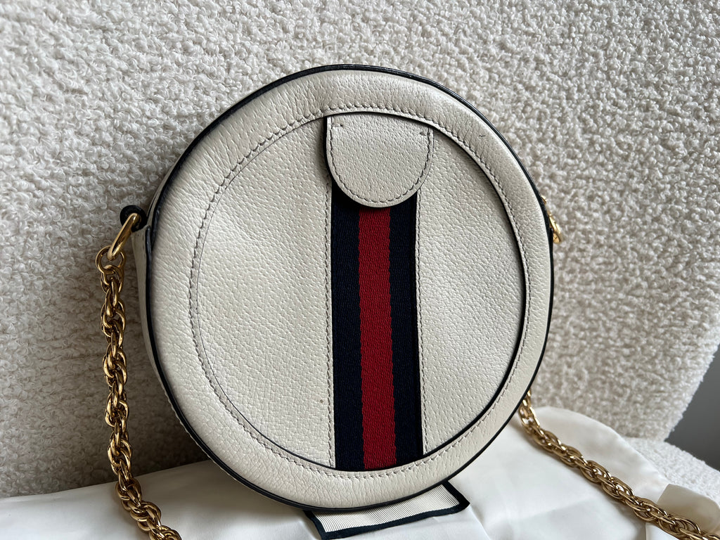 Gucci GG Ophidia Mini round shoulder bag in white calfskin leather with gold hardware. This small Round chain style bag has a softly structured shape and zip top closure. Effortlessly chic and sophisticated, this style can be worn both with a casual outfit or for evening wear. Suitable for both day to day or occasion wear and ideal for those who prefer a cross body option.