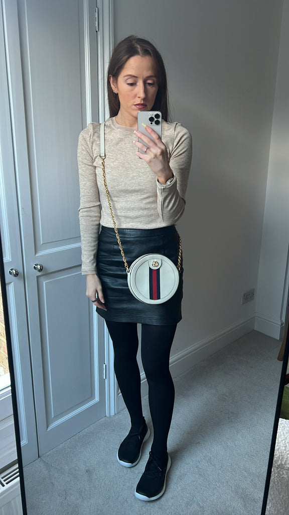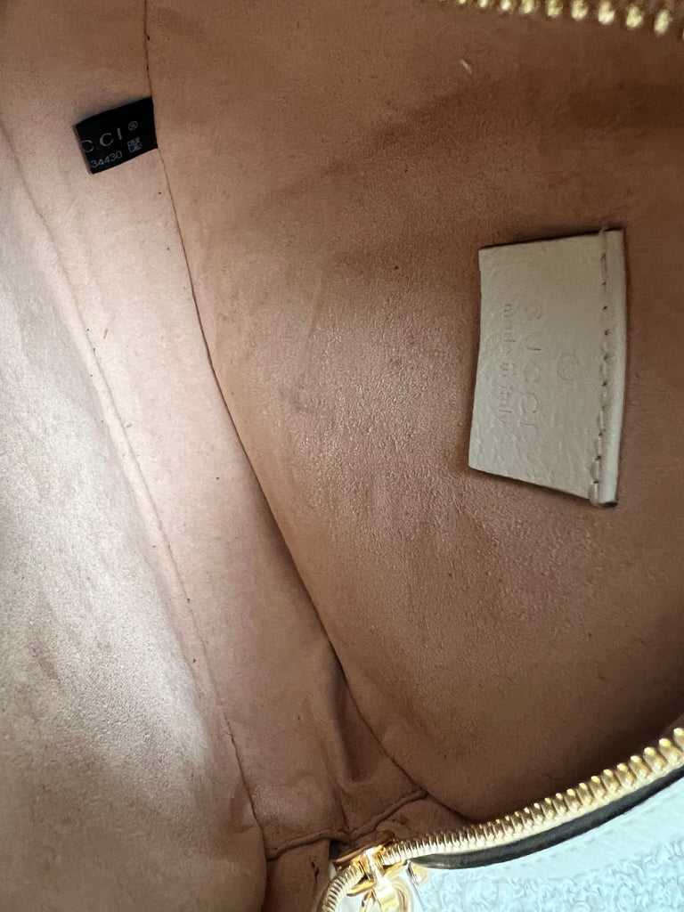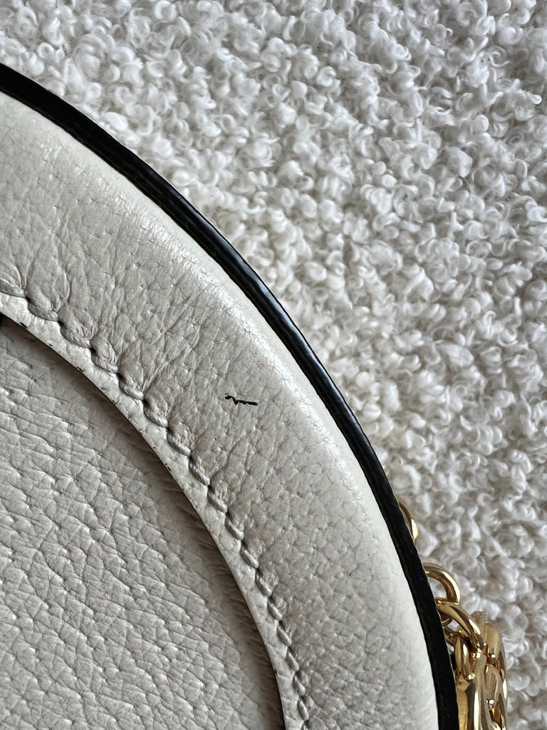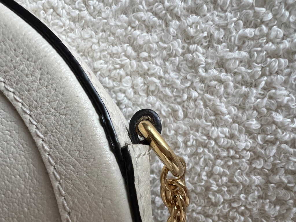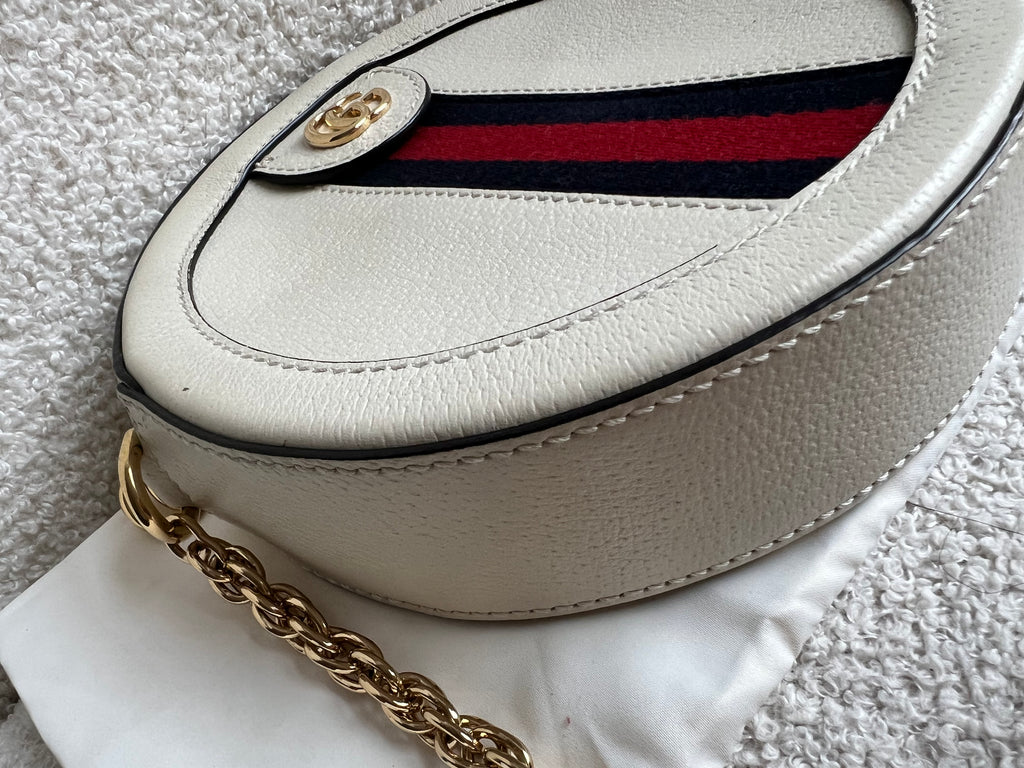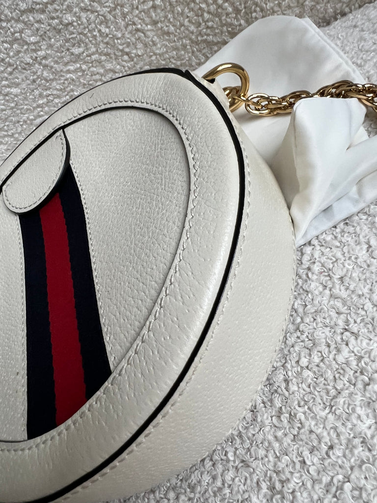 Gucci GG Ophidia Mini round shoulder bag in white calfskin leather with gold hardware. This small Round chain style bag has a softly structured shape and zip top closure. Effortlessly chic and sophisticated, this style can be worn both with a casual outfit or for evening wear. Suitable for both day to day or occasion wear and ideal for those who prefer a cross body option.