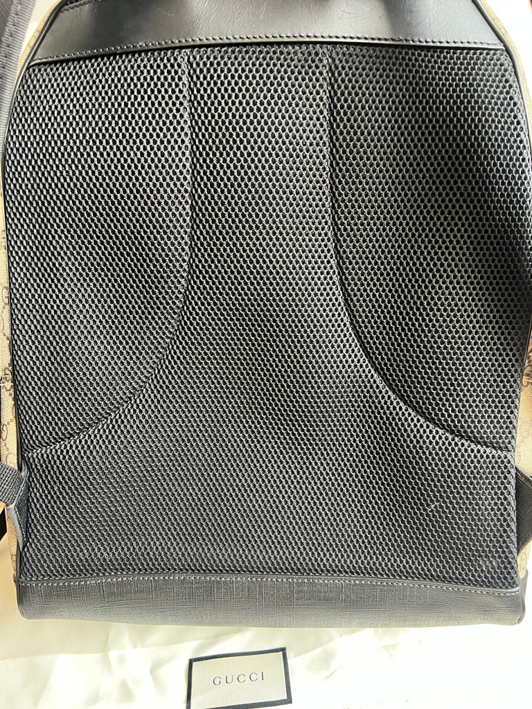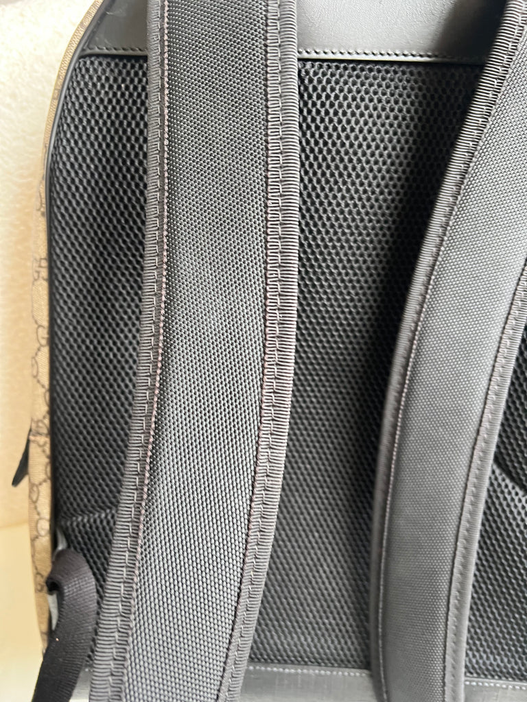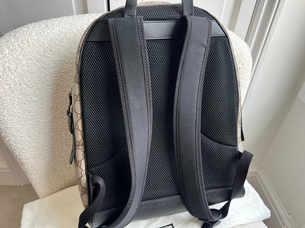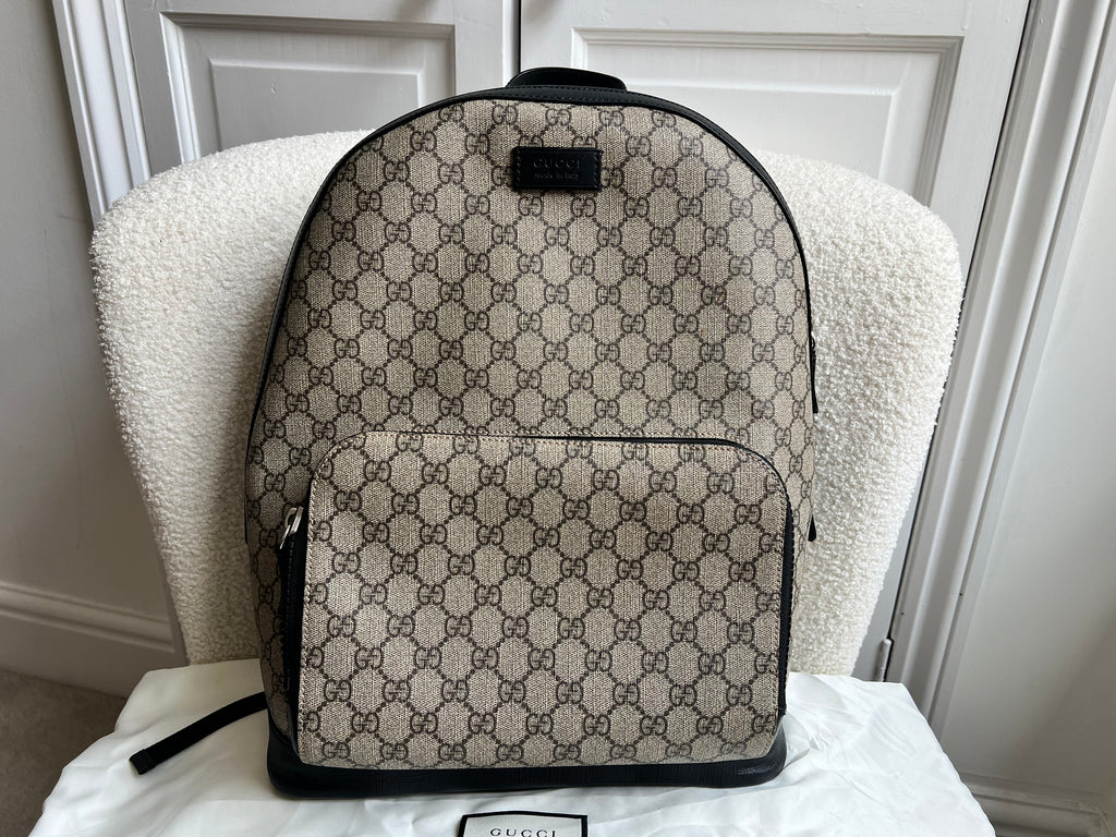 Gucci Backpack in GG Supreme Canvas. This stylish, large sized unisex backpack is super practical and ideal for those who prefer larger sized bags. Ideal for travelling or day trips, as well as a work bag. Interior has an slip pocket for laptop. Can be carried by hand or carried over the shoulder.