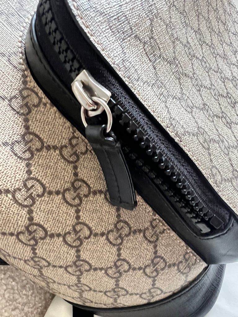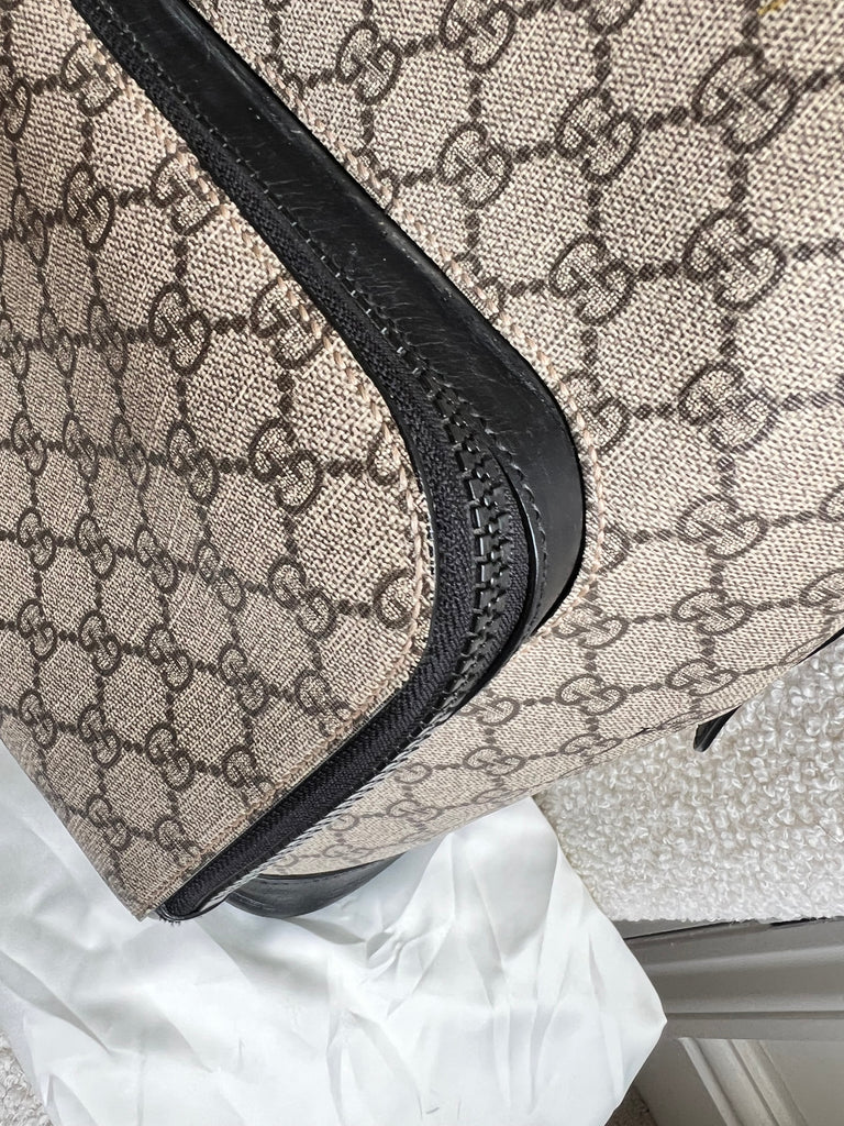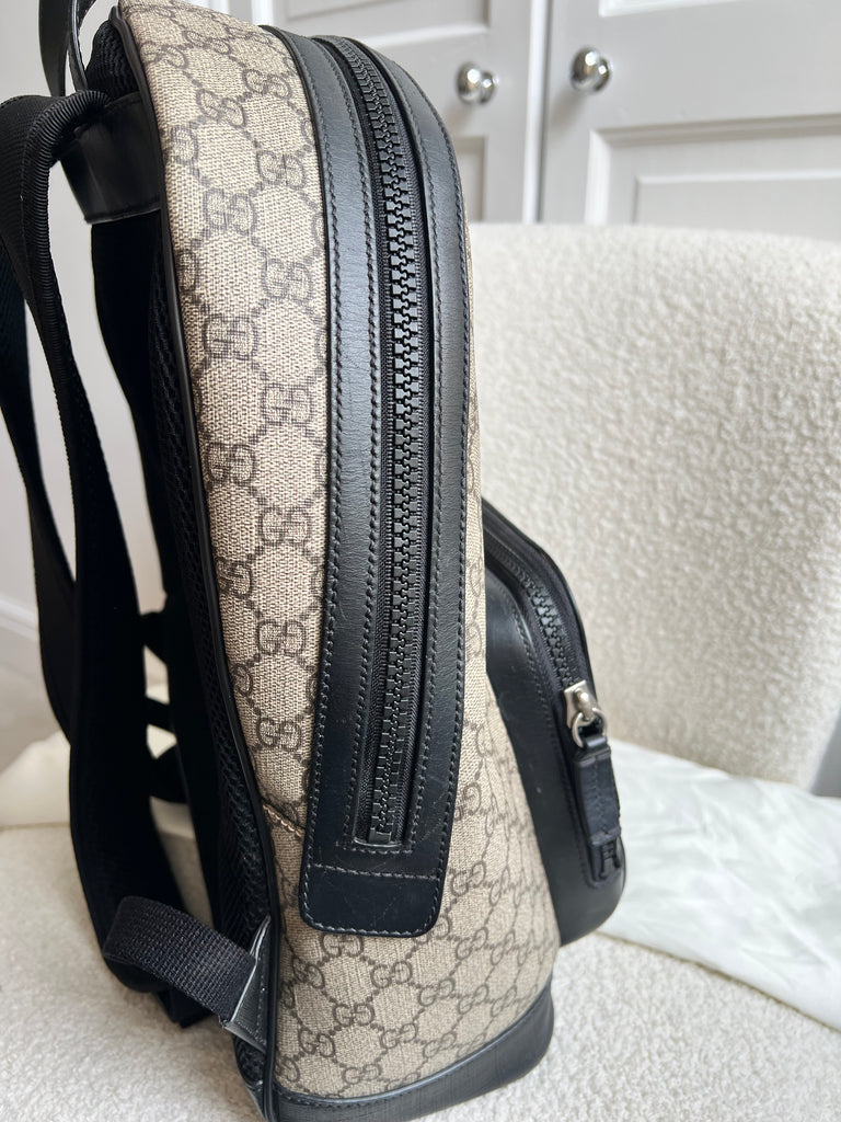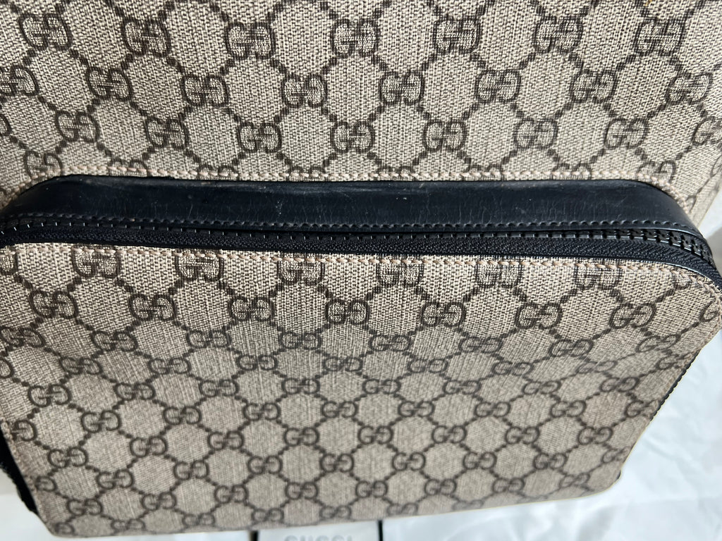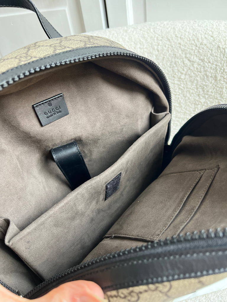 Gucci Backpack in GG Supreme Canvas. This stylish, large sized unisex backpack is super practical and ideal for those who prefer larger sized bags. Ideal for travelling or day trips, as well as a work bag. Interior has an slip pocket for laptop. Can be carried by hand or carried over the shoulder.