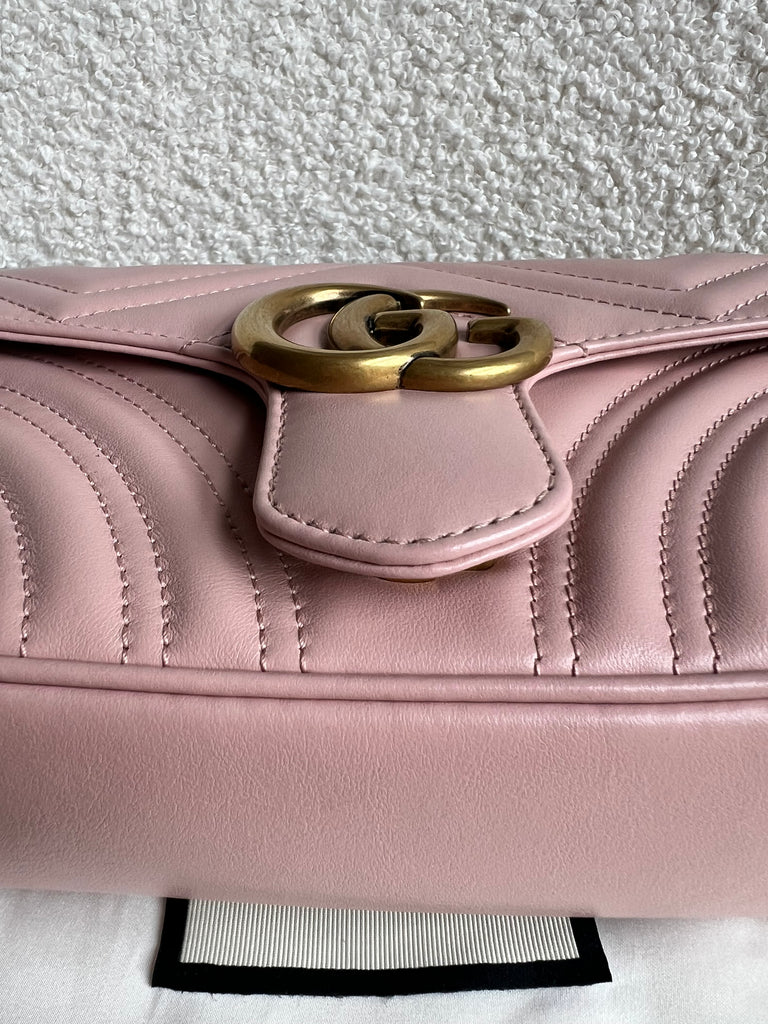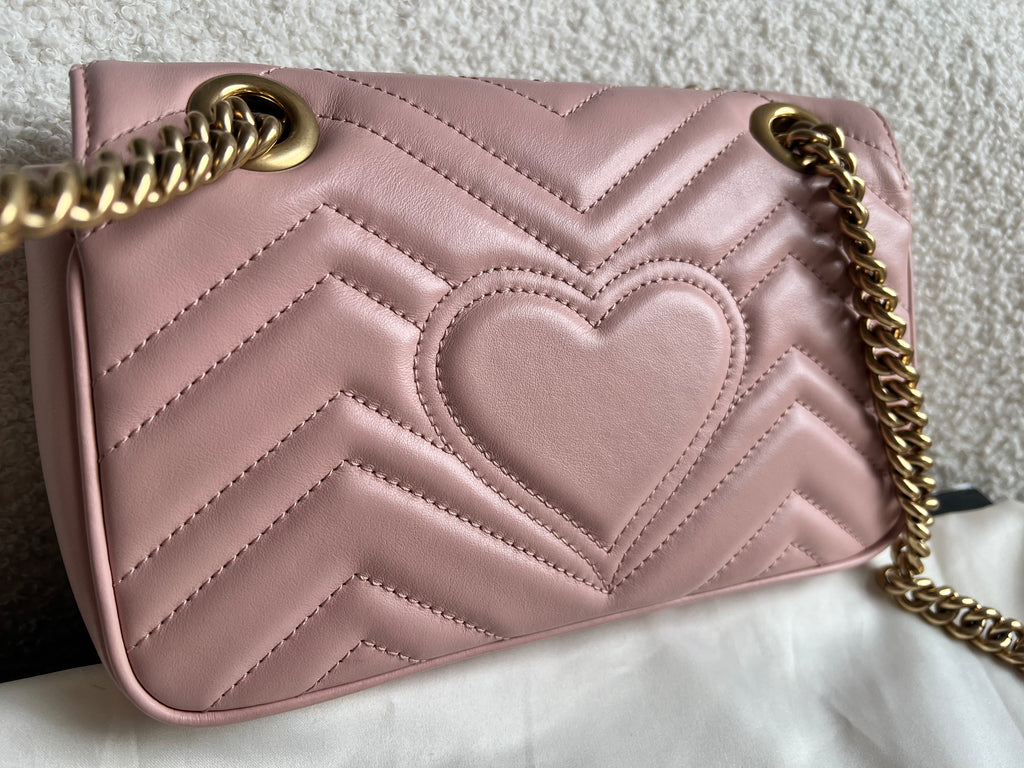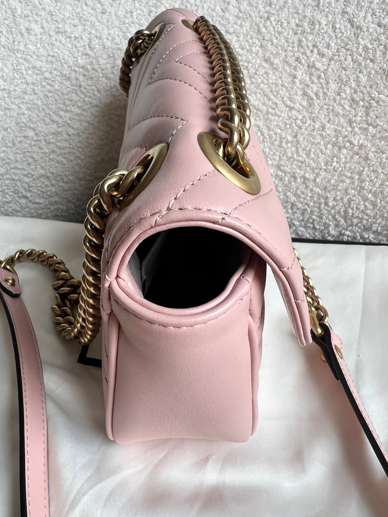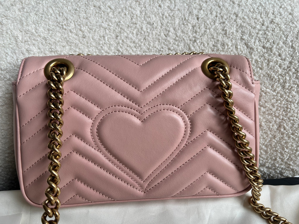 Gucci GG Marmont mini shoulder bag in pale pink matelasse chevron leather with gold hardware. This mini Marmont bag has a softly structured shape and an oversized flap with GG hardware and heart detail on the back. The sliding chain can be worn multiple ways either doubled up or lengthened. Effortlessly chic and sophisticated, this style can be worn both with a casual outfit or for evening wear. Suitable for both day to day or occasion wear and ideal for those who prefer a cross body option.