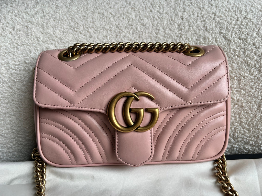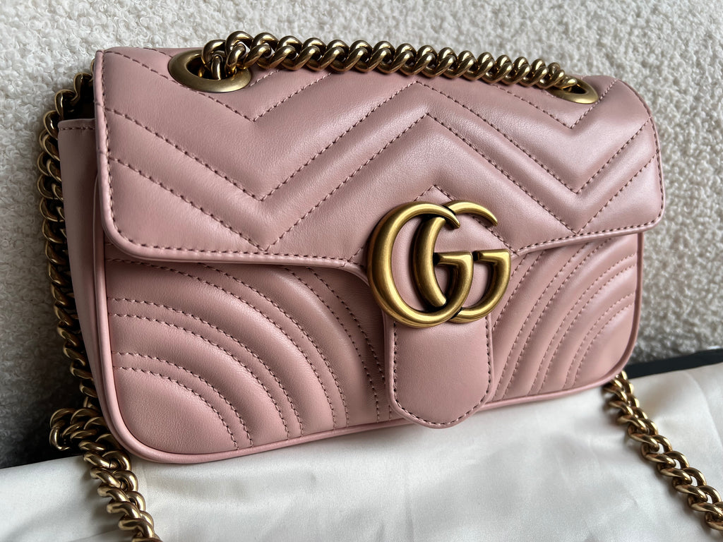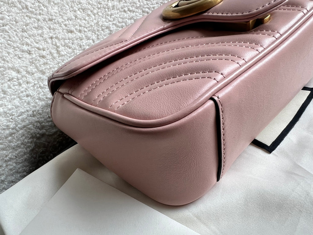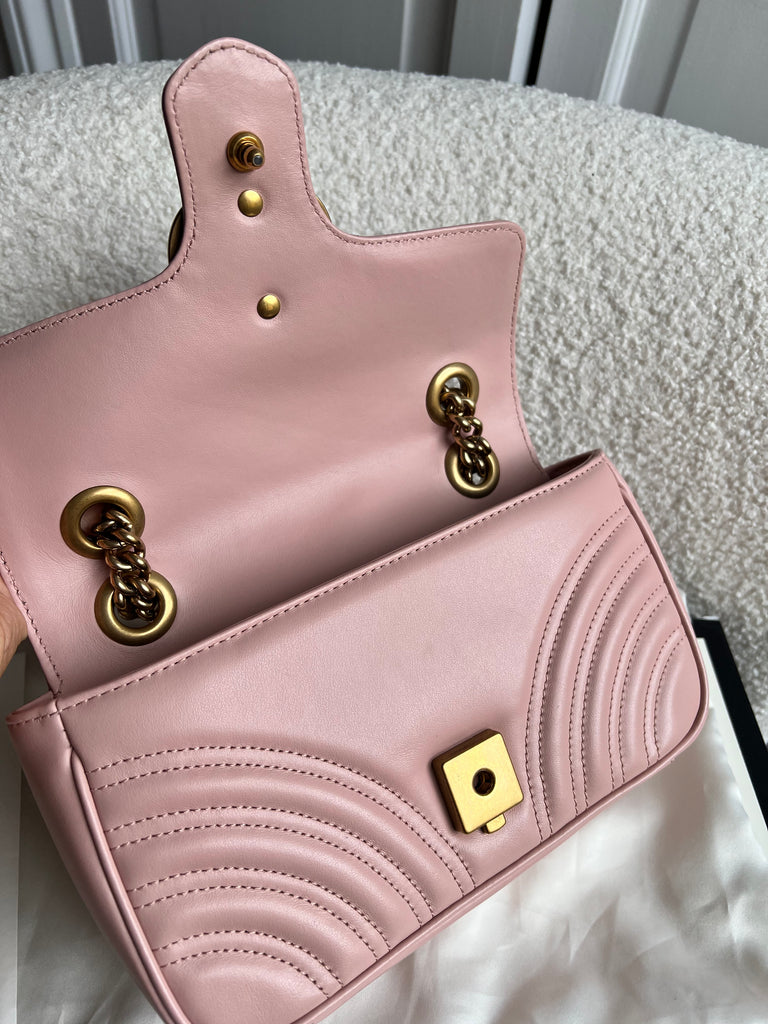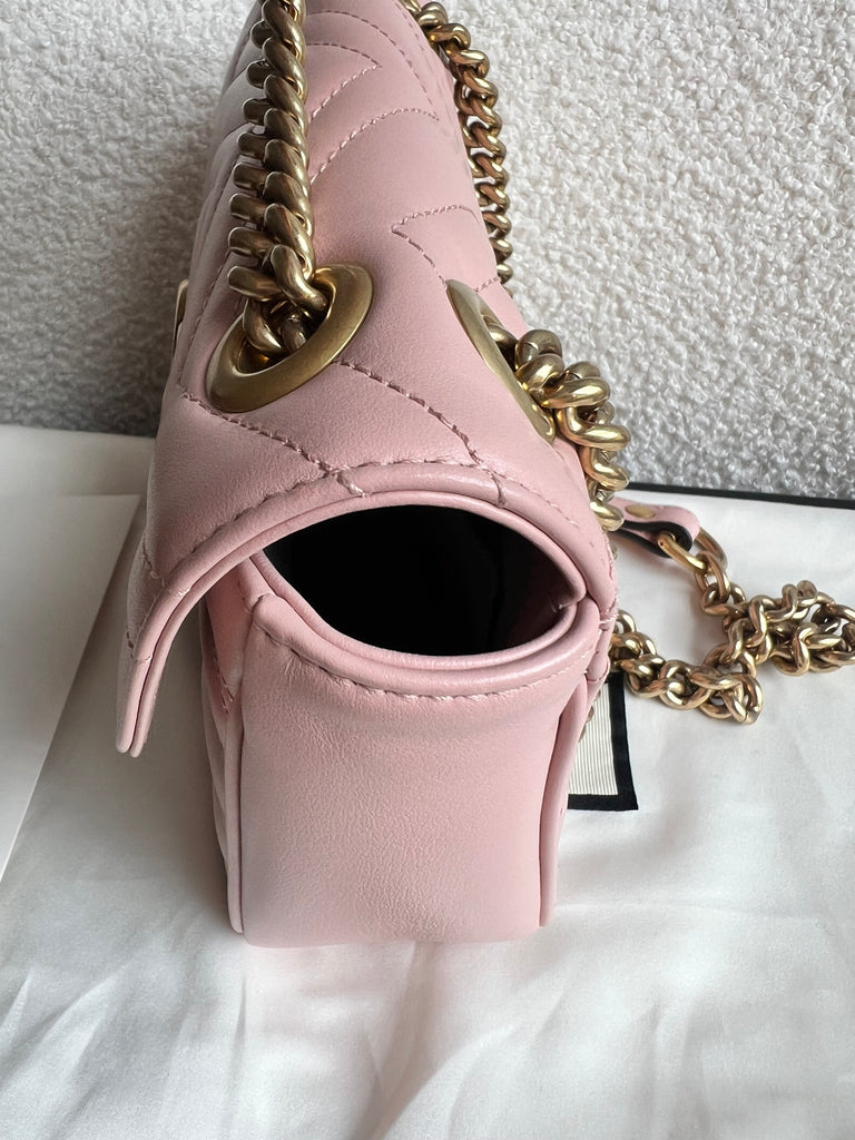 Gucci GG Marmont mini shoulder bag in pale pink matelasse chevron leather with gold hardware. This mini Marmont bag has a softly structured shape and an oversized flap with GG hardware and heart detail on the back. The sliding chain can be worn multiple ways either doubled up or lengthened. Effortlessly chic and sophisticated, this style can be worn both with a casual outfit or for evening wear. Suitable for both day to day or occasion wear and ideal for those who prefer a cross body option.