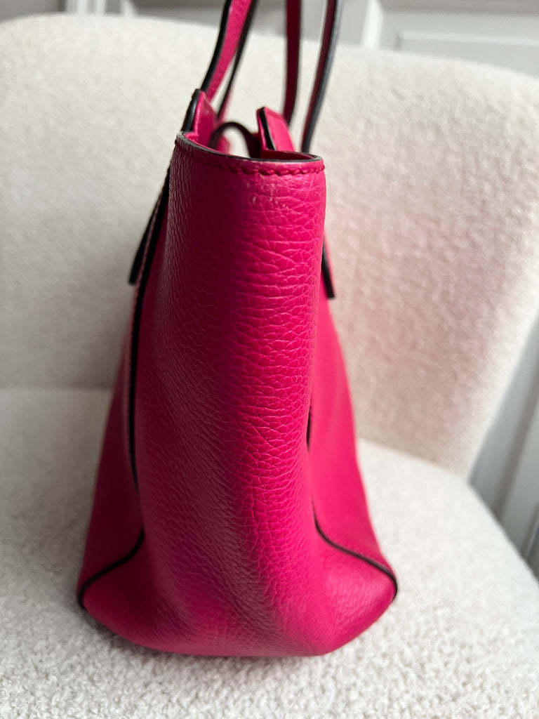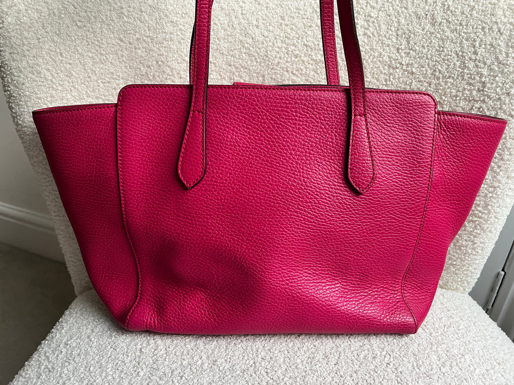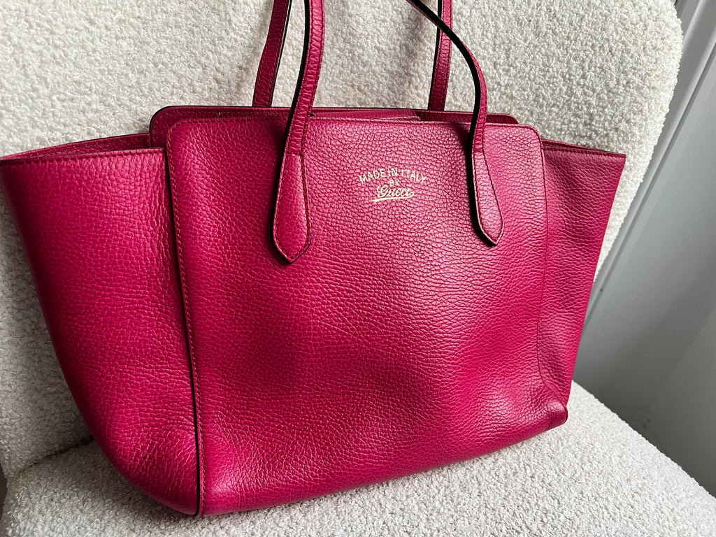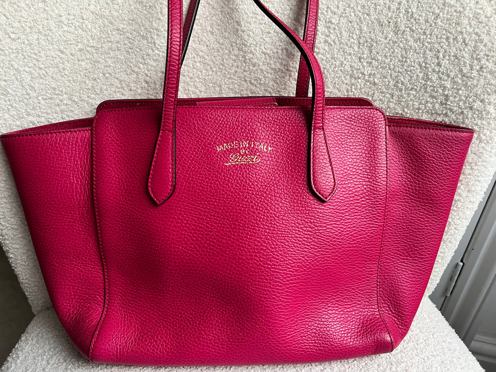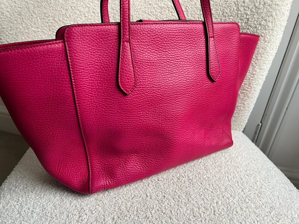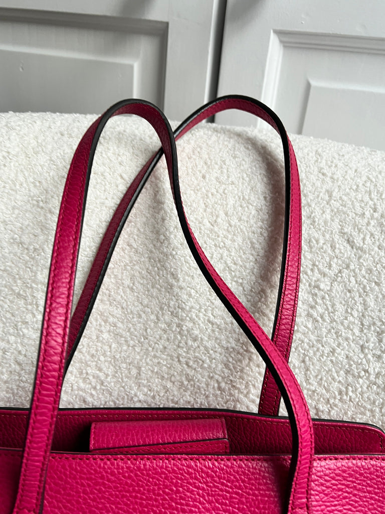 Gucci Swing Tote in pink grained calfskin with pale gold hardware. Medium and reasonably roomy in size. Ideal day to day or work bag. Can be carried in the crook of the arm or over shoulder.